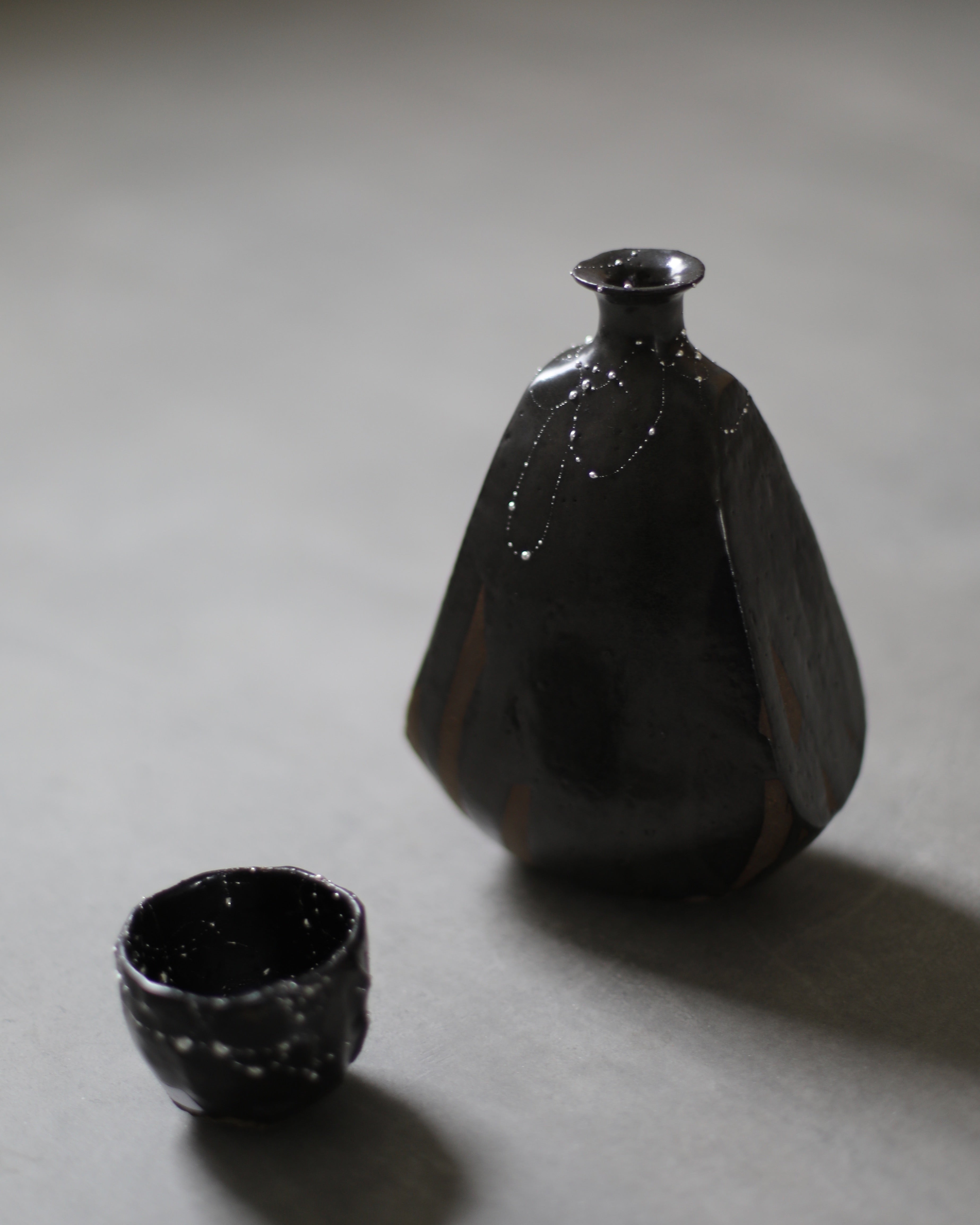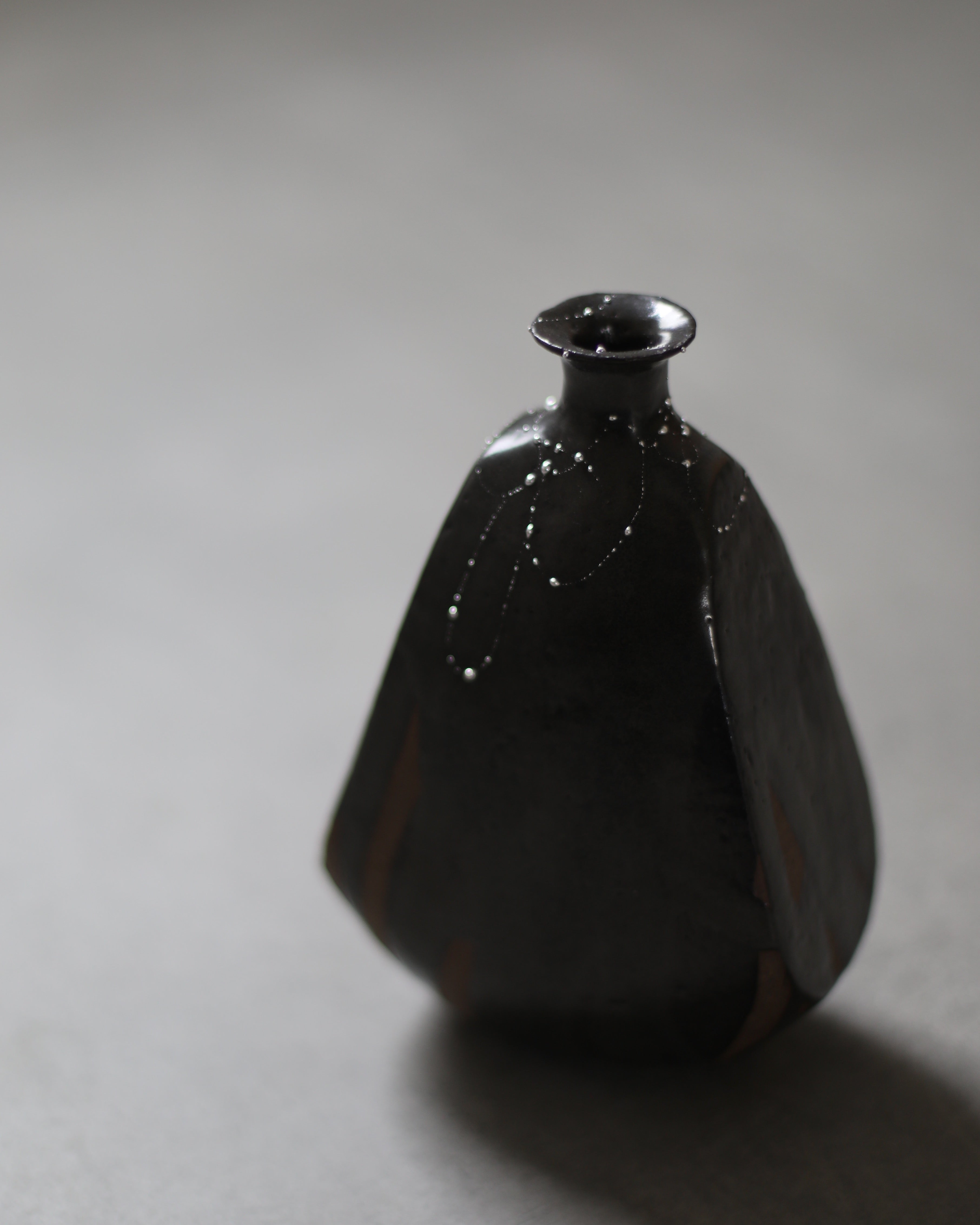 Materials: Stoneware, an iron black glaze and laced silver droplets