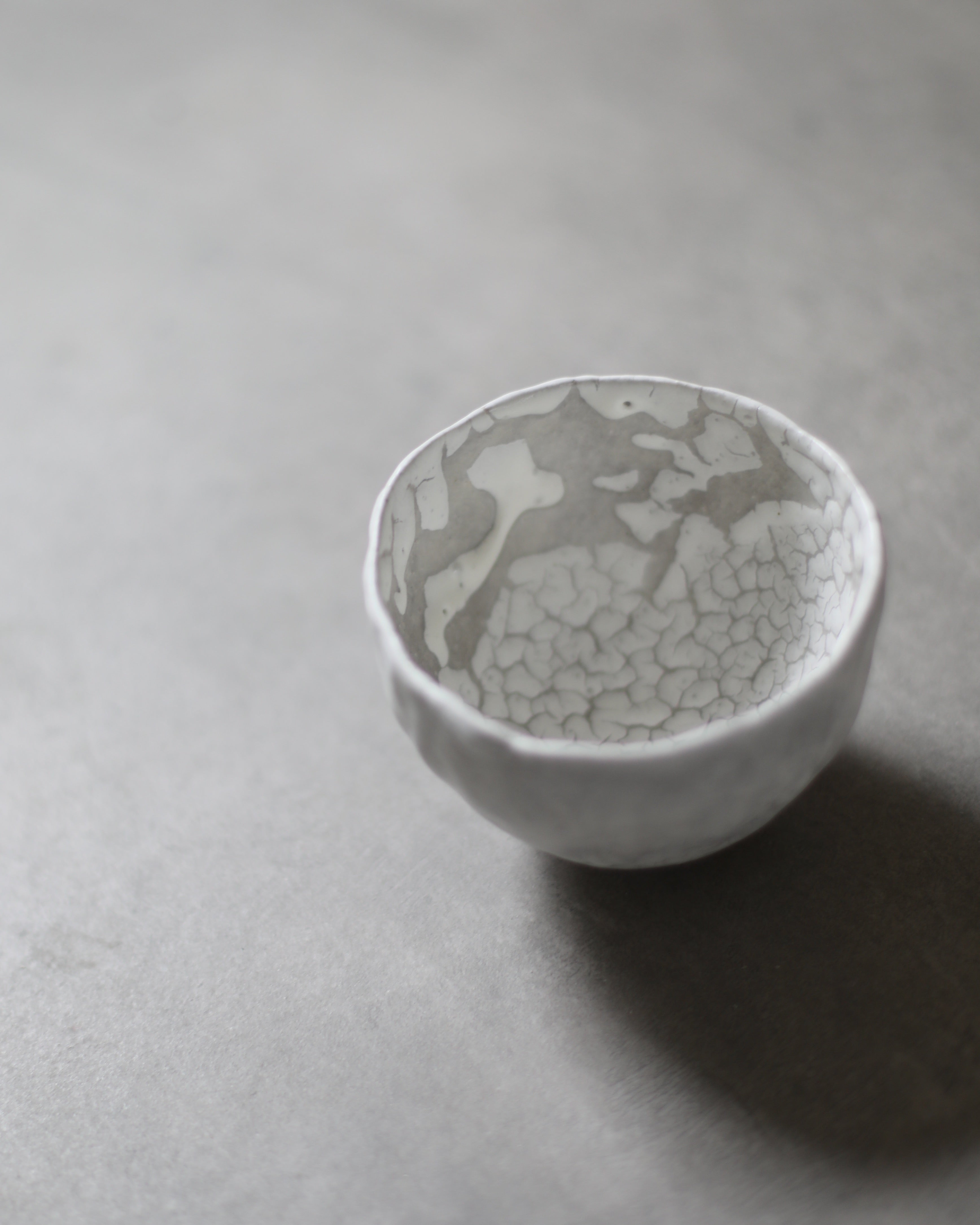 Carved from a stoneware body and glazed in a snow glaze, this tea bowl elegantly balances complex textures with a finely sculpted jaggedness, reflecting the artist’s interest in natural geomorphic forms and textures.