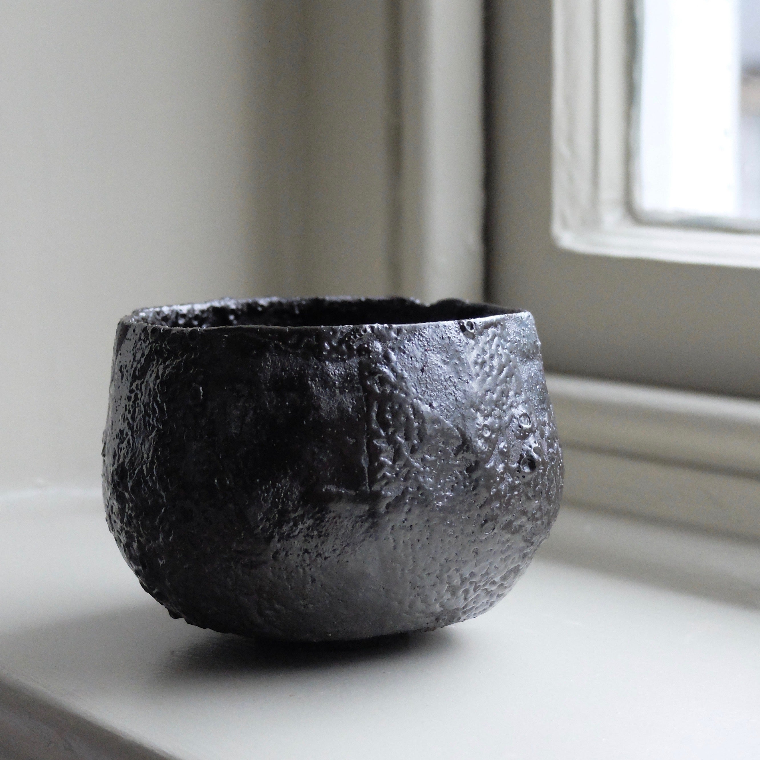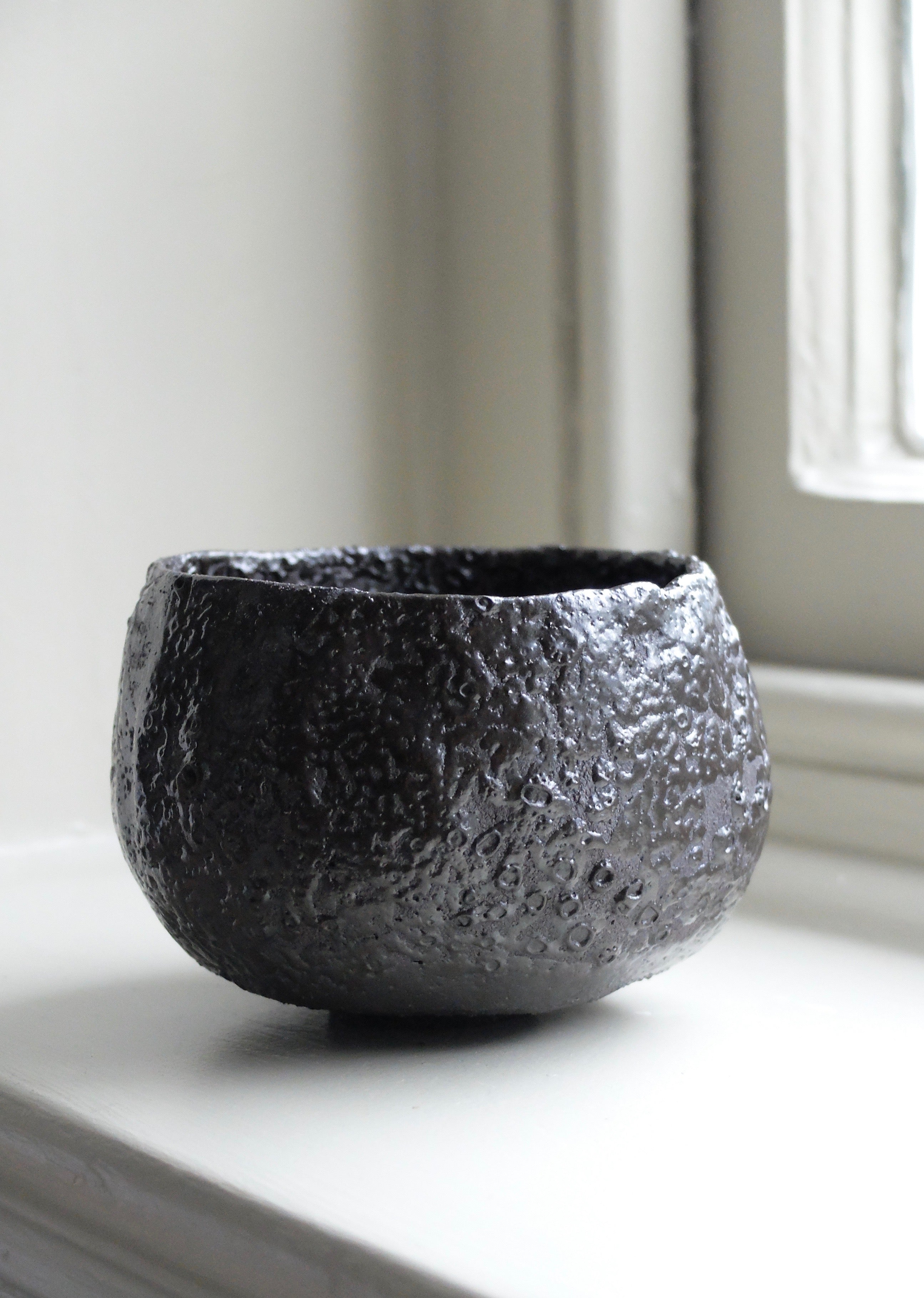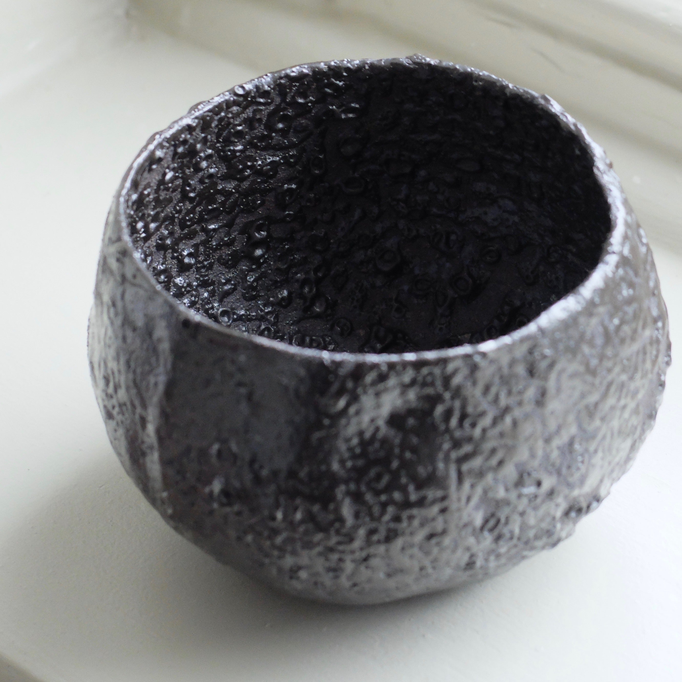 The beautiful decorative tea bowl is finely handcrafted by artist Annette Lindenberg using kurinuki, the traditional Japanese technique of carving from a single block of clay. Linderberg uses a variation of her yakisugi glaze on black clay to create a gentle crater-like effect across a rough textured volcanic body. The dark glaze captures a sense of dynamism with its bubbling porous texture and its application of streaks running down the interior of the bowl, capturing the liquid movement of glaze before firing.
