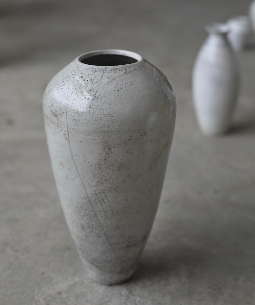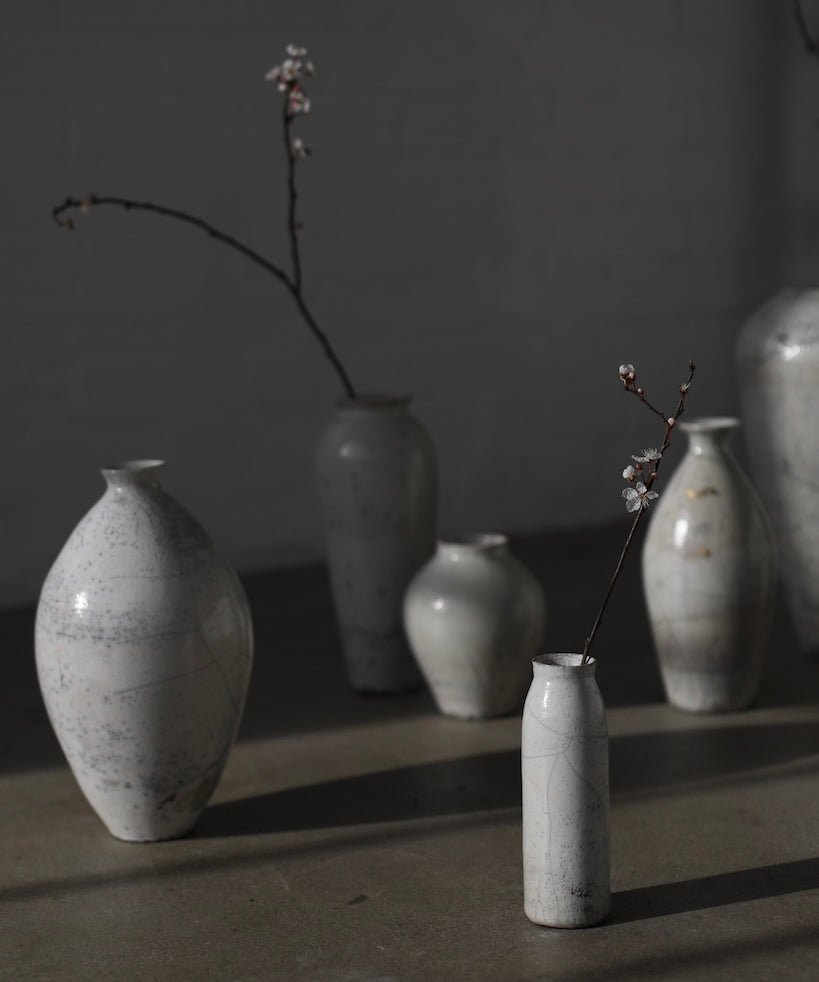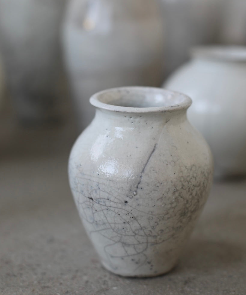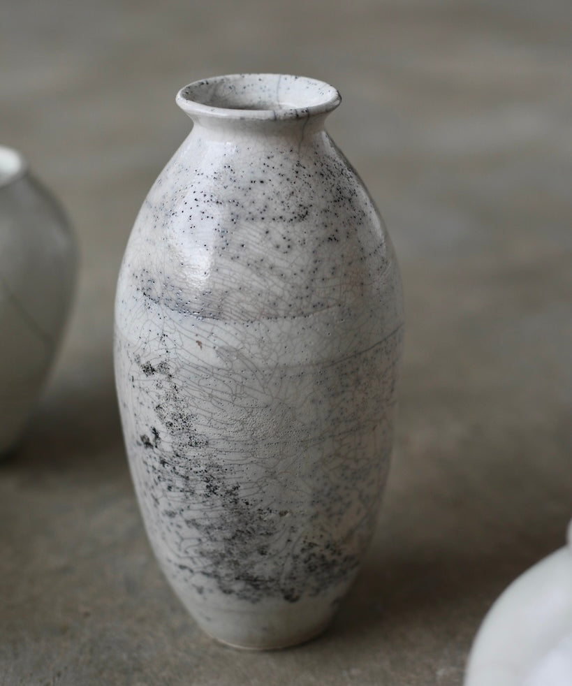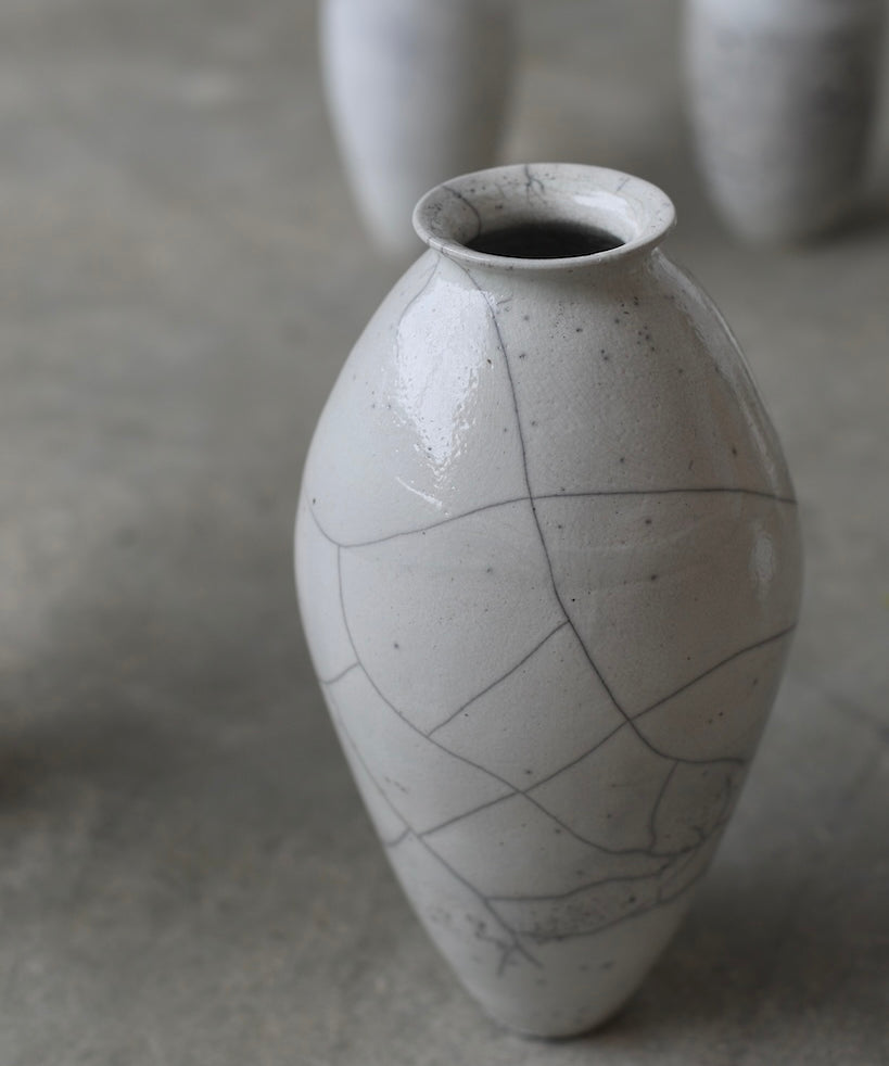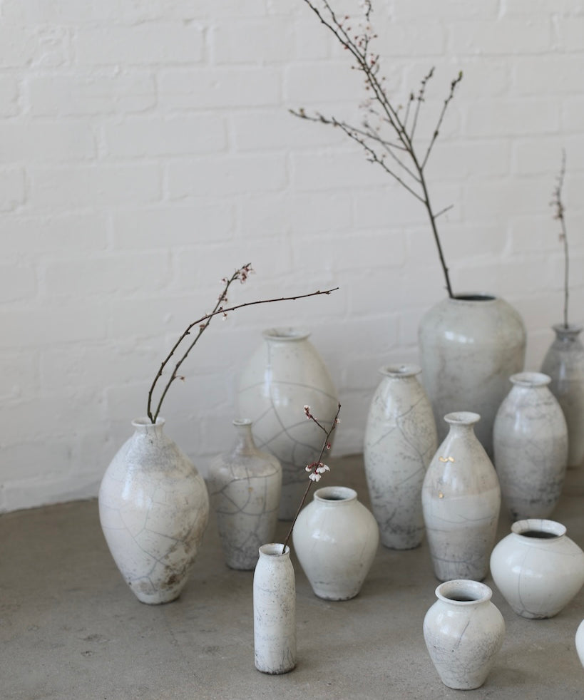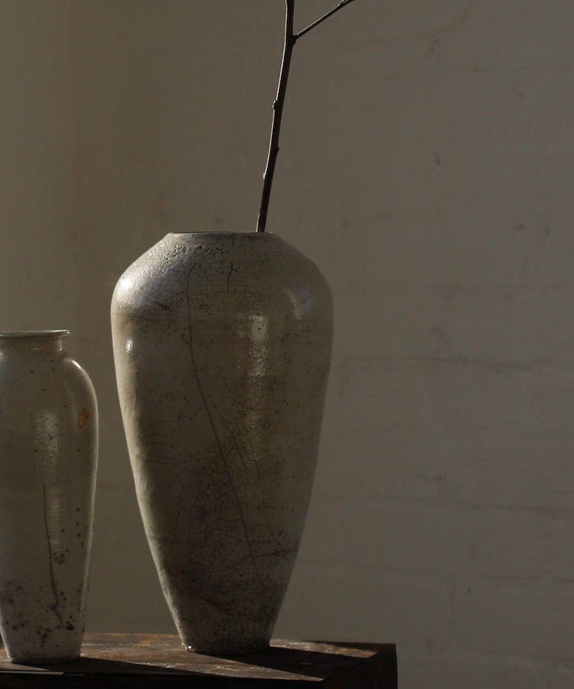 Rhona Frances is a ceramic artist based on the south coast of Cornwall, specialising in minimalist vessels with soft, feminine forms. Working with stoneware clay, Frances builds each piece slowly using the hand-building technique of coiling, allowing form to evolve through quiet repetition. Central to her practice, and in contrast to the calm, measured construction of her vessels, is the raku firing process; an inherently volatile and unpredictable method. The resulting crackle surfaces act as delicate records of fire, smoke, and transformation. The philosophy of non-attachment is fundamental to Frances’s work; some vessels are lost during firing, and this acceptance of fragility has become an integral part of her artistic outlook.