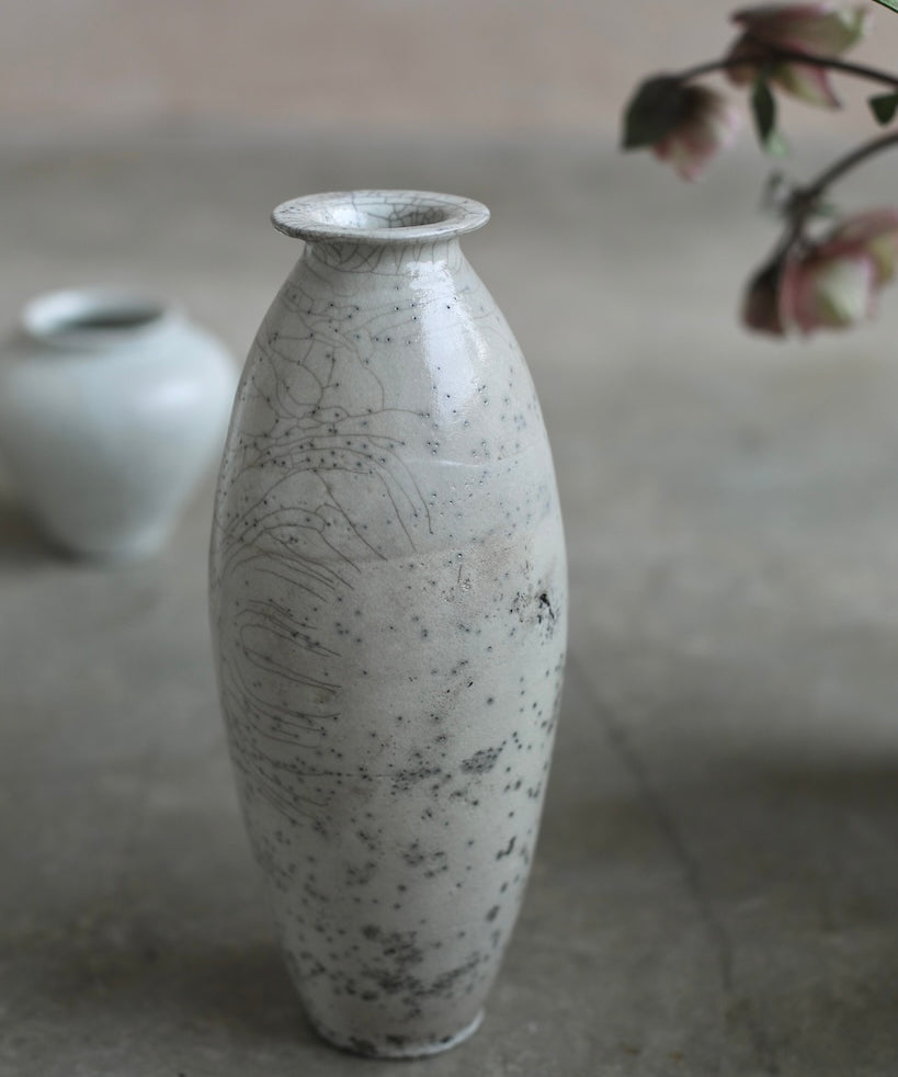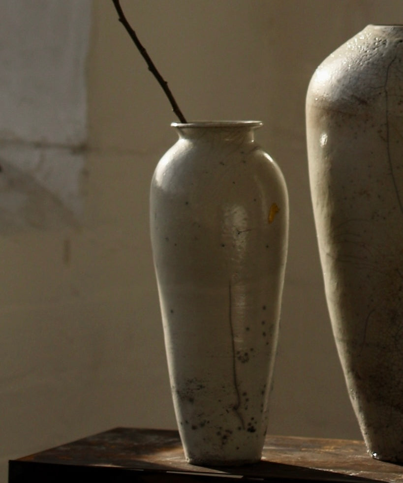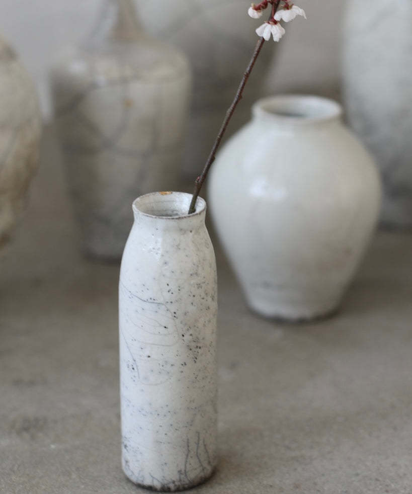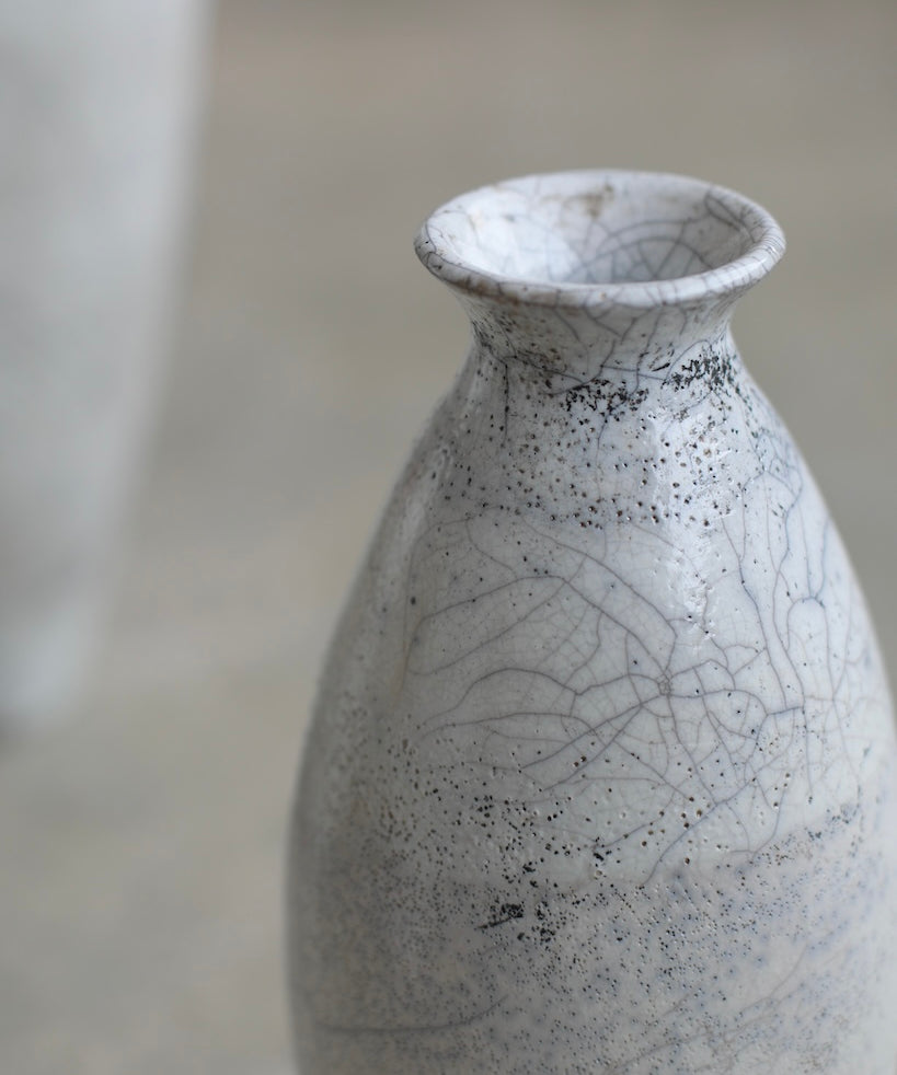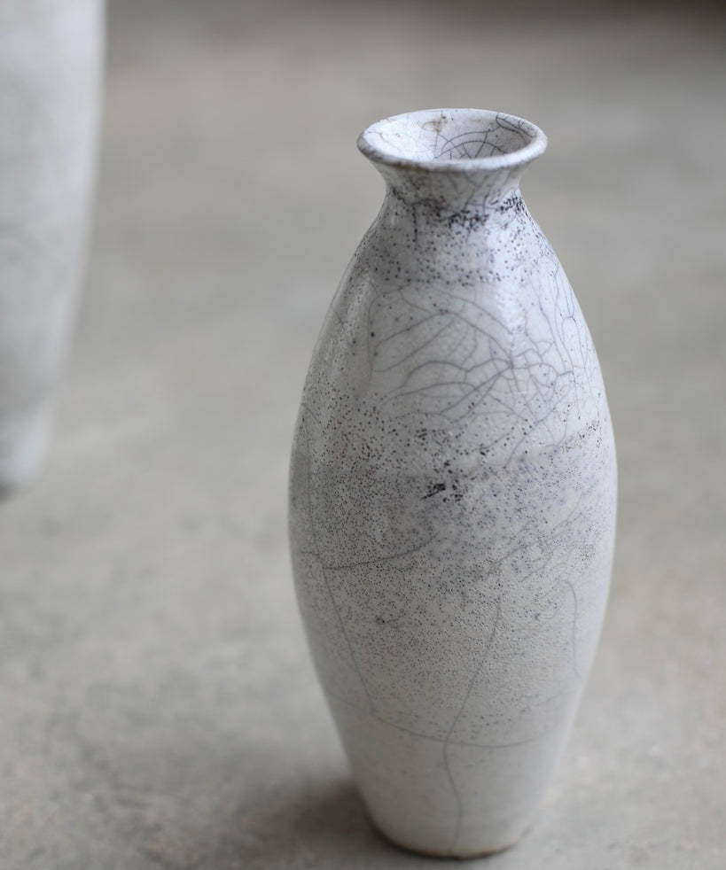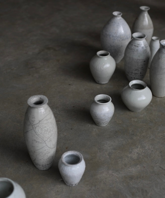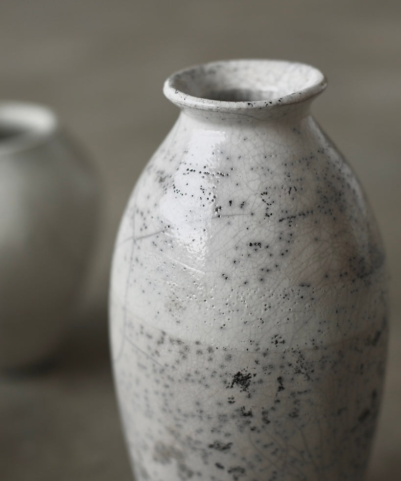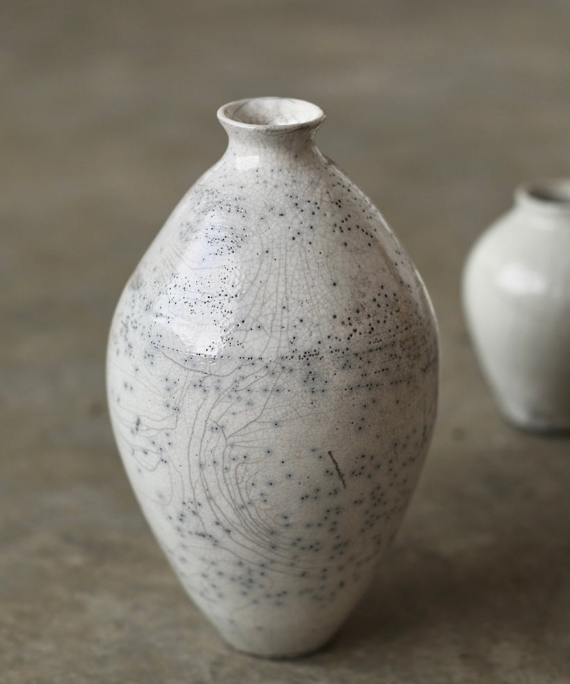 Rhona Frances is a ceramic artist based on the south coast of Cornwall, specialising in minimalist vessels with soft, feminine forms. Working with stoneware clay, Frances builds each piece slowly using the hand-building technique of coiling, allowing form to evolve through quiet repetition. Central to her practice, and in contrast to the calm, measured construction of her vessels, is the raku firing process; an inherently volatile and unpredictable method. The resulting crackle surfaces act as delicate records of fire, smoke, and transformation. The philosophy of non-attachment is fundamental to Frances’s work; some vessels are lost during firing, and this acceptance of fragility has become an integral part of her artistic outlook.