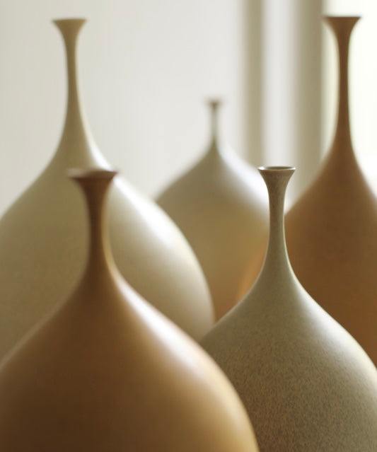 Sophie’s practice has developed from the original bottle to include pod and teardrop shapes. It is clear to see the shift in Sophie’s inspiration, from skyscrapers and towers, to a more general concern with form and simplicity. The elegant bottles and pods, with their extraordinary precision, are the result of a complex and extremely delicate process. During their creation, risks of cracking during carving and firing are so high that half of Sophie’s pieces are not completed. After being hand-thrown on the wheel and left to dry for two days, the works are refined through hand-carving. They are sprayed with an original glaze which Sophie has honed over the years she has been working with porcelain.