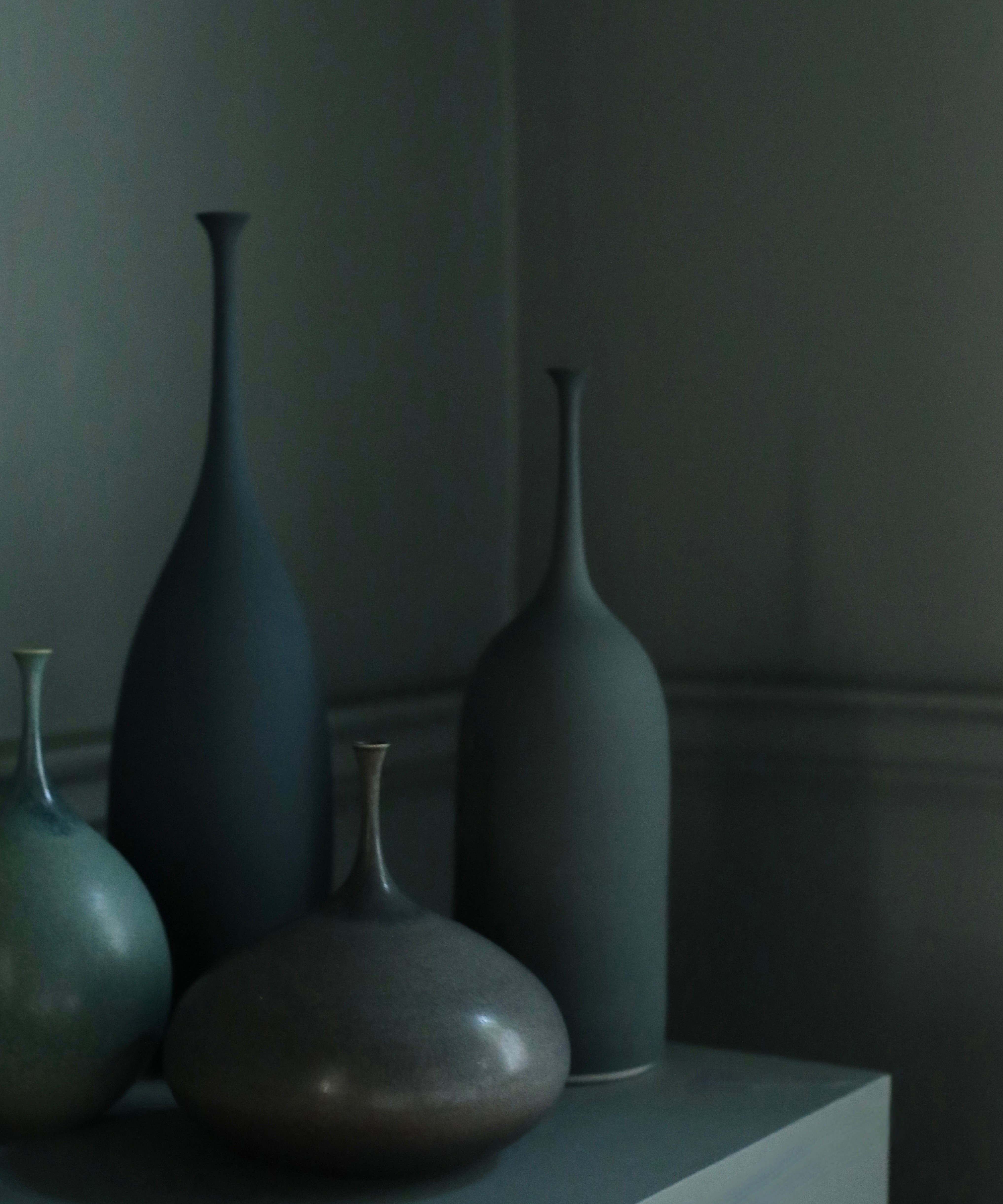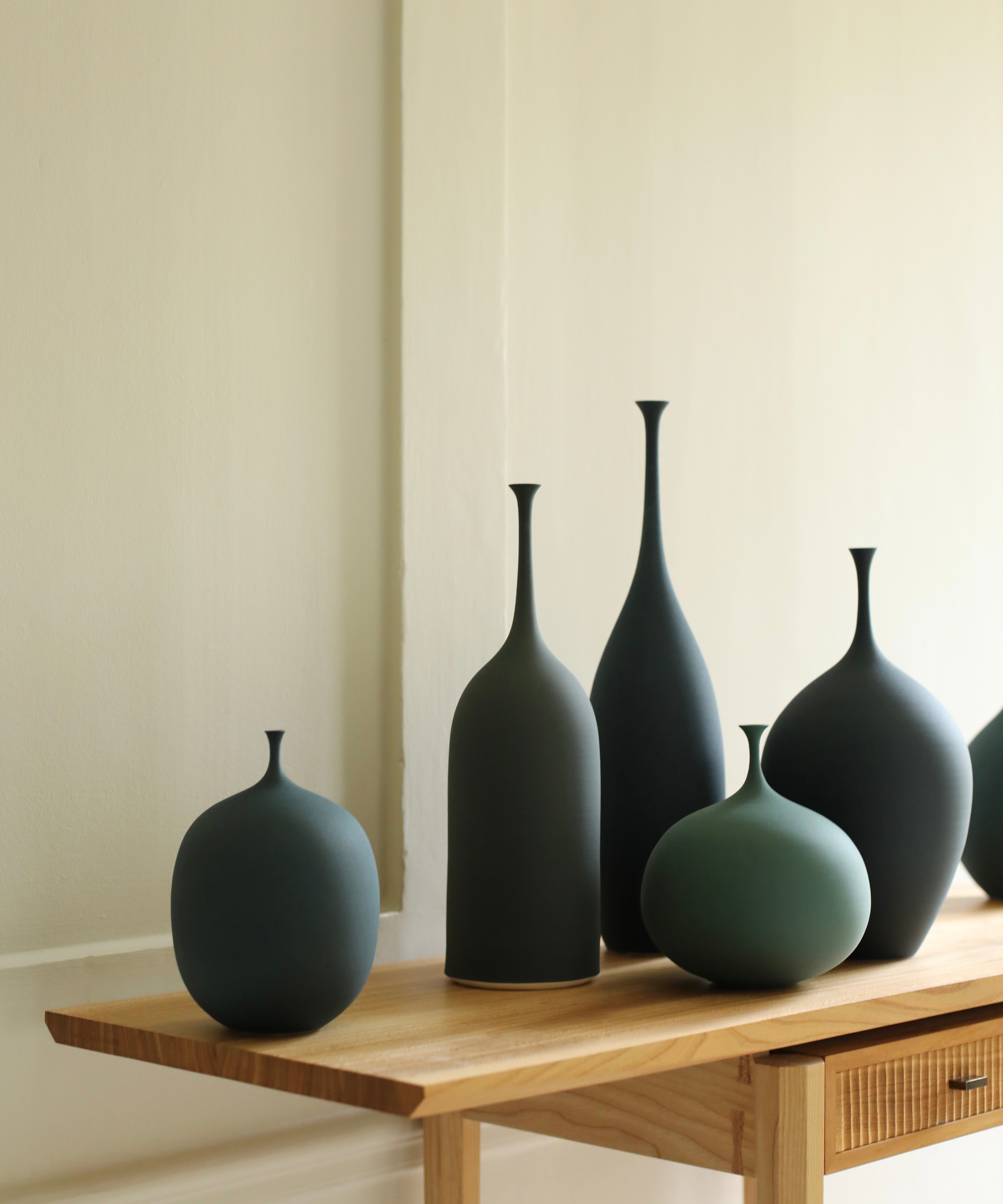 Sophie Cook’s beautifully distinctive approach to ceramics has been evident since she graduated from Camberwell School of Arts in 1997 with a series of bottles in varying shades of matt turquoise. The importance of colour in Sophie’s works originated in reaction to traditional ceramics, with glazes she deemed dull. Sophie now works with a huge variety of tones, which function more than merely as surface decoration, and are integral to Sophie’s designs. The most recent additions to Sophie’s tonal palette are earthy tones reminiscent of the Suffolk coast where she lives and works.