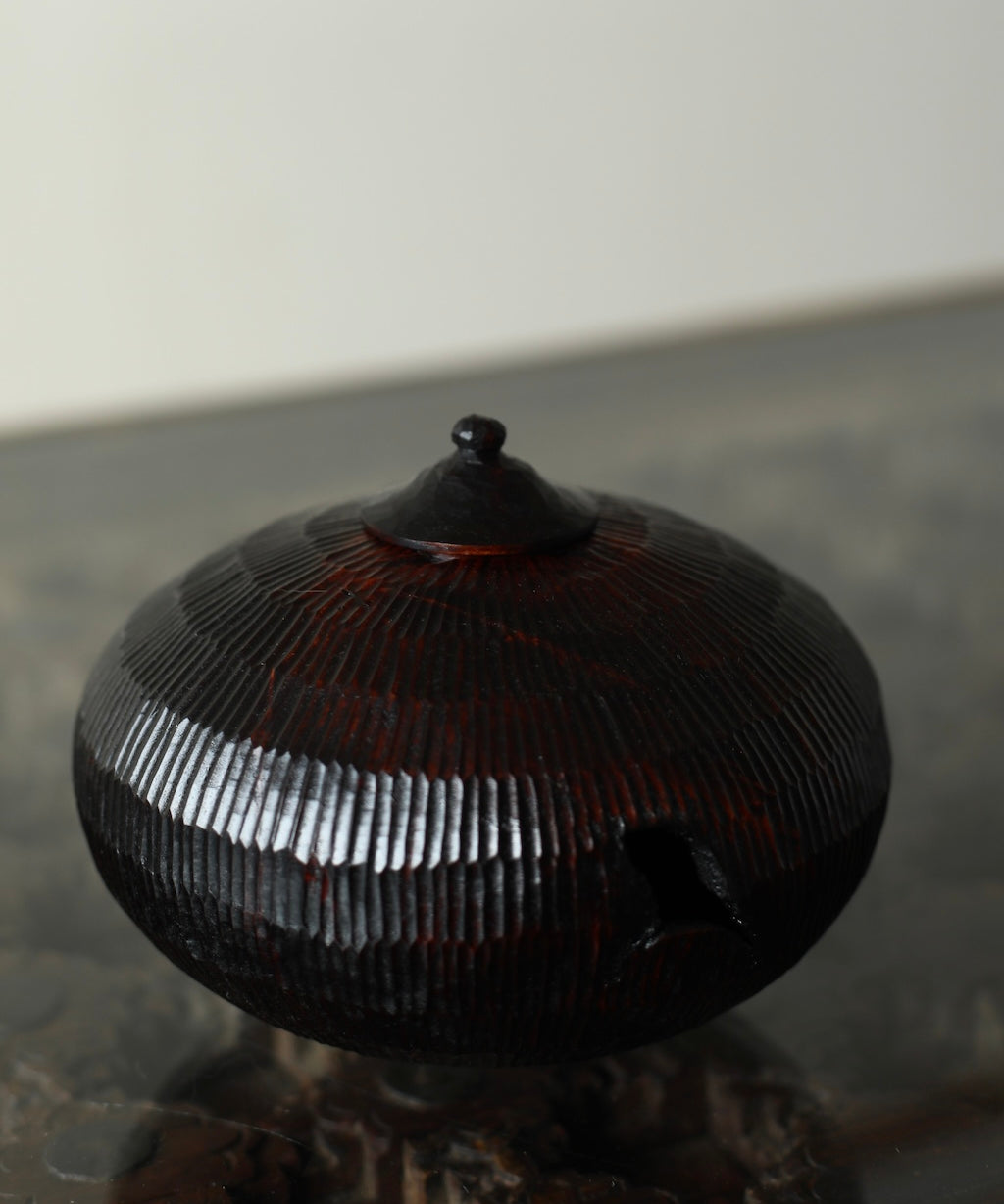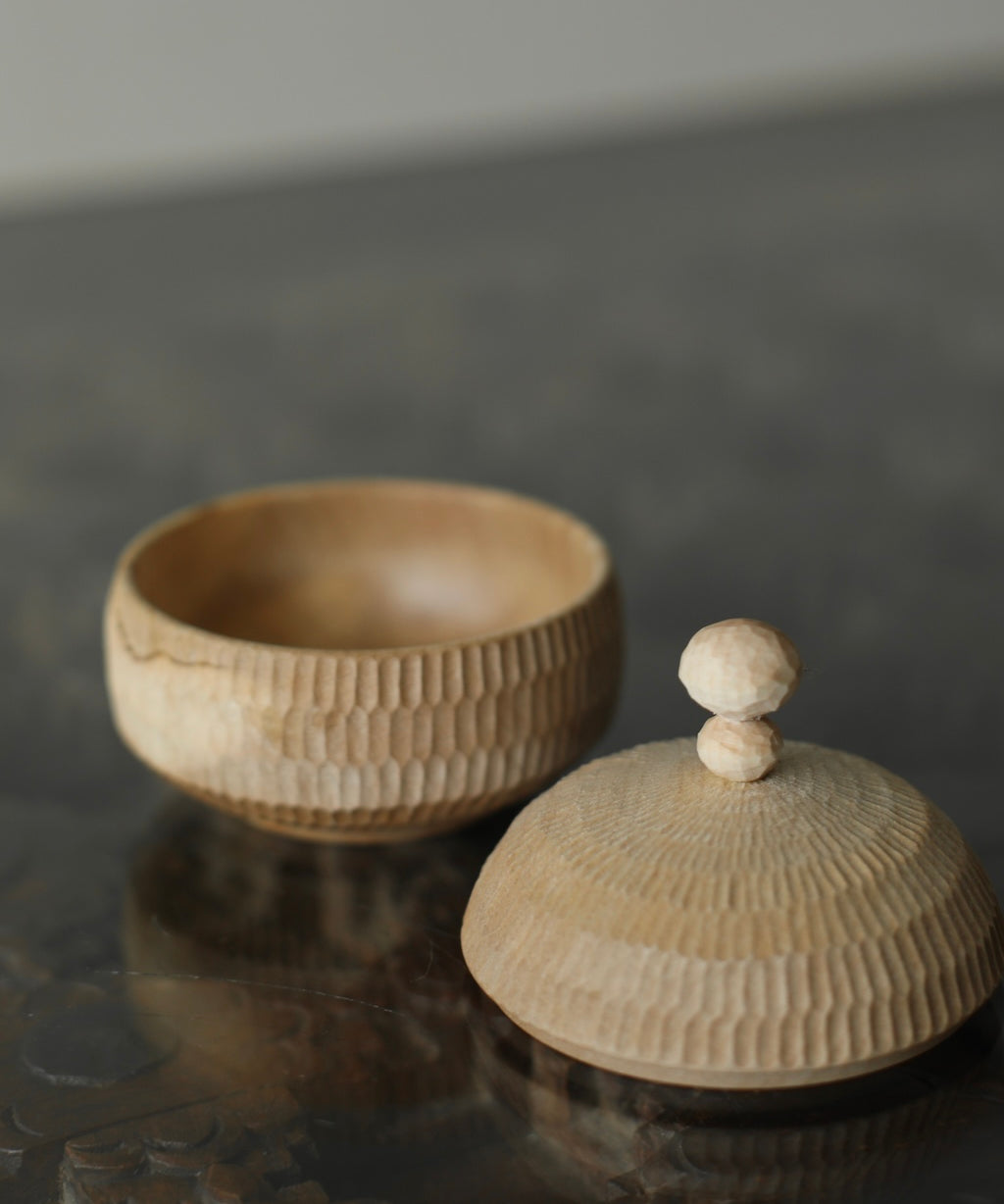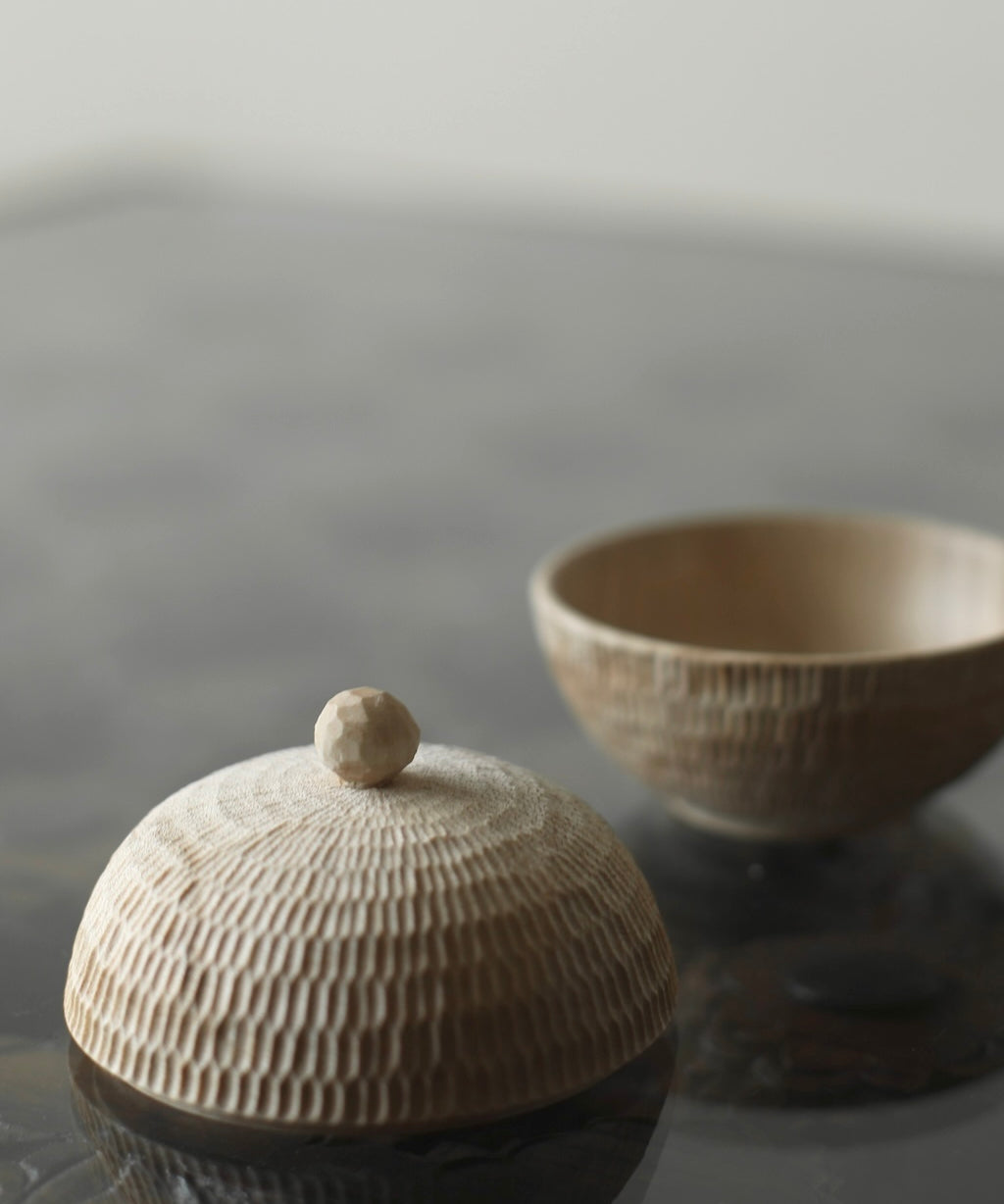 Takahashi McGil’s pieces are made from hardwoods sourced locally and through a combination of Japanese and Western techniques, traditions and tools. Originally, their pieces were intended solely for personal use, but their company was happily formed in 2016. Their creations are made through a collaborative process, with Mark woodturning and Kaori chiselling. Takahashi McGil’s production expanded to include lacquerware following a trip to Japan in 2018. They were introduced to urashi lacquering, which originates as tree sap, and makes objects waterproof as well as adding strength. The urashi lacquering process demands a meticulous approach, with the necessity of applying several layers of lacquer, as well as the perfect, humid temperature, for the lacquer to dry.
