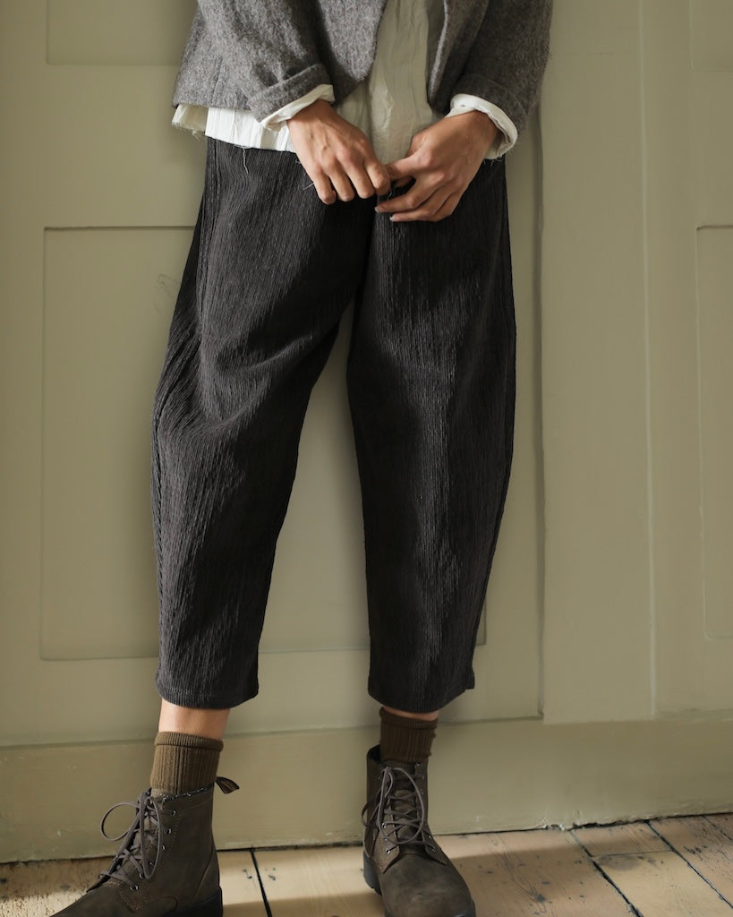 Soft warm griege cropped trousers in Japanese denim, cut with a tapered leg and a loose, easy fit. With discrete side and back pockets, the mid-rise elasticated waistband offers relaxed structure, while the silhouette remains elegant, versatile, and quietly timeless.About the artist: