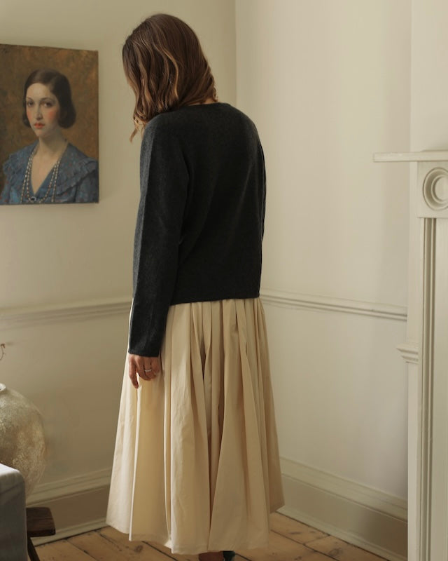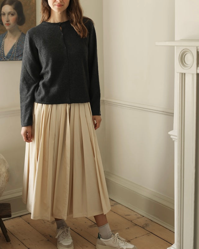 A soft and elegant cardigan crafted from a luxurious blend of silk, cashmere, and alpaca. Designed with a feminine round neckline and delicate buttons along the front, it has a loose straight fit that drapes effortlessly. Lightweight yet warm, it’s a timeless layer for refined everyday comfort.About the artist: