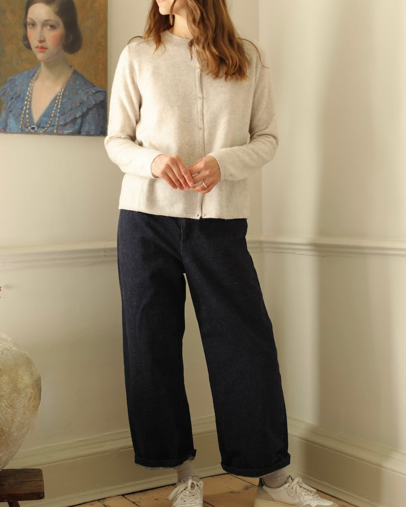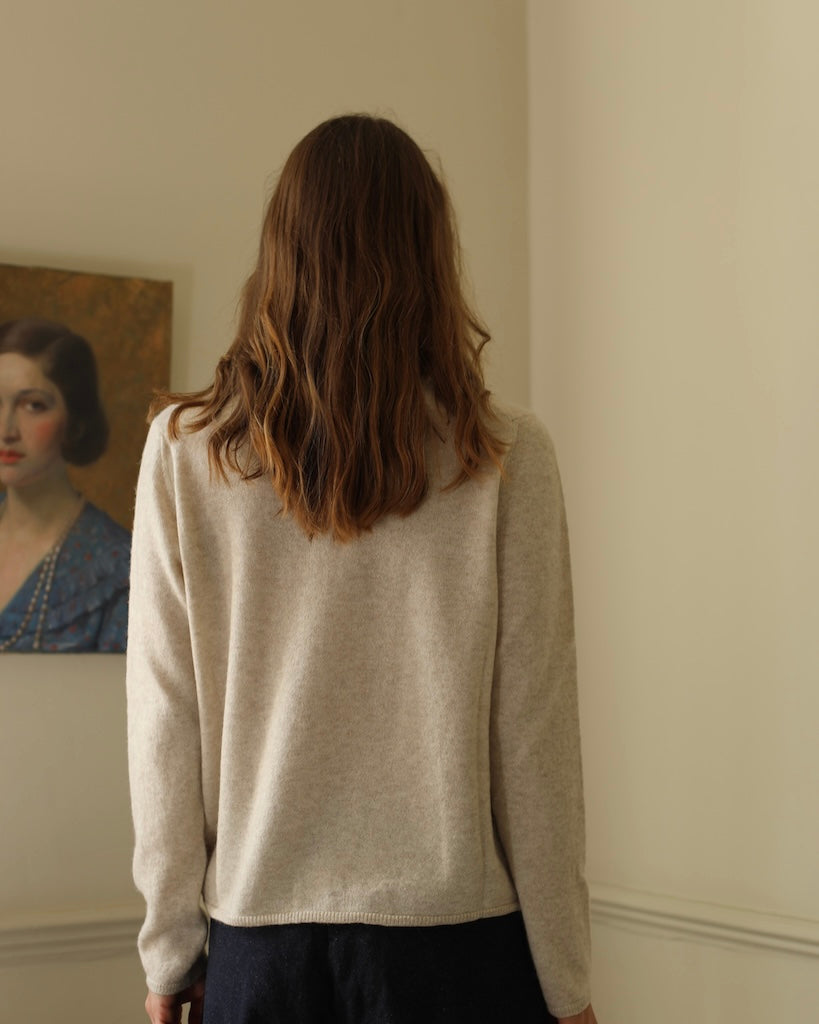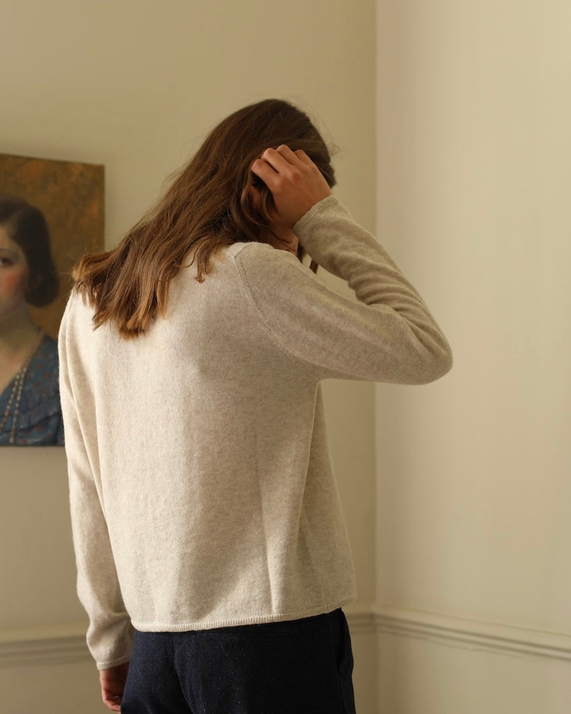 A soft and elegant cardigan crafted from a luxurious blend of silk, cashmere, and alpaca. Designed with a feminine round neckline and delicate buttons along the front, it has a loose straight fit that drapes effortlessly. Lightweight yet warm, it’s a timeless layer for refined everyday comfort.About the artist: