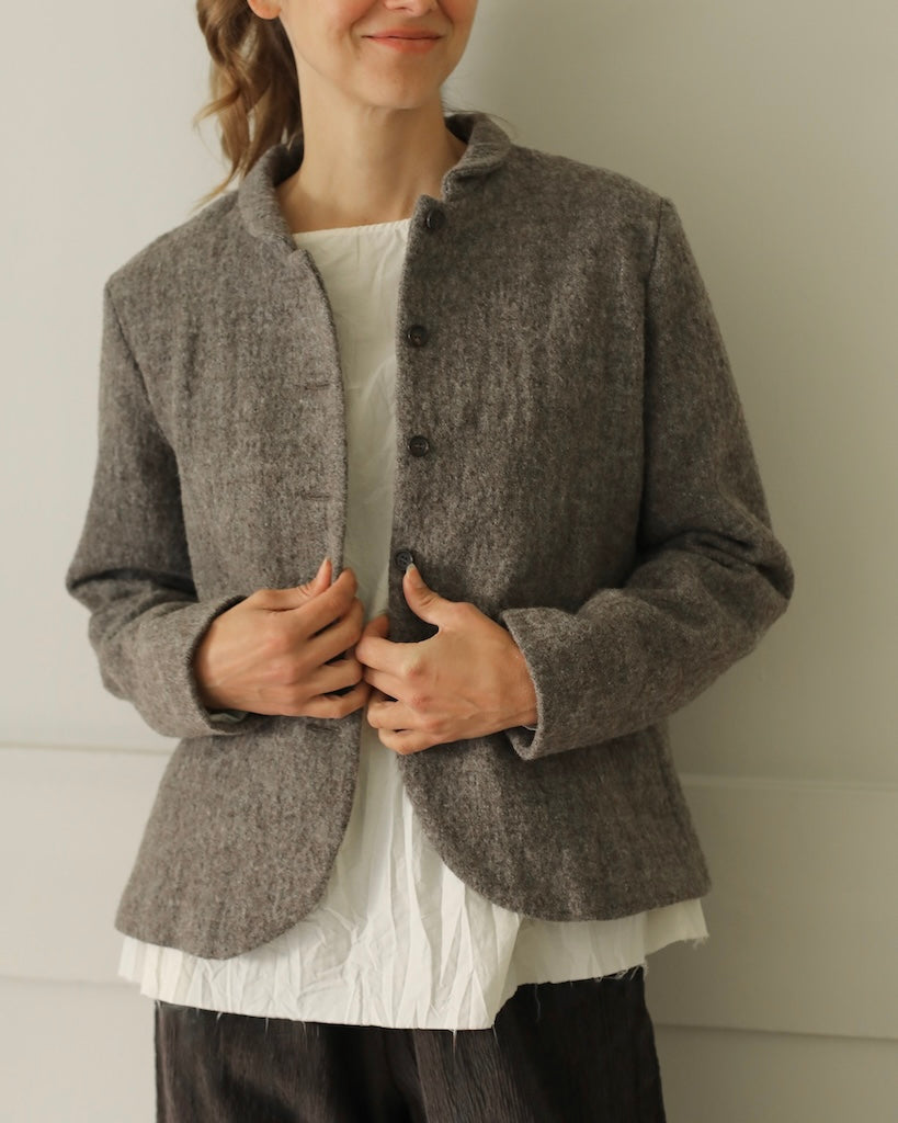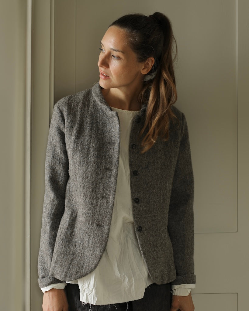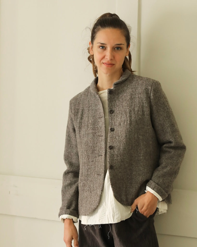 A beautifully tailored jacket that balances warmth with elegance, designed with a softly rounded opening and a refined Peter Pan collar. Thoughtful details, from the neat button fastening and subtle shaping of the silhouette, to Its crisp off-white lining that offers a striking contrast to the timeless, textured exterior in a wool and linen blend, create a dialogue between texture and tone. Both practical and graceful, it is a piece that feels at once modern and enduring.About the artist: