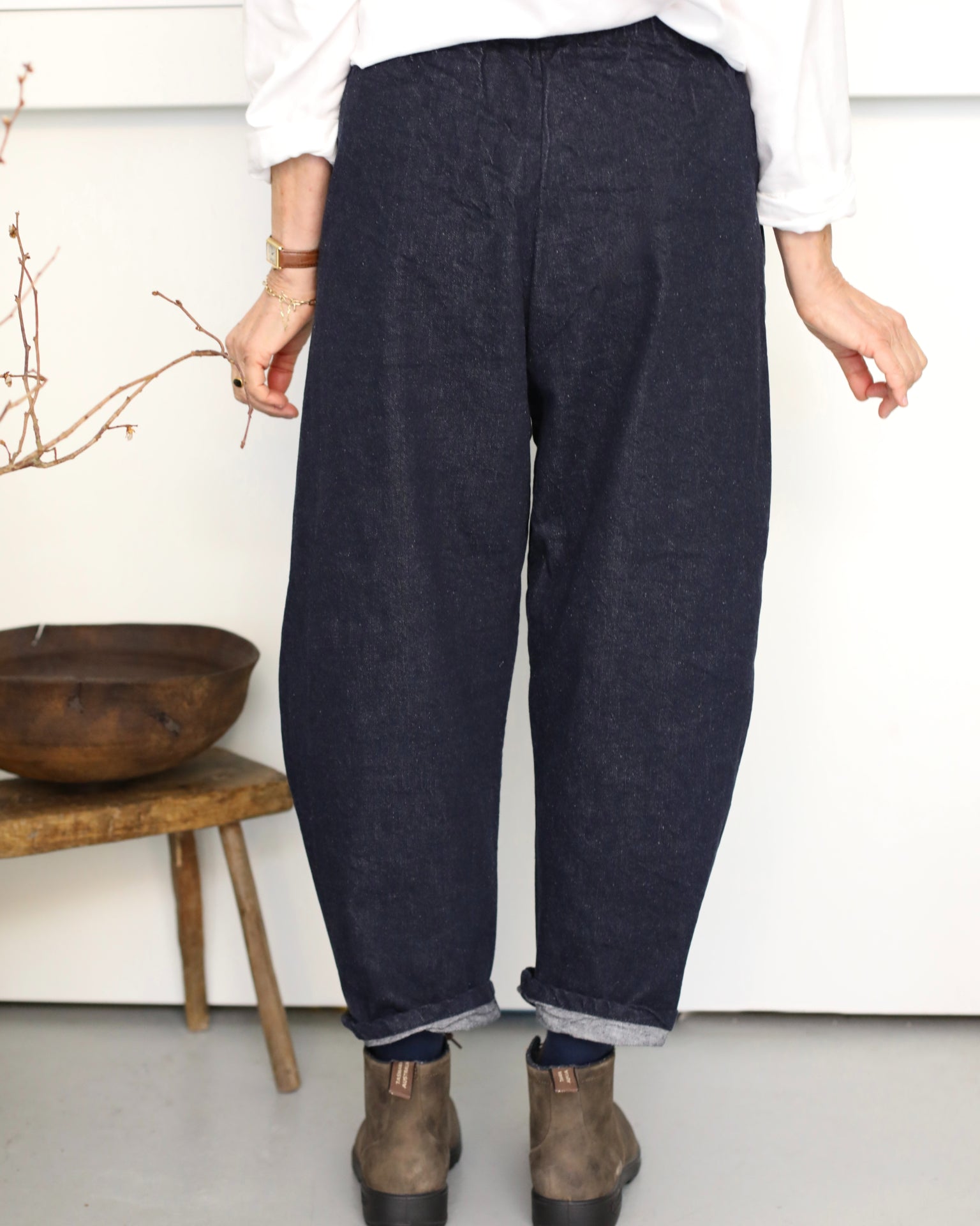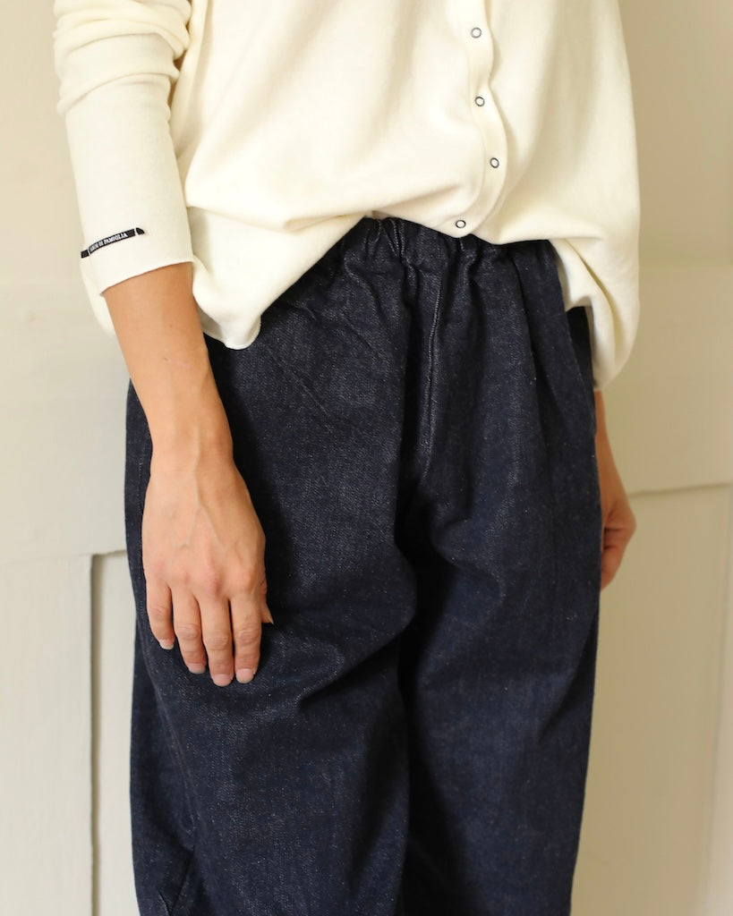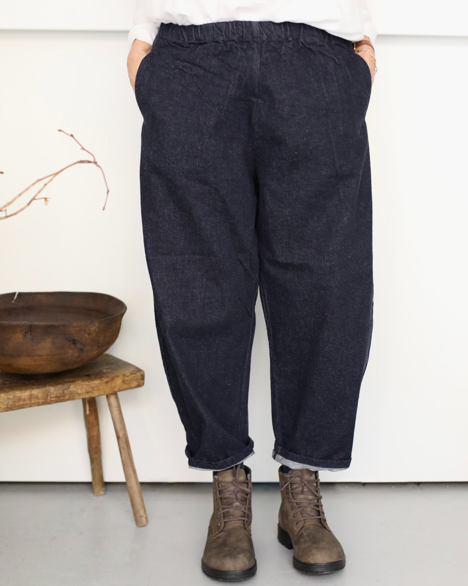 Crafted from 100% heavy cotton Japanese denim that softens beautifully with time, these indigo cropped trousers feature a stylish yet subtle barrel cut, and easy loose fit. Discreet side pockets and a mid-rise elasticated waistband provide relaxed structure, while the silhouette remains elegant, versatile, and quietly timeless.About the artist: