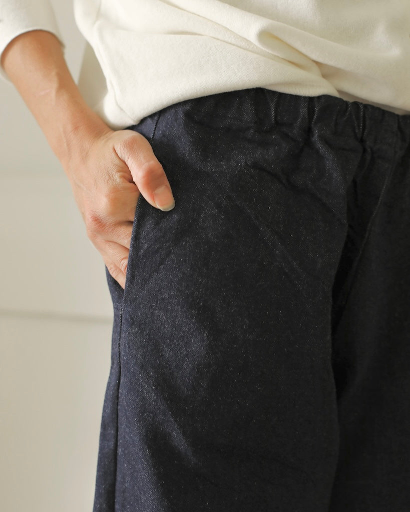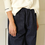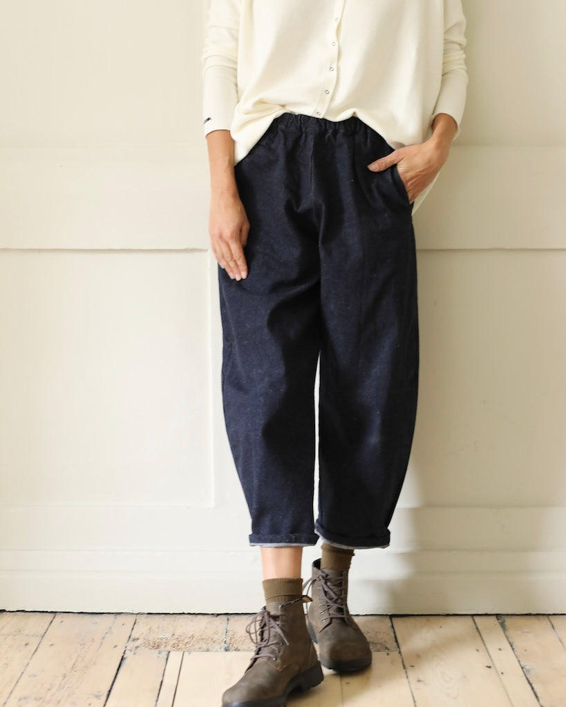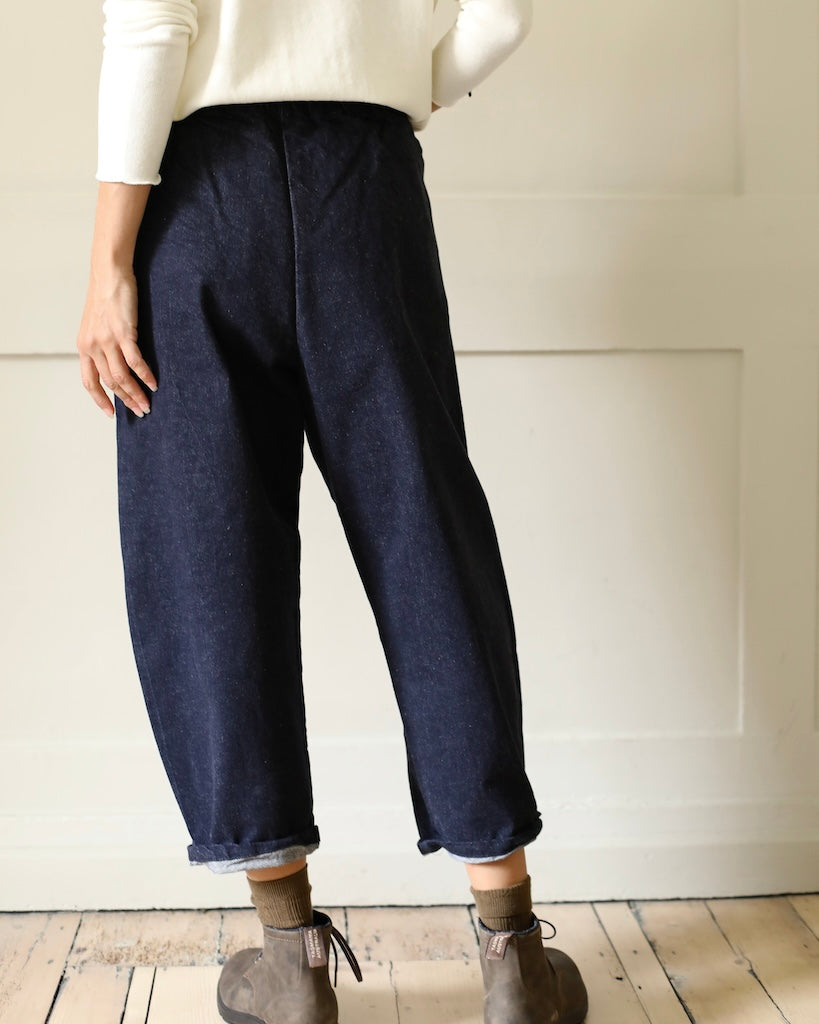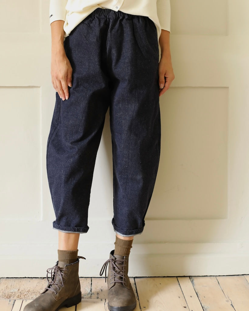 Crafted from 100% heavy cotton Japanese denim that softens beautifully with time, these indigo cropped trousers feature a stylish yet subtle barrel cut, and easy loose fit. Discreet side pockets and a mid-rise elasticated waistband provide relaxed structure, while the silhouette remains elegant, versatile, and quietly timeless.About the artist: