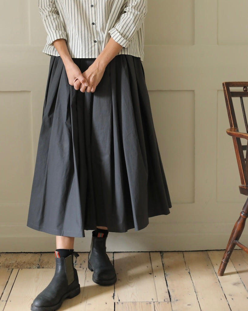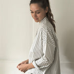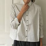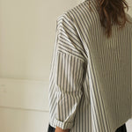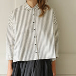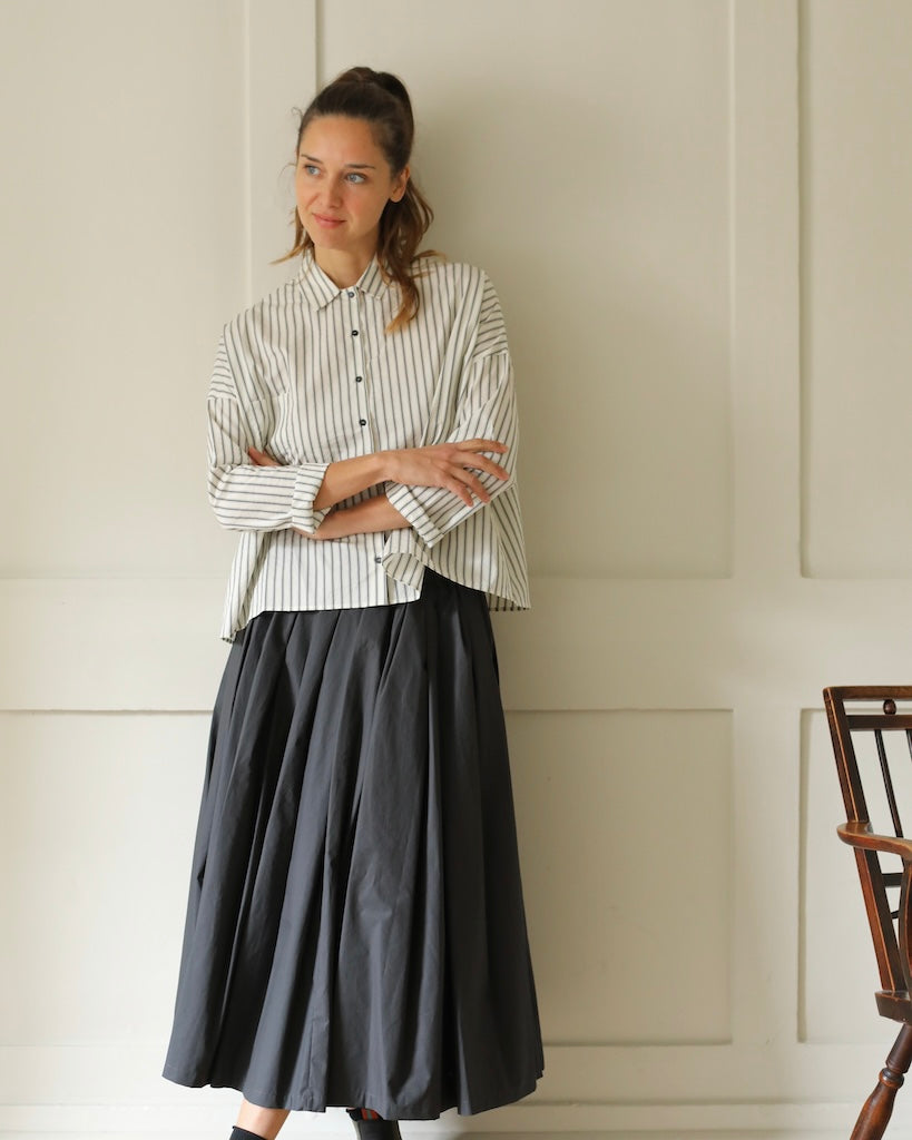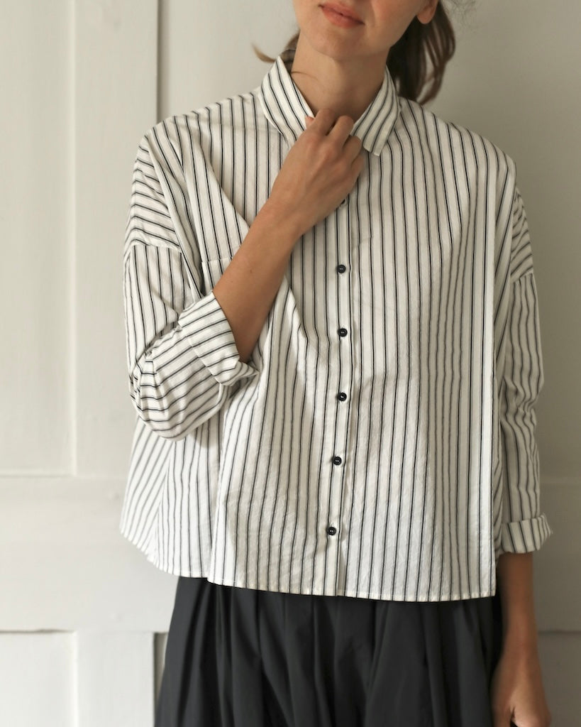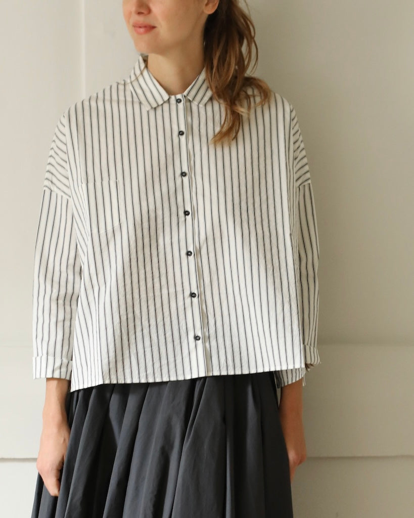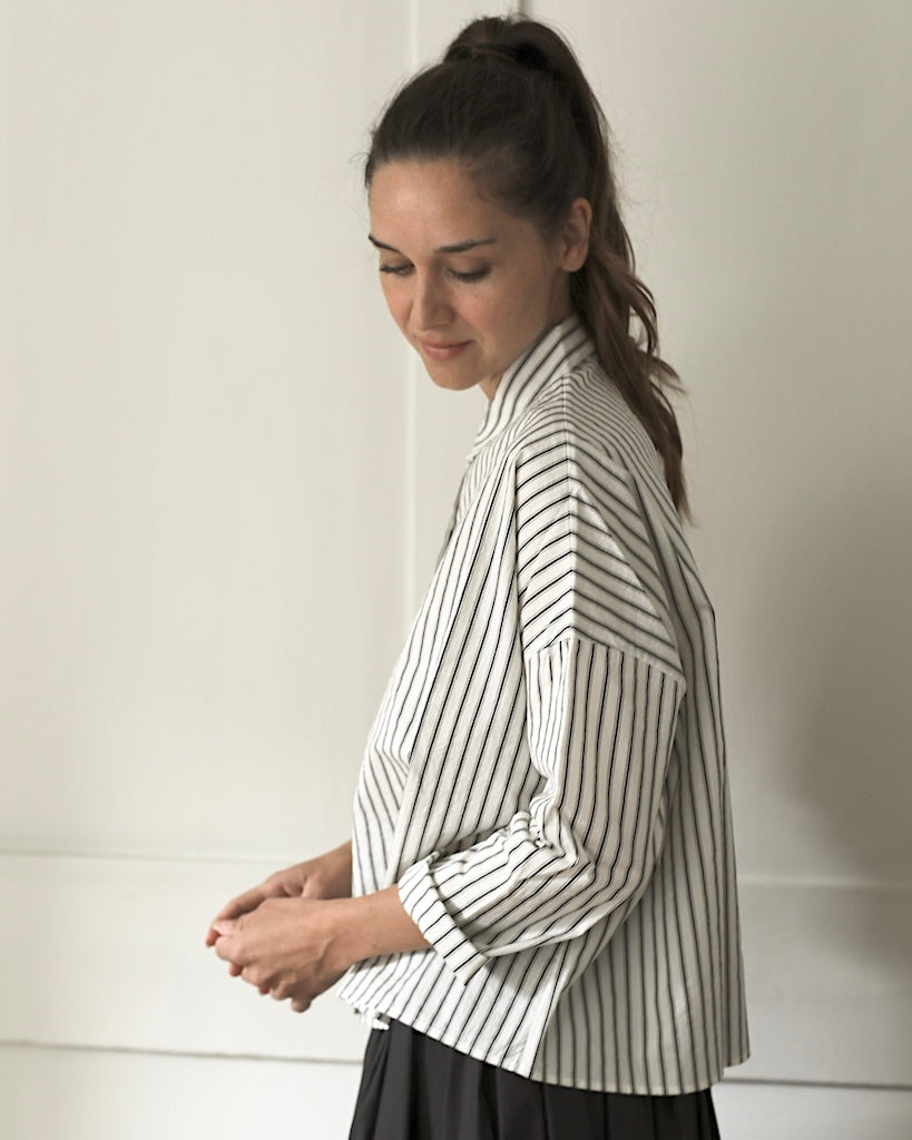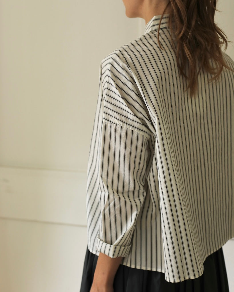 A cropped shirt perfect for layering, crafted from a light, crisp fabric with a subtle, timeless stripe. The tailored slim sleeves and Barrymore collar provide structure, while the wide, loose body drapes effortlessly for relaxed elegance. Button fastening and a miniature front pocket add thoughtful, refined details, making this a versatile piece that feels both modern and graceful.About the artist: