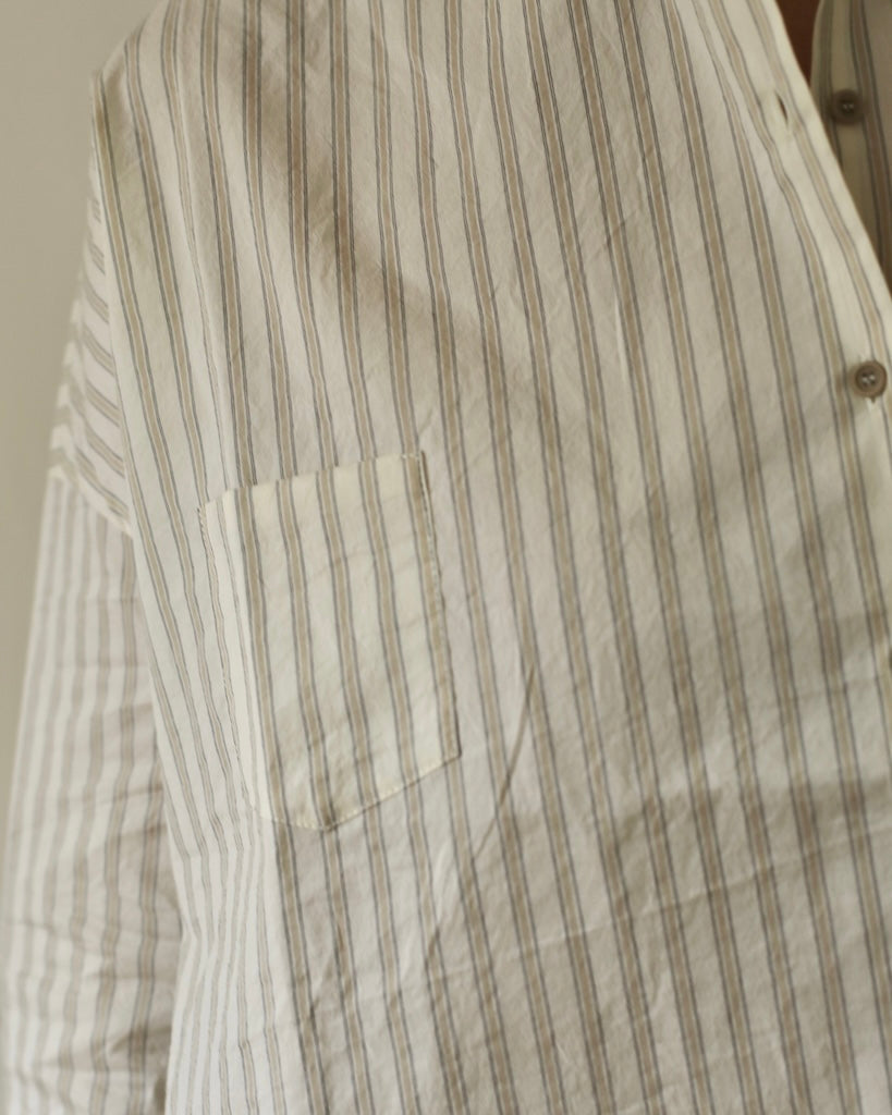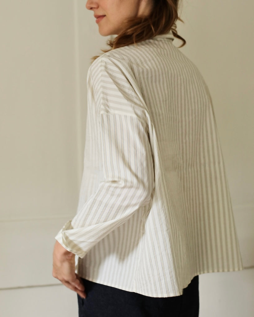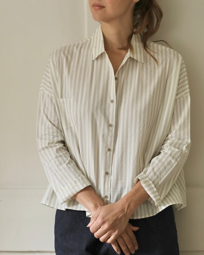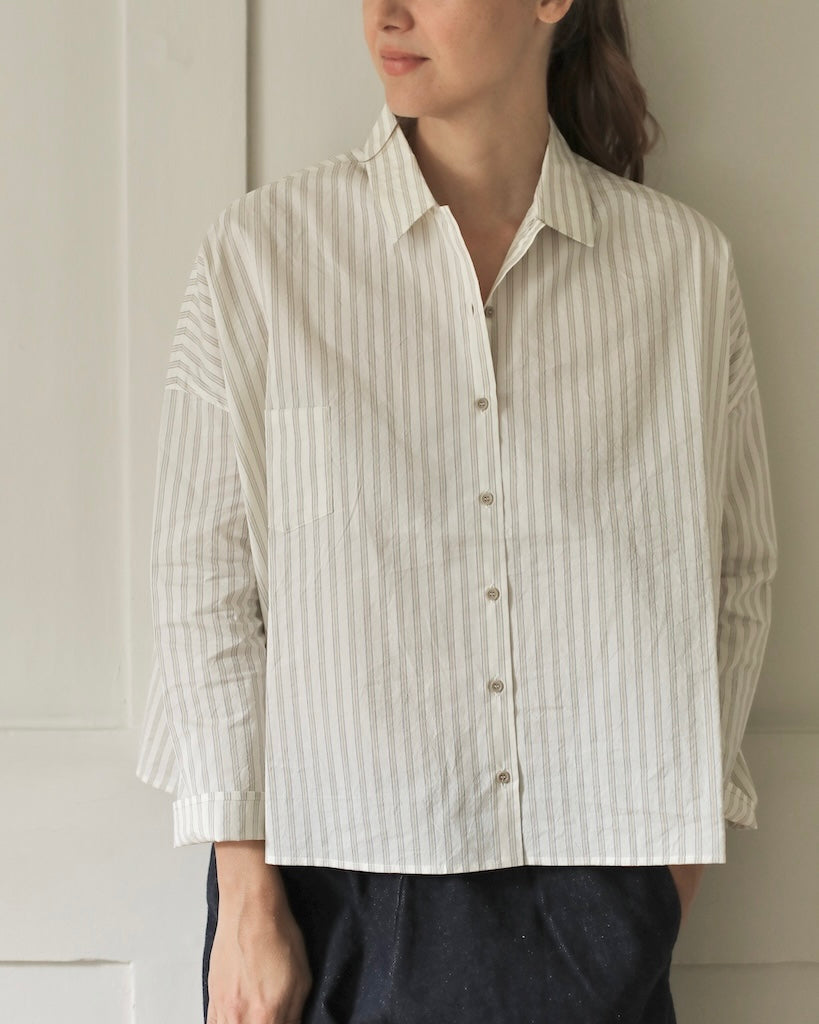 A cropped shirt perfect for layering, crafted from a light, crisp fabric with a subtle, timeless stripe. The tailored slim sleeves and Barrymore collar provide structure, while the wide, loose body drapes effortlessly for relaxed elegance. Button fastening and a miniature front pocket add thoughtful, refined details, making this a versatile piece that feels both modern and graceful.About the artist: