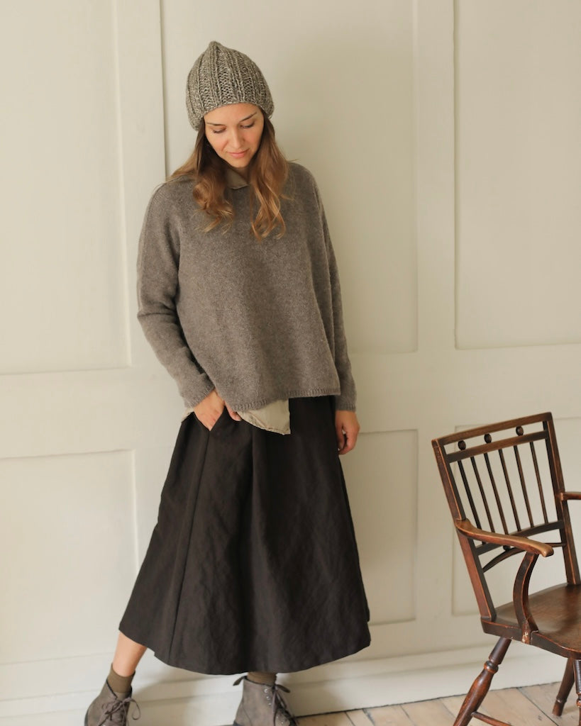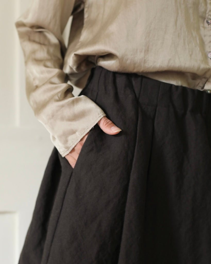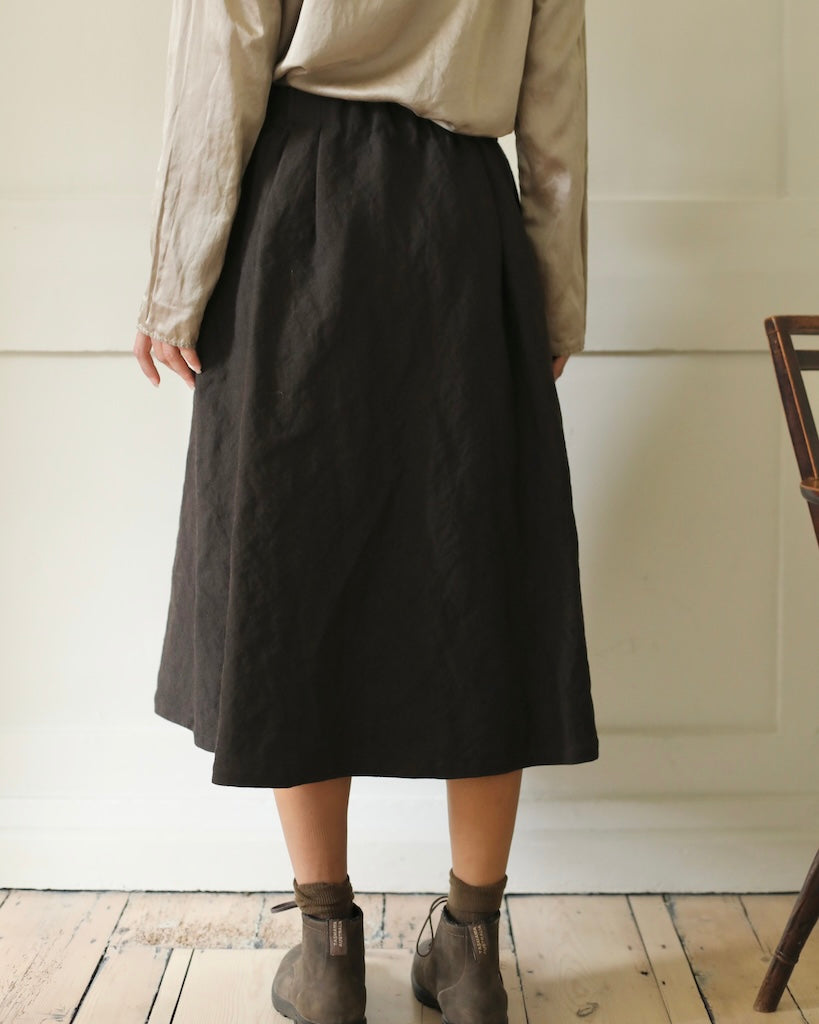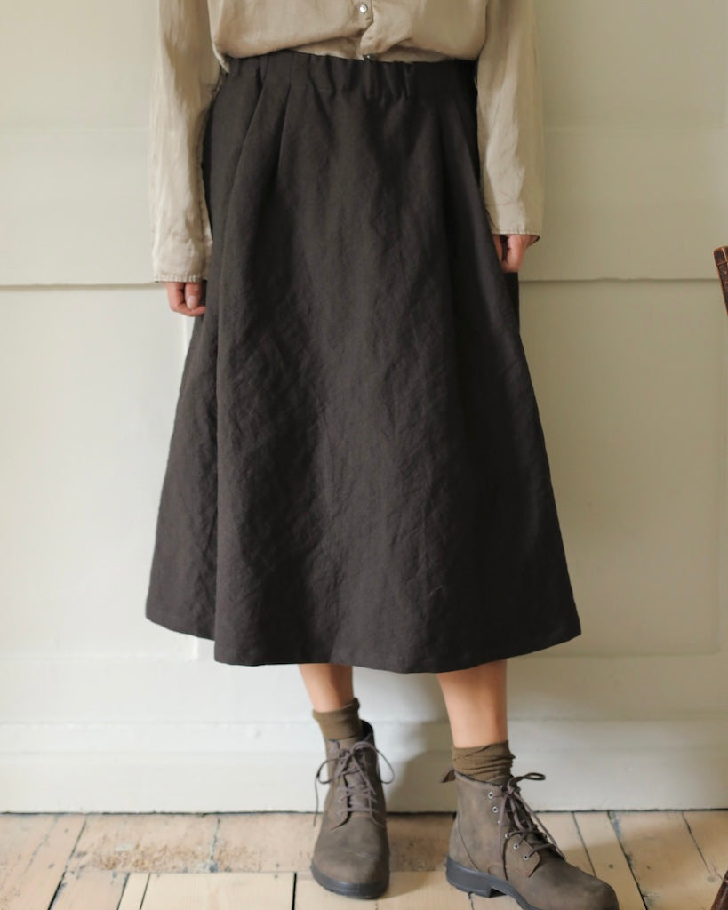 Crafted from a wool and cotton blend with a refined denim look in deep earthy brown, this skirt features an elegant straight A-line silhouette with front and back dart details. Designed for ease with an elastic waist and discreet side pockets, it blends structure with everyday sophistication.About the artist: