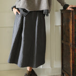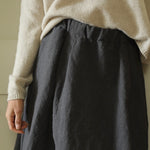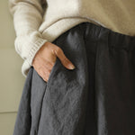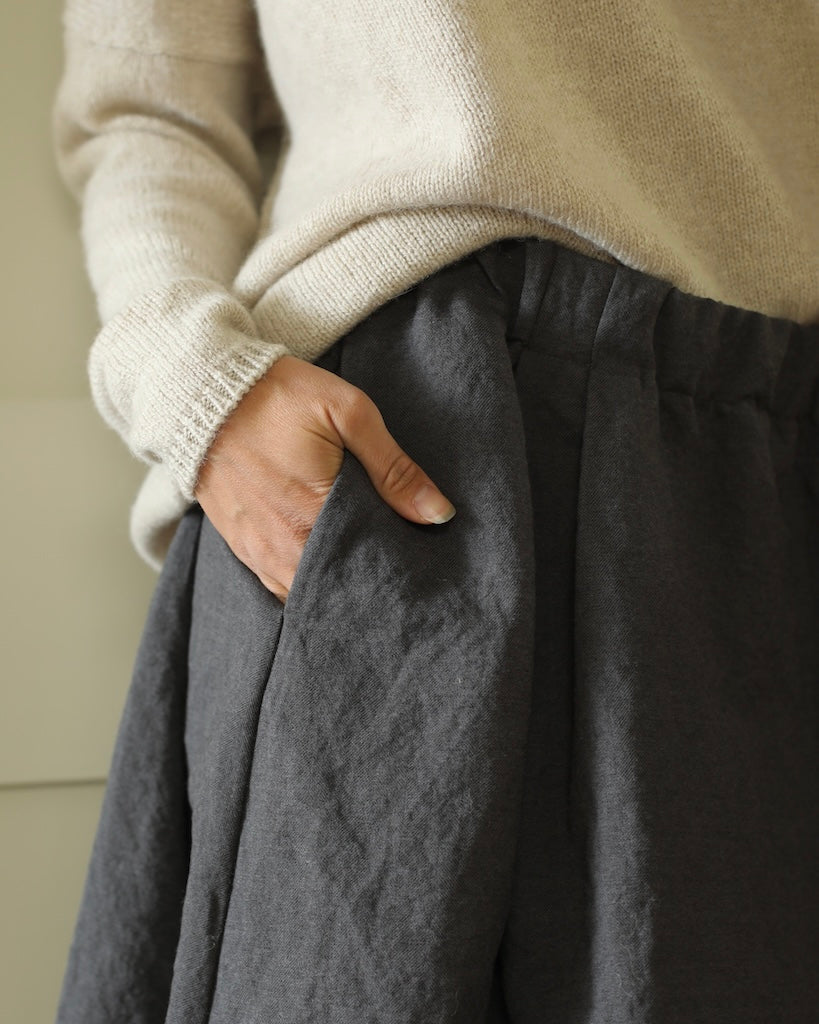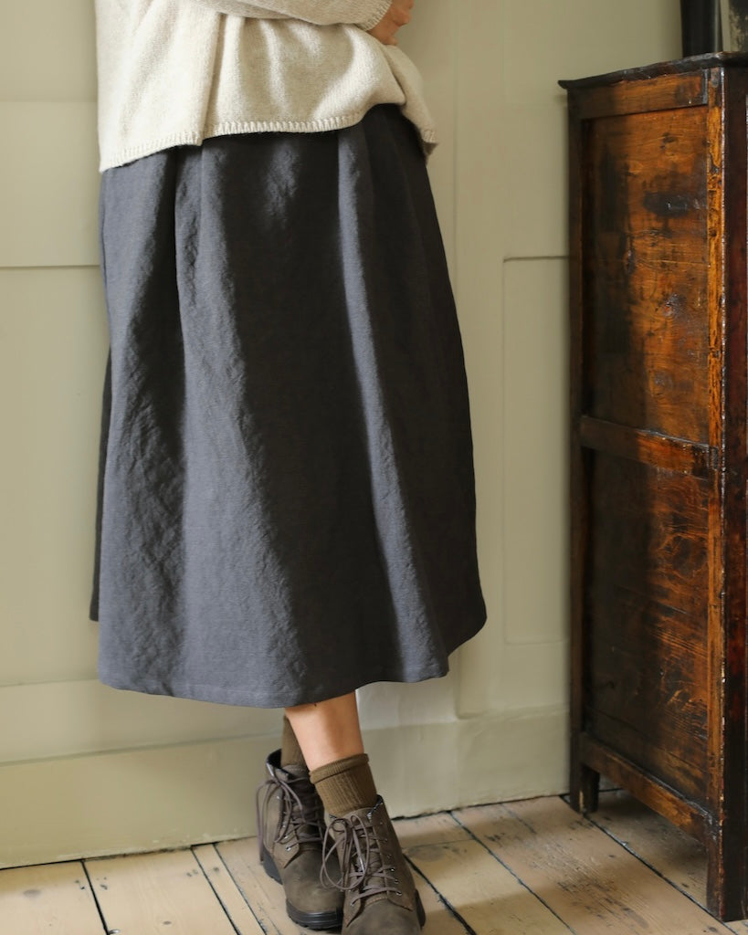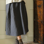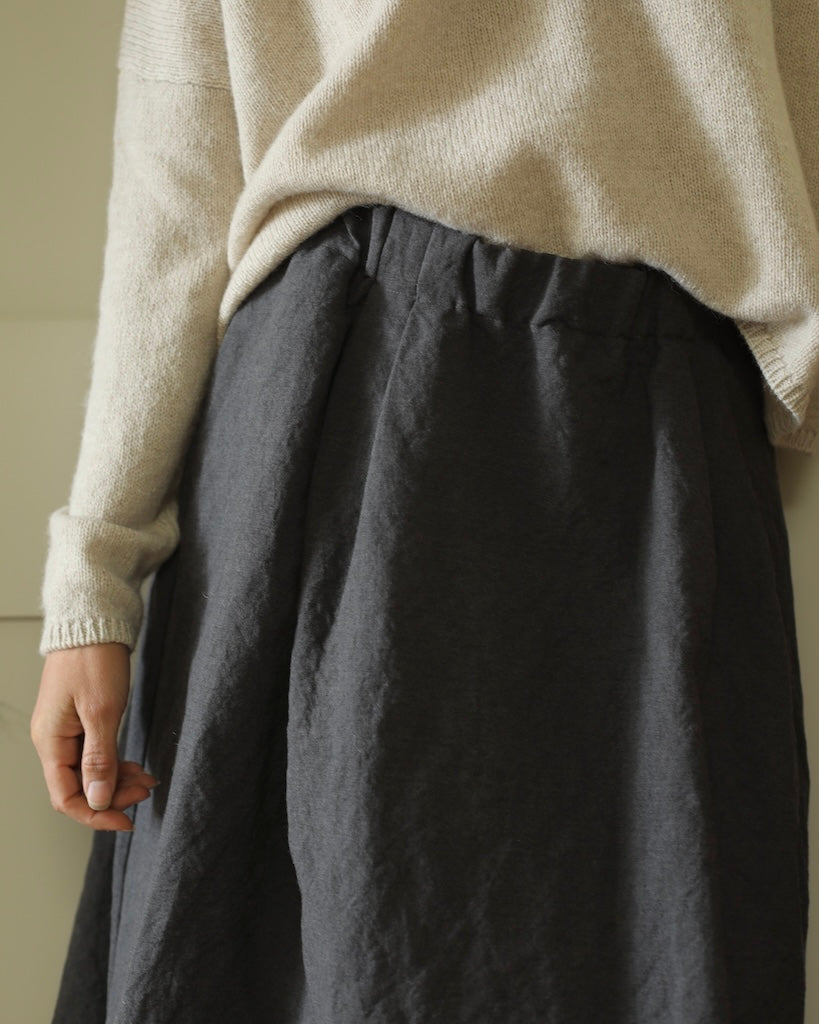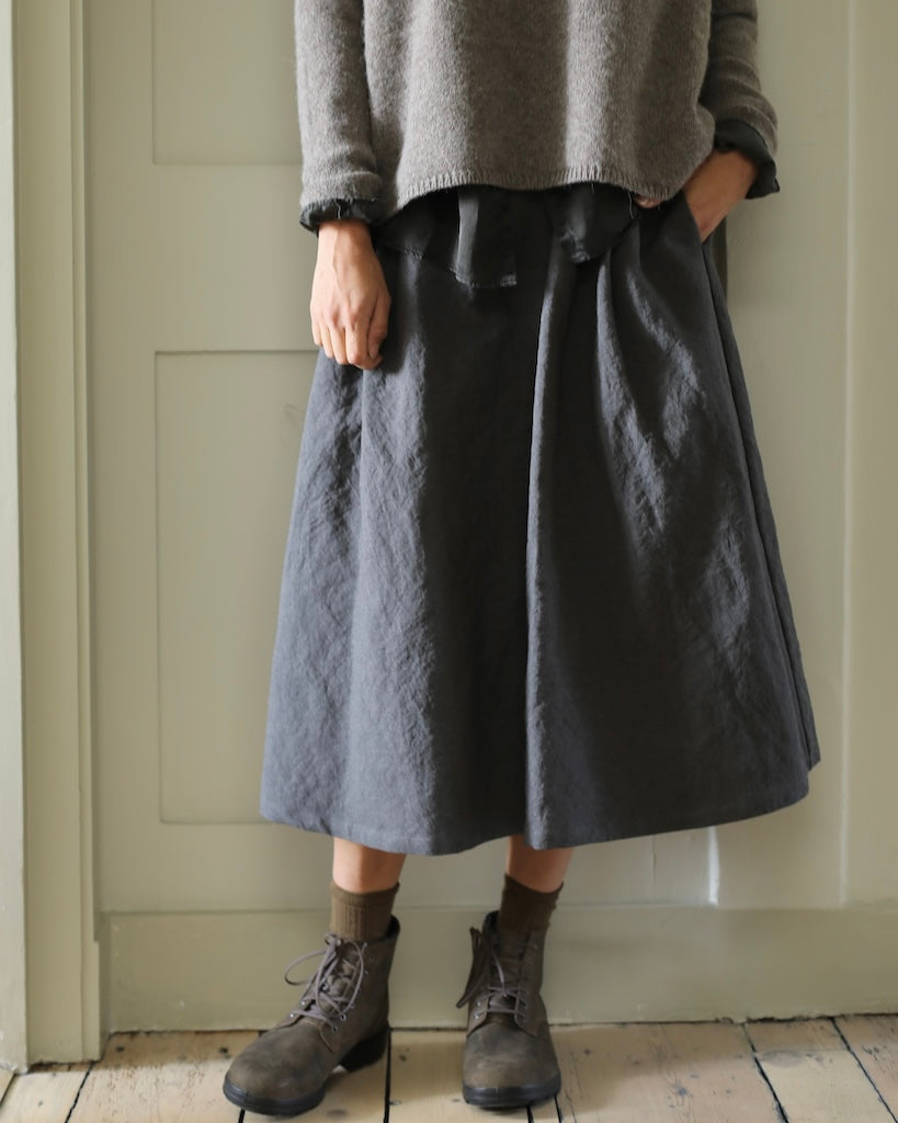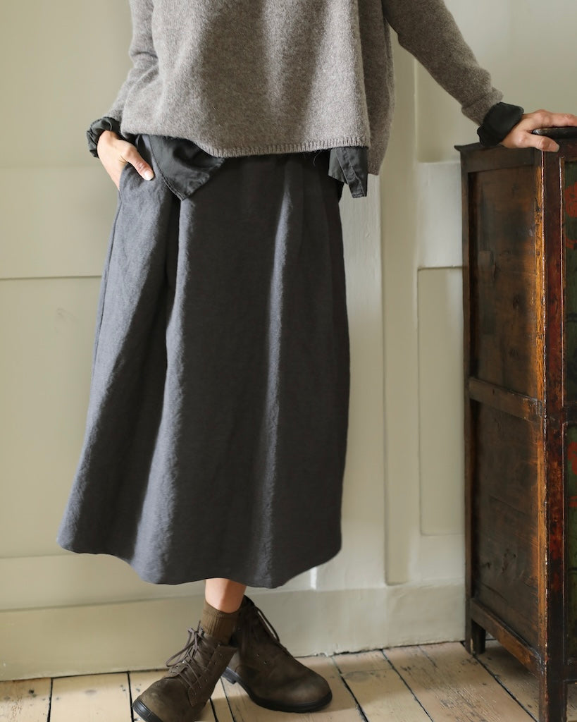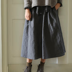 Crafted from a wool and cotton blend with a refined denim look in cool petrol grey, this skirt features an elegant straight A-line silhouette with front and back dart details. Designed for ease with an elastic waist and discreet side pockets, it blends structure with everyday sophistication.About the artist: