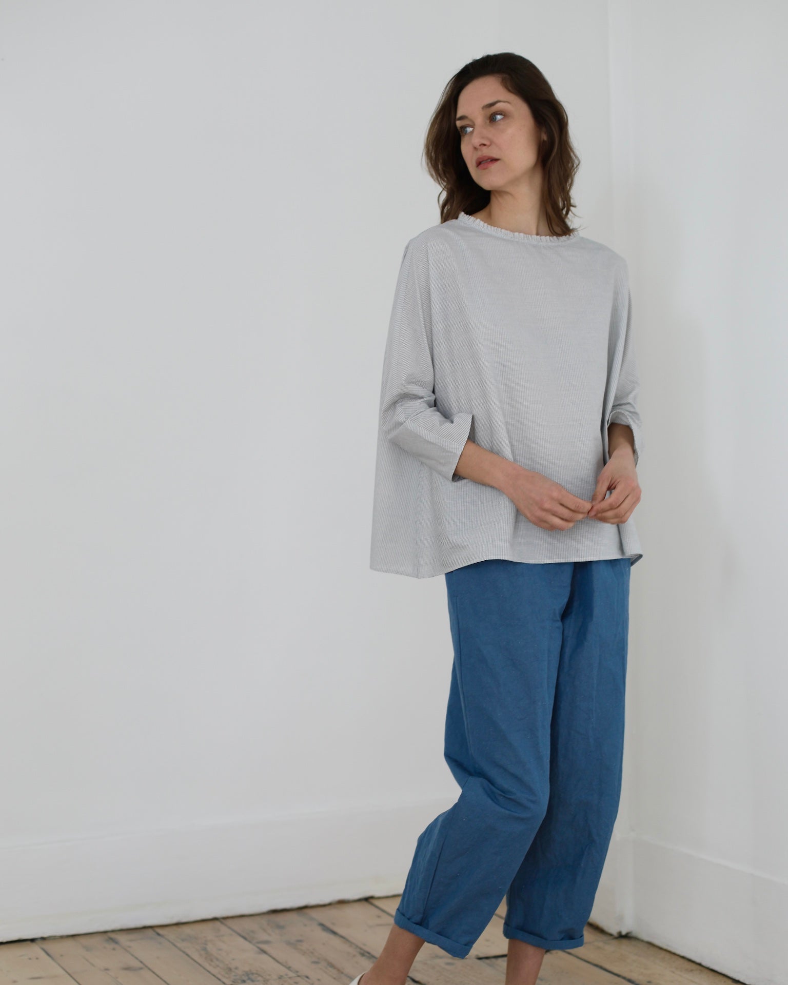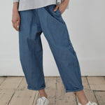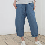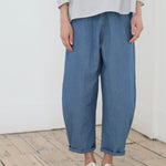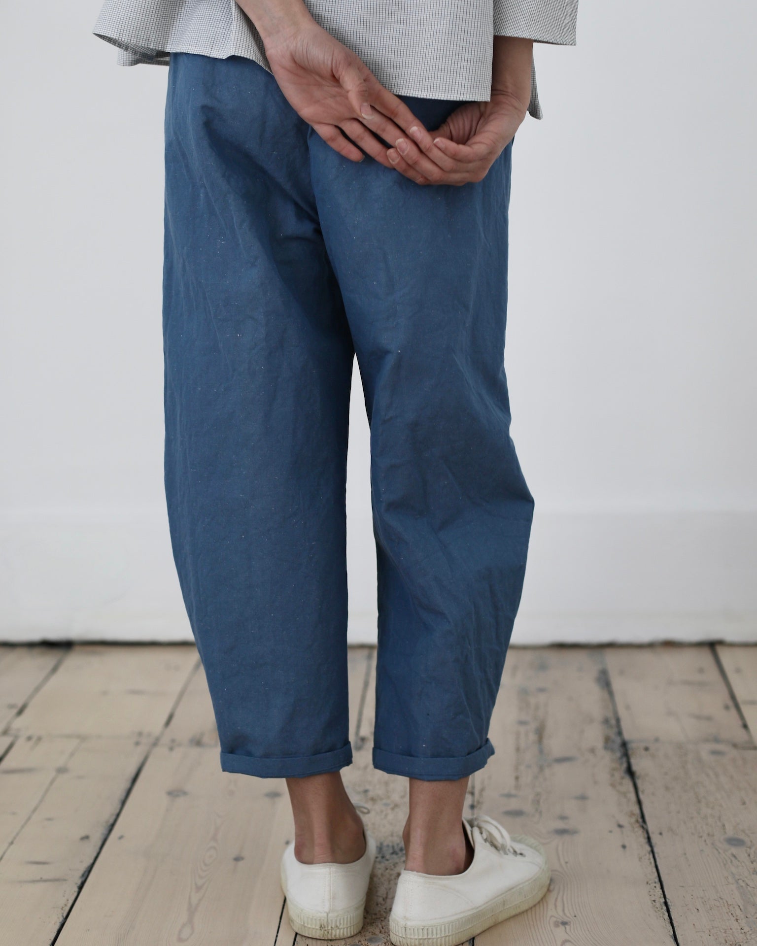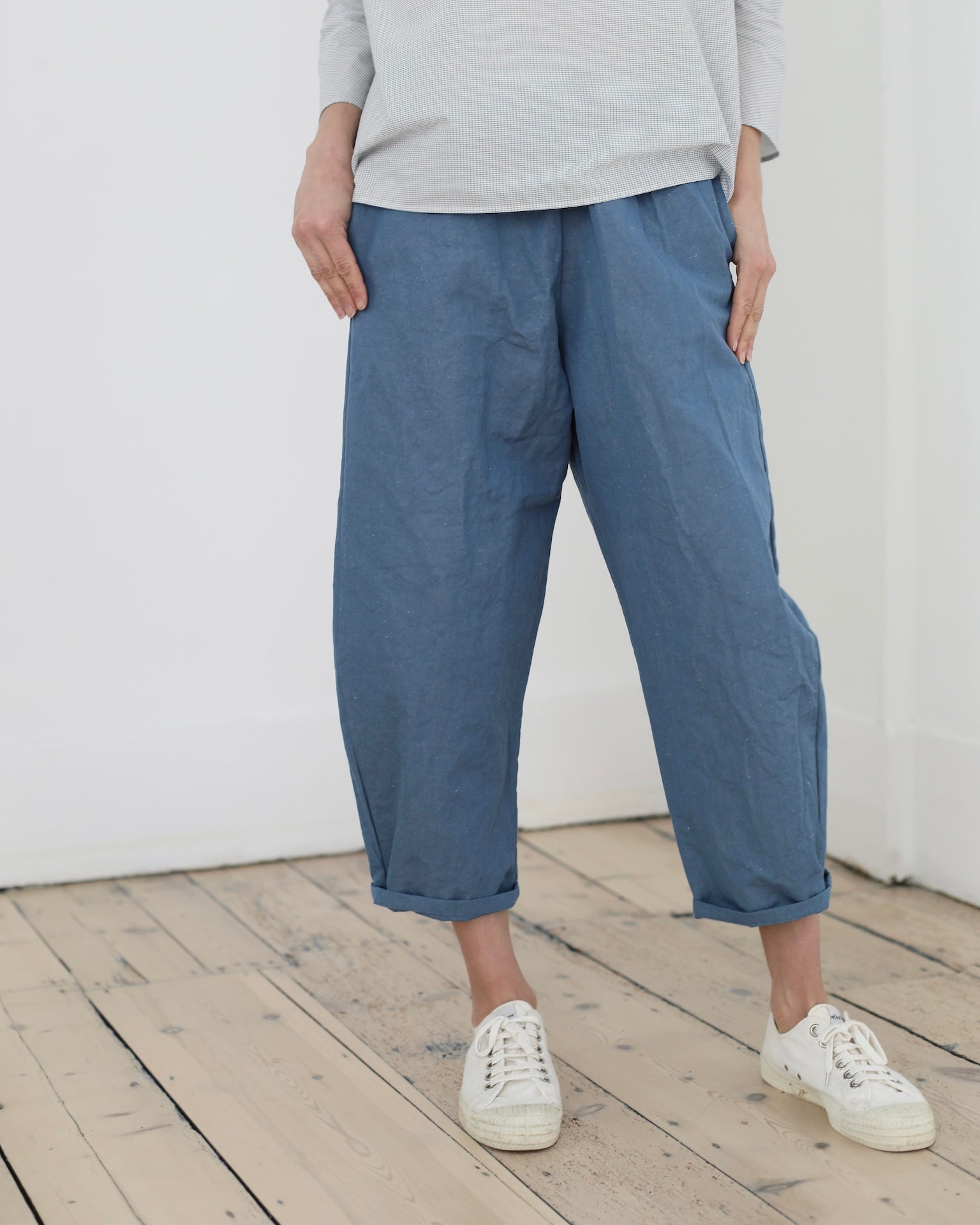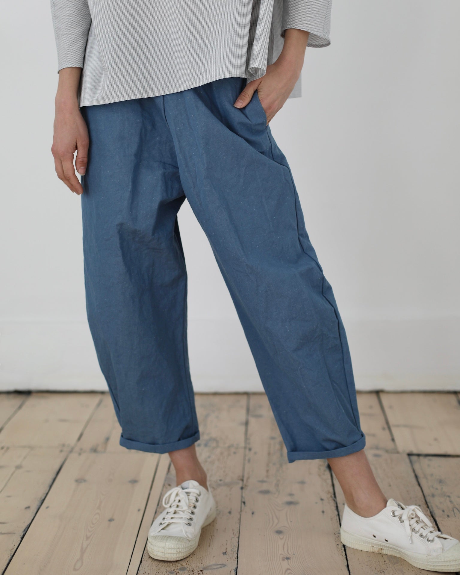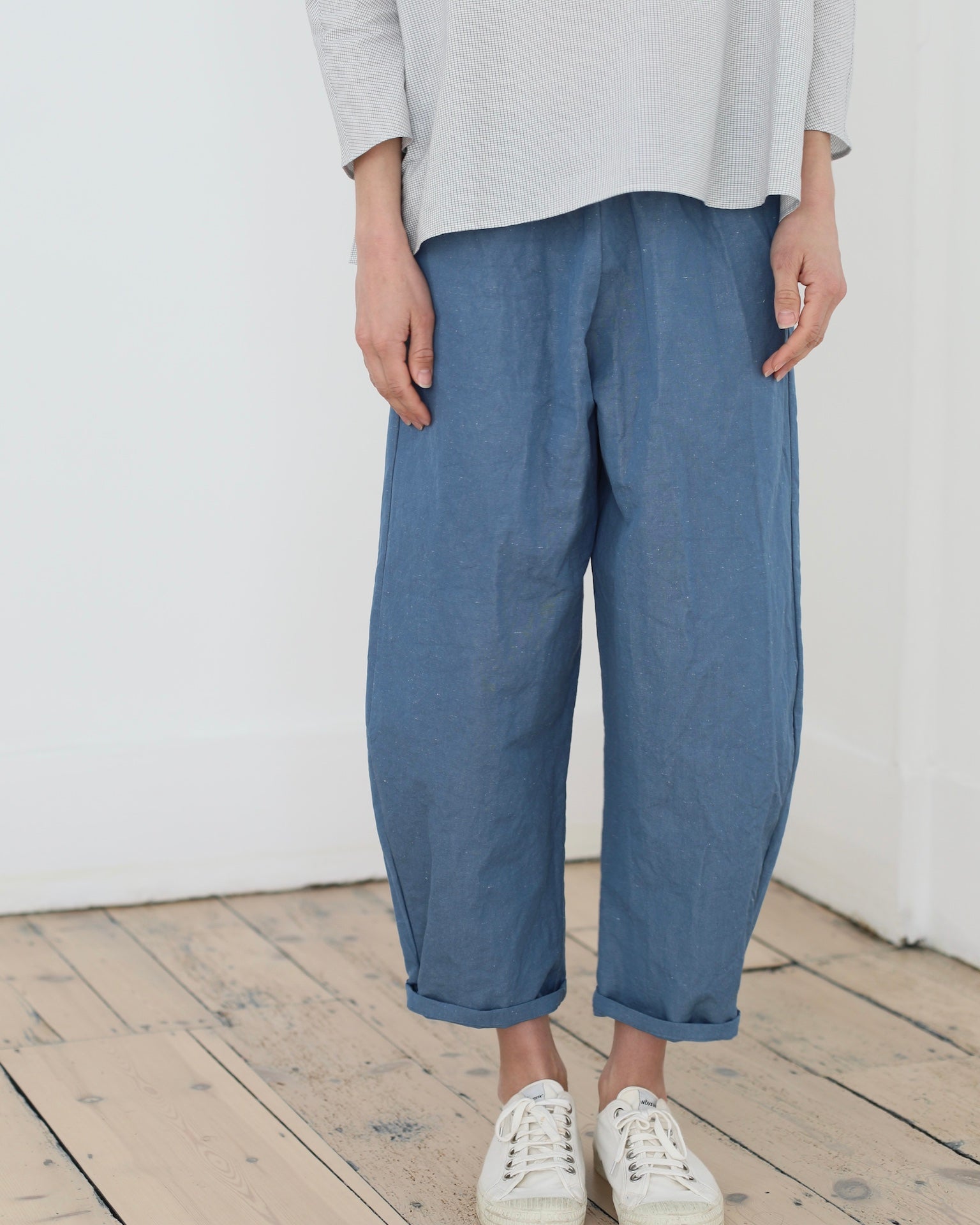 The 'Sugar Blue' shade is a soft blue with subtle white linen blend twill, adding natural texture and depth. Easy to waer and simple to style, they are a versitile piece for both everyday, and more considered looks.