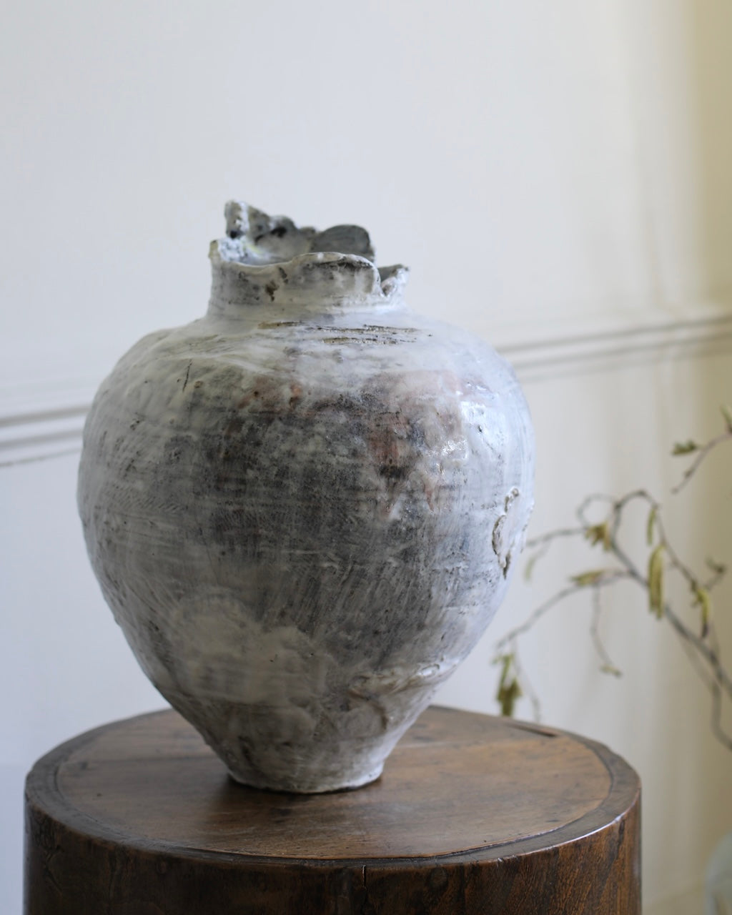 Abigail plays with a palette of dolomite and transparent glazes. Each piece undergoes a further firing to be lightly gilded with (24 carat) gold lustre, which highlight the shape of each form and create an intriguing contrast with the more humble tones and textures of her work.