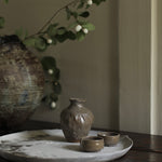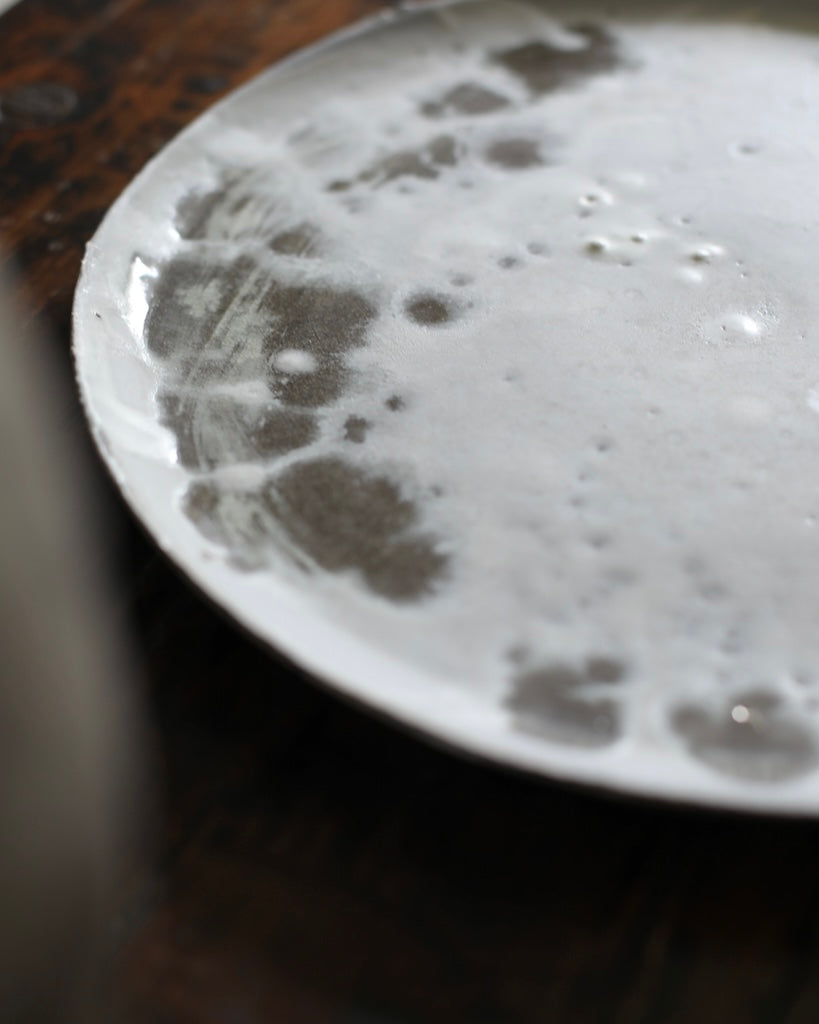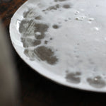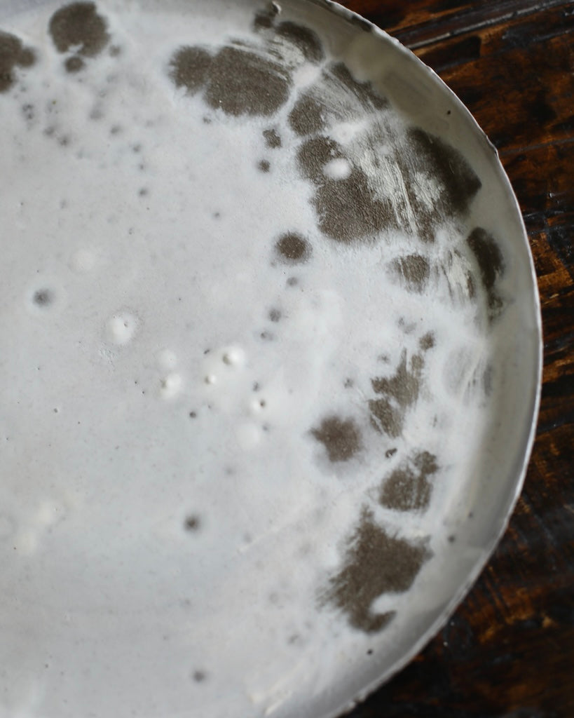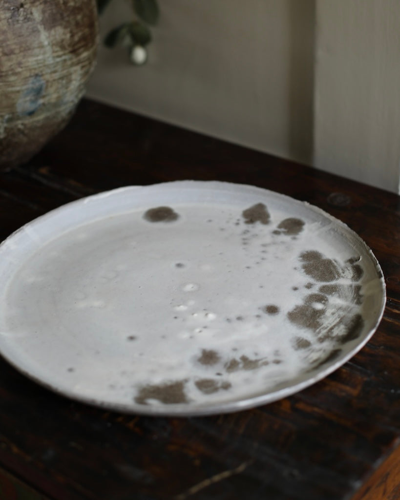 An expressive ceramic plate with a softly irregular, raw edge that honours the gesture of the maker’s hand. The surface is finished with a gentle off-white matte glaze, its tone shifting subtly across the form. In places, the glaze pools into clear crackle, revealing the warmth of the clay beneath.