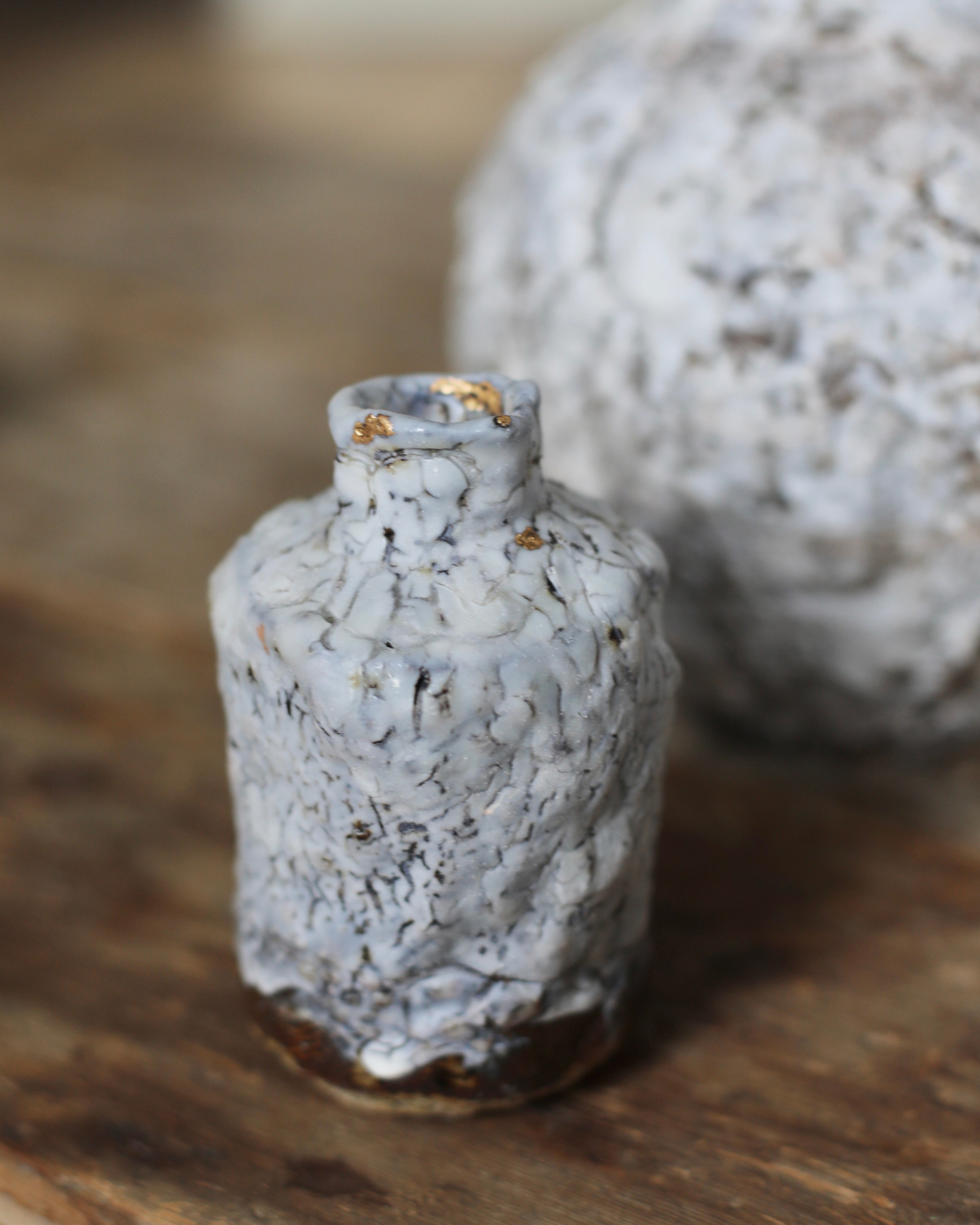 Abigail plays with a palette of dolomite and transparent glazes. Each piece undergoes a further firing to be lightly gilded with (24 carat) gold lustre, which highlight the shape of each form and create an intriguing contrast with the more humble tones and textures of her work.
