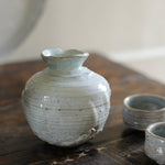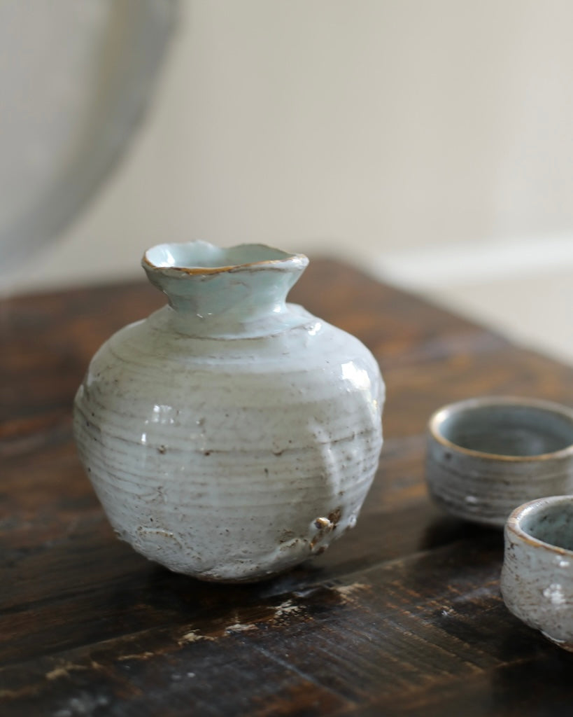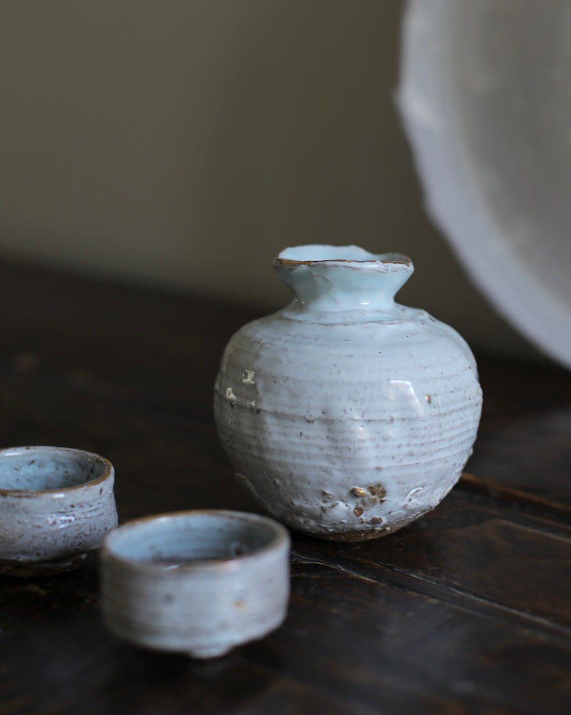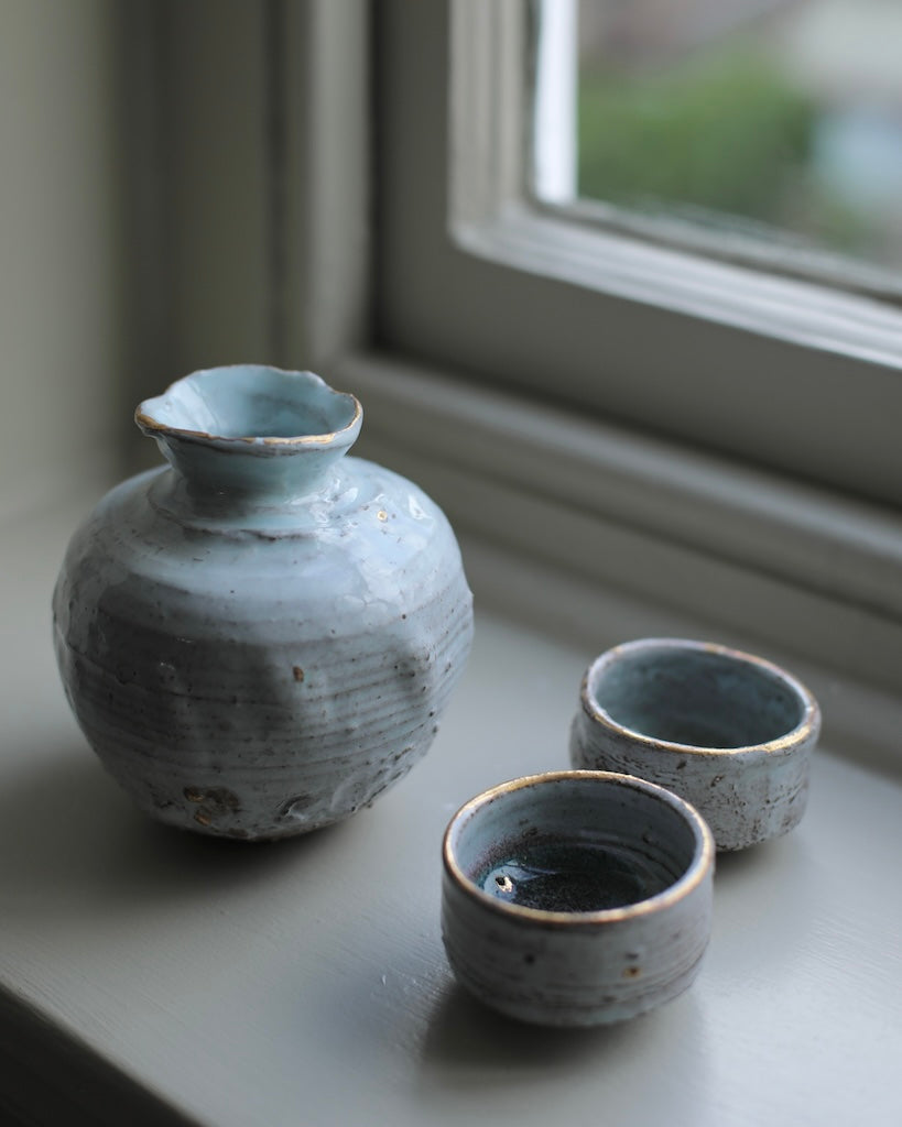 Hand thrown and carved, this sake set by Abigail Schama has a perfectly balanced form, with thoughtfully applied surface texture. Finished with a beautifully soft glaze, the pieces are gifted delicate touches of gold throughout. The soft tone of each piece subtly contrasts the intentionally playful silhouettes, allowing the pieces their own character and endless points of interest.