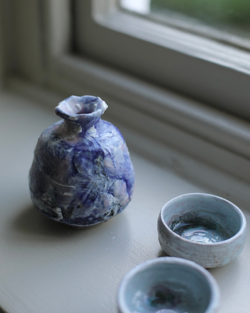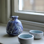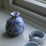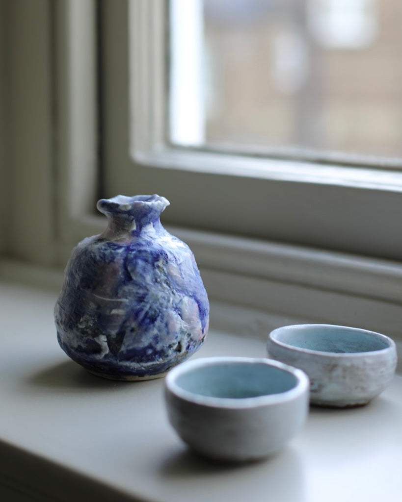 Hand thrown and carved, this sake set by Abigail Schama has a perfectly balanced form, with thoughtfully applied surface texture. Finished with a beautifully soft glaze, the pieces are gifted delicate touches of gold throughout. The soft tone of each piece subtly contrasts the intentionally playful silhouettes, allowing the pieces their own character and endless points of interest.