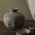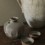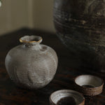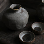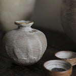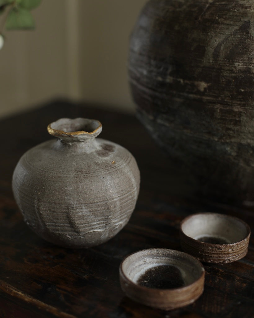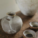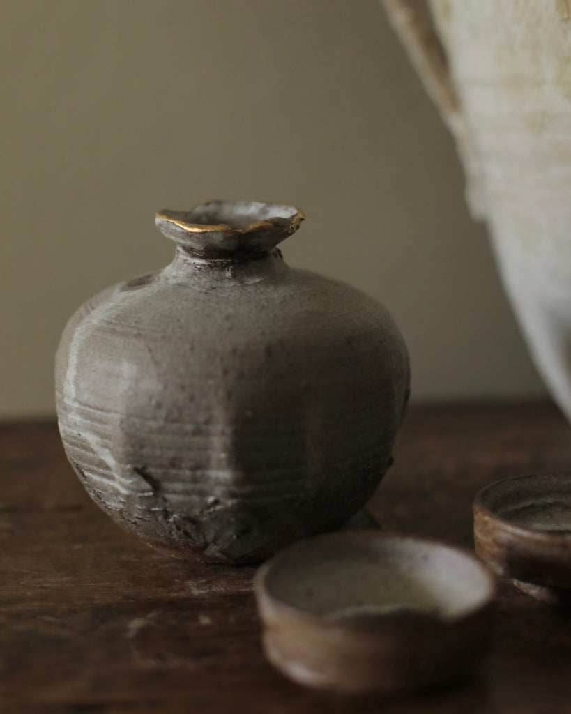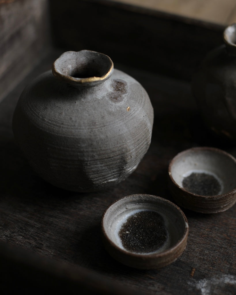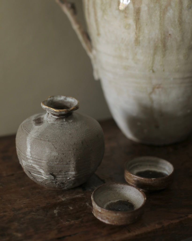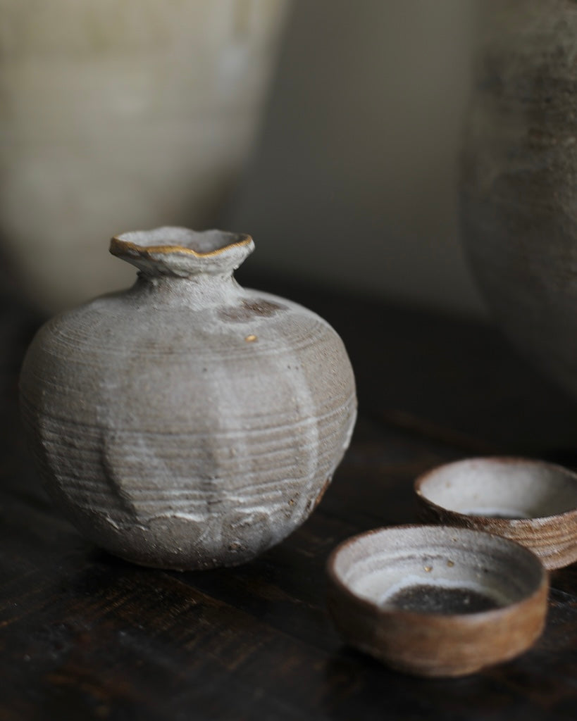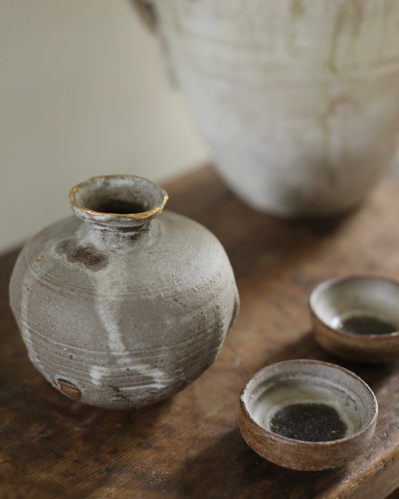 Hand thrown and carved, this sake set by Abigail Schama has a perfectly balanced form, with thoughtfully applied surface texture. Finished with a beautifully soft glaze, the pieces are gifted delicate touches of gold throughout. The soft tone of each piece subtly contrasts the intentionally playful silhouettes, allowing the pieces their own character and endless points of interest.
