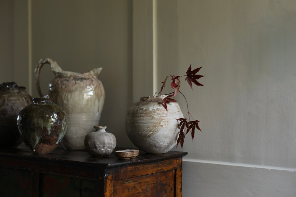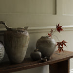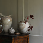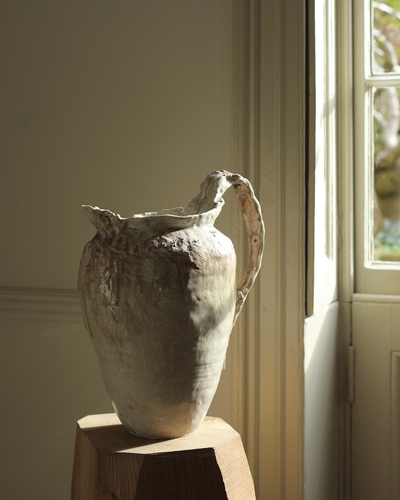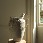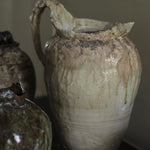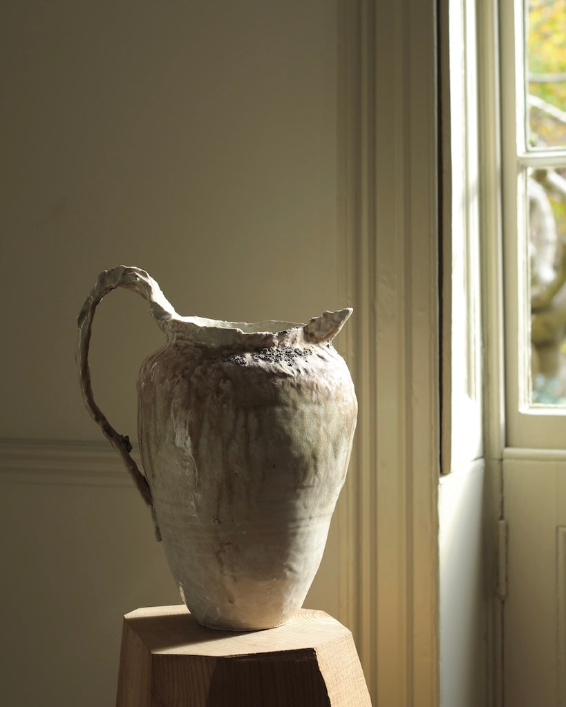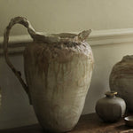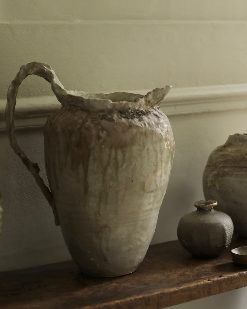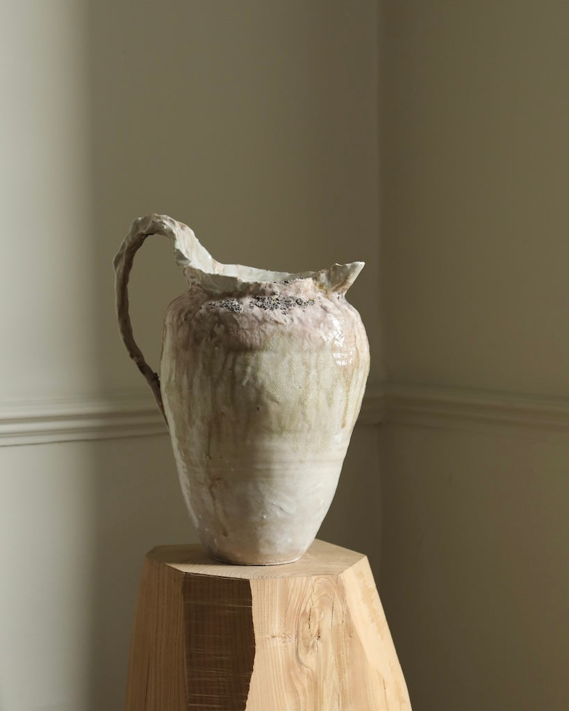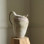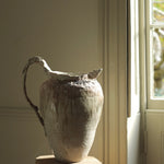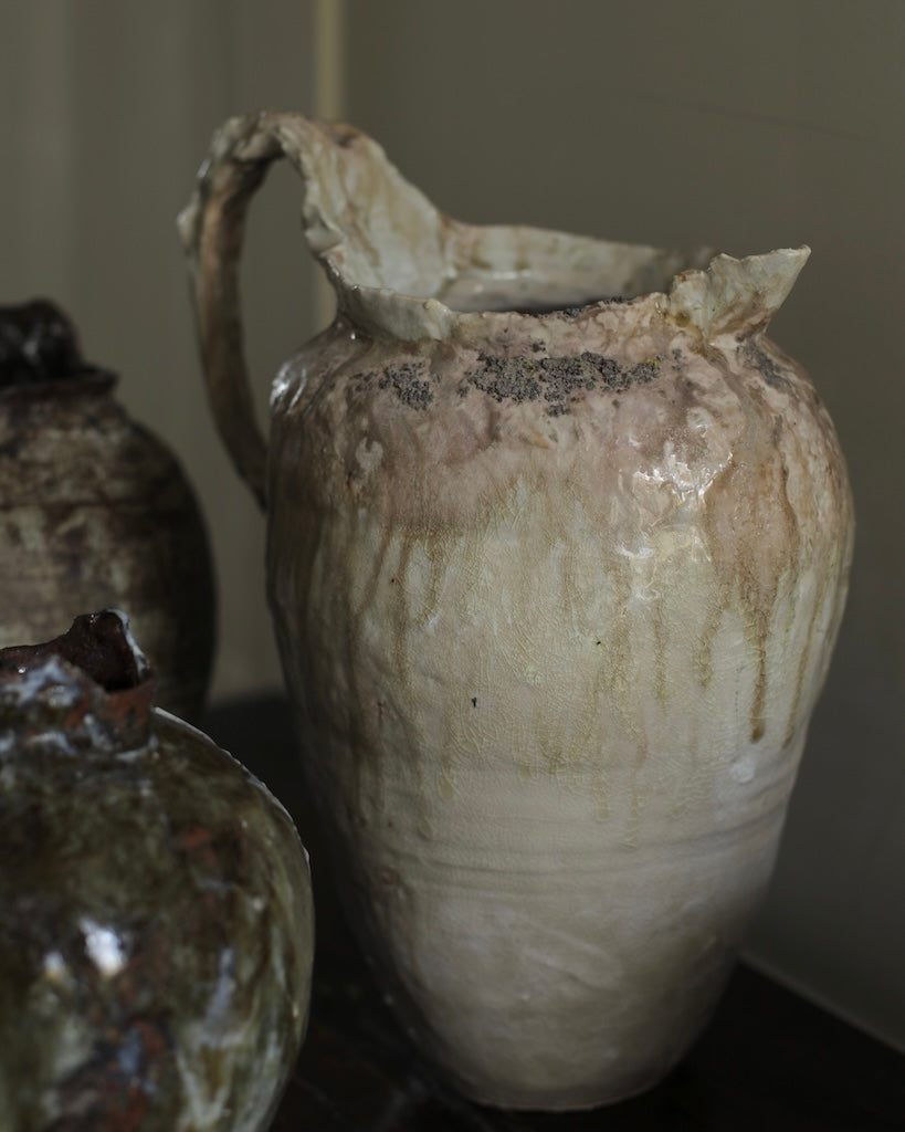 This sculptural jug balances fragility and strength in its organic form. The surface bears soft ivory and earthy tones, layered with translucent glazes that flow and pool like mineral deposits. Its irregular rim and expressive handle evoke a sense of erosion and time-worn beauty, celebrating imperfection and the tactile nature of clay. Both functional and sculptural, the piece captures a quiet, elemental presence.