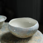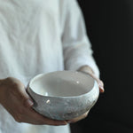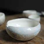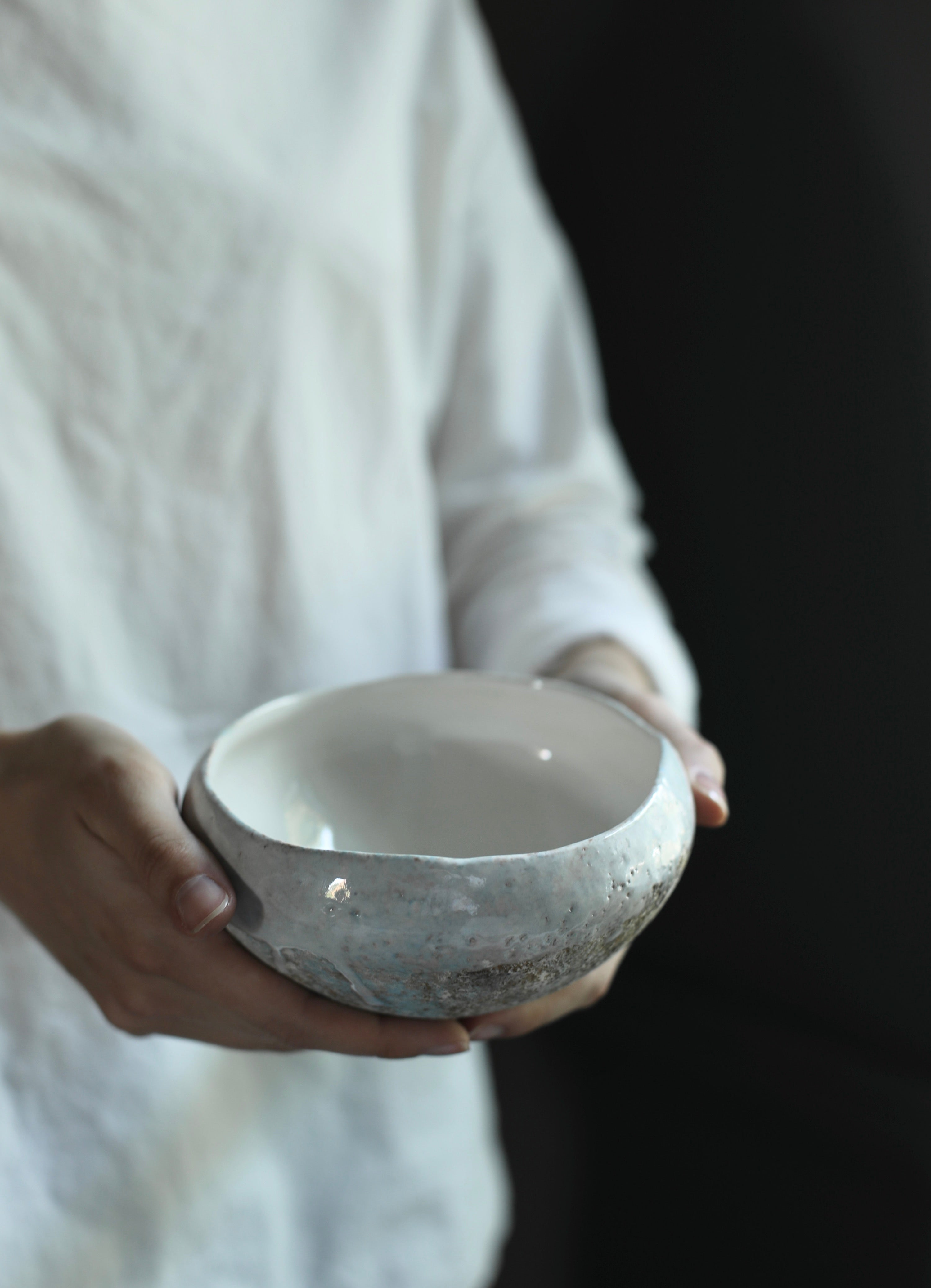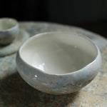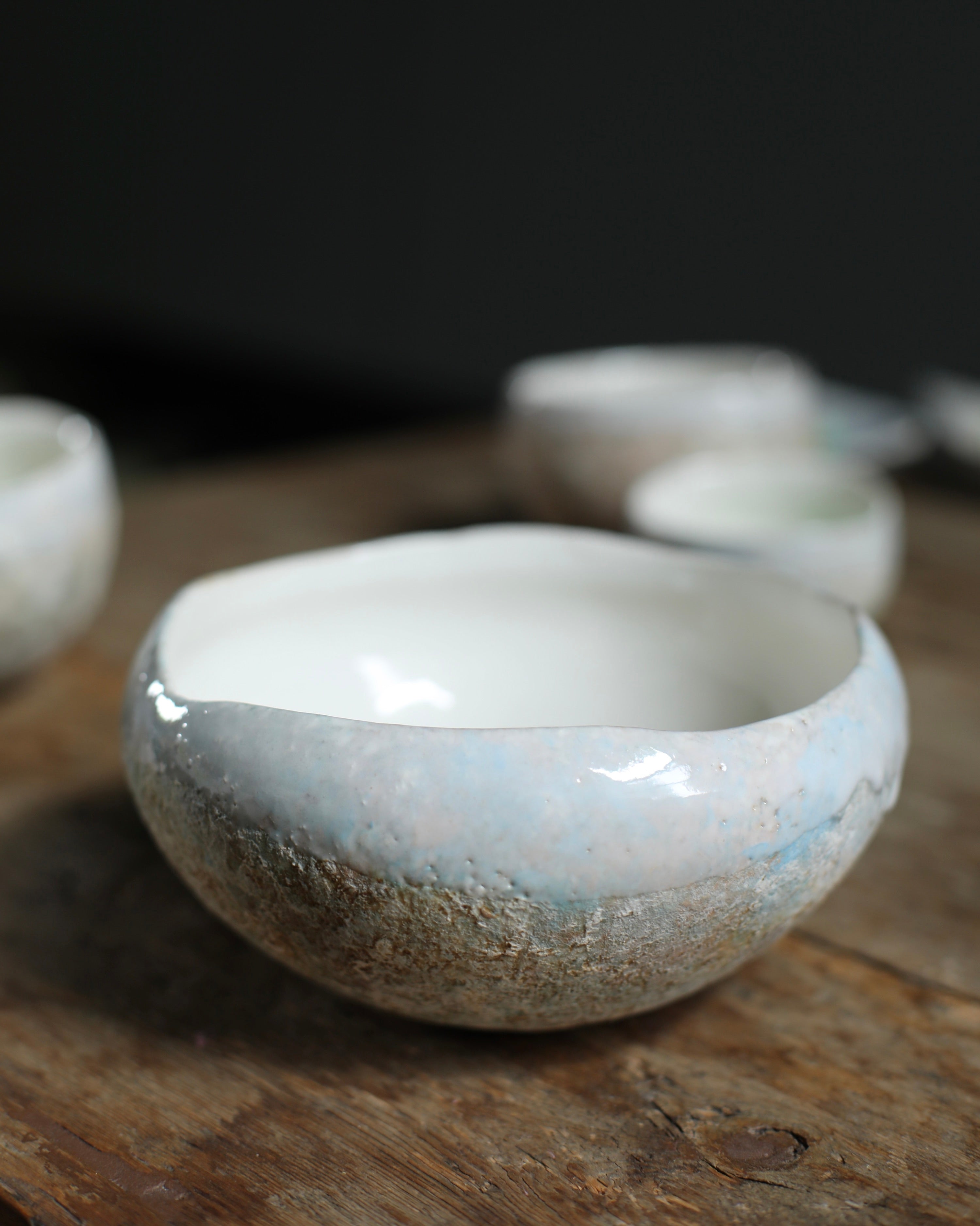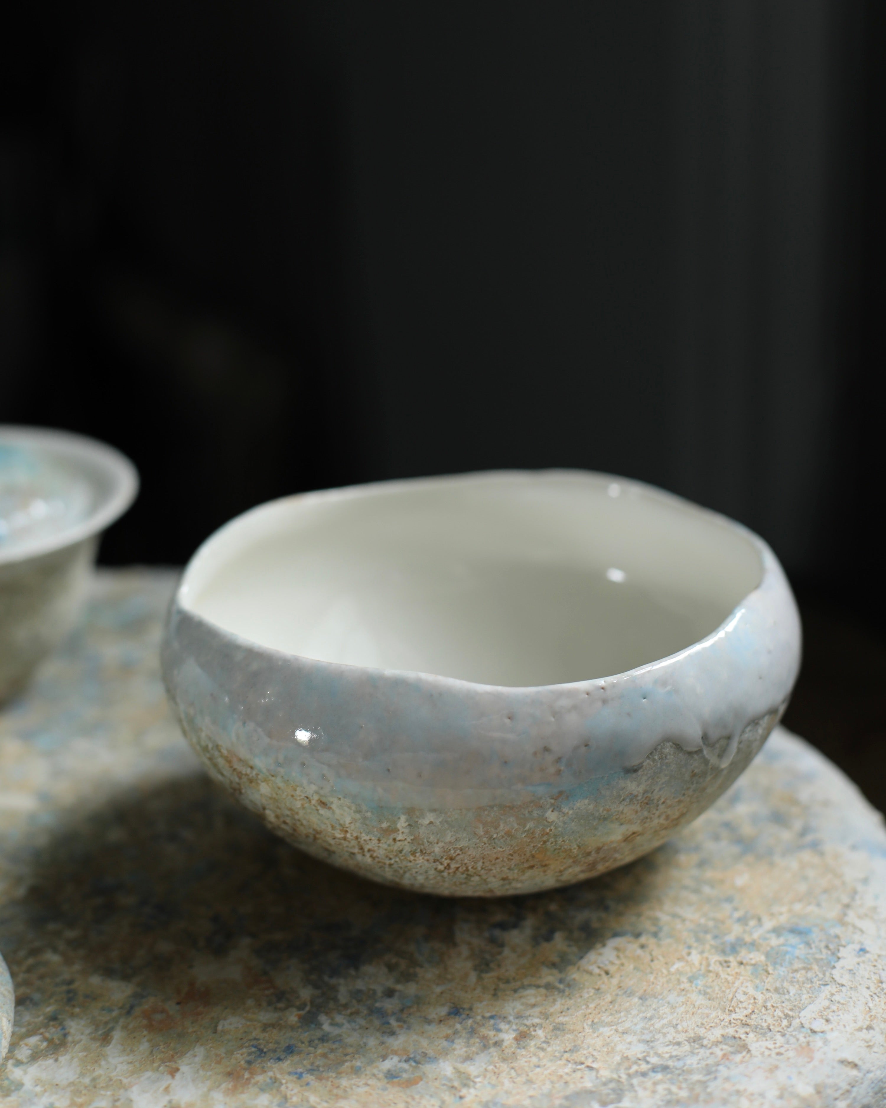 This porcelain bowl is made using hand-building, wheel-throwing, and mold techniques. Earthy tones and a white glaze on the interior and rim create a soft, natural palette. The form is gently curved inward at the top, adding a subtle sense of containment to the open shape.