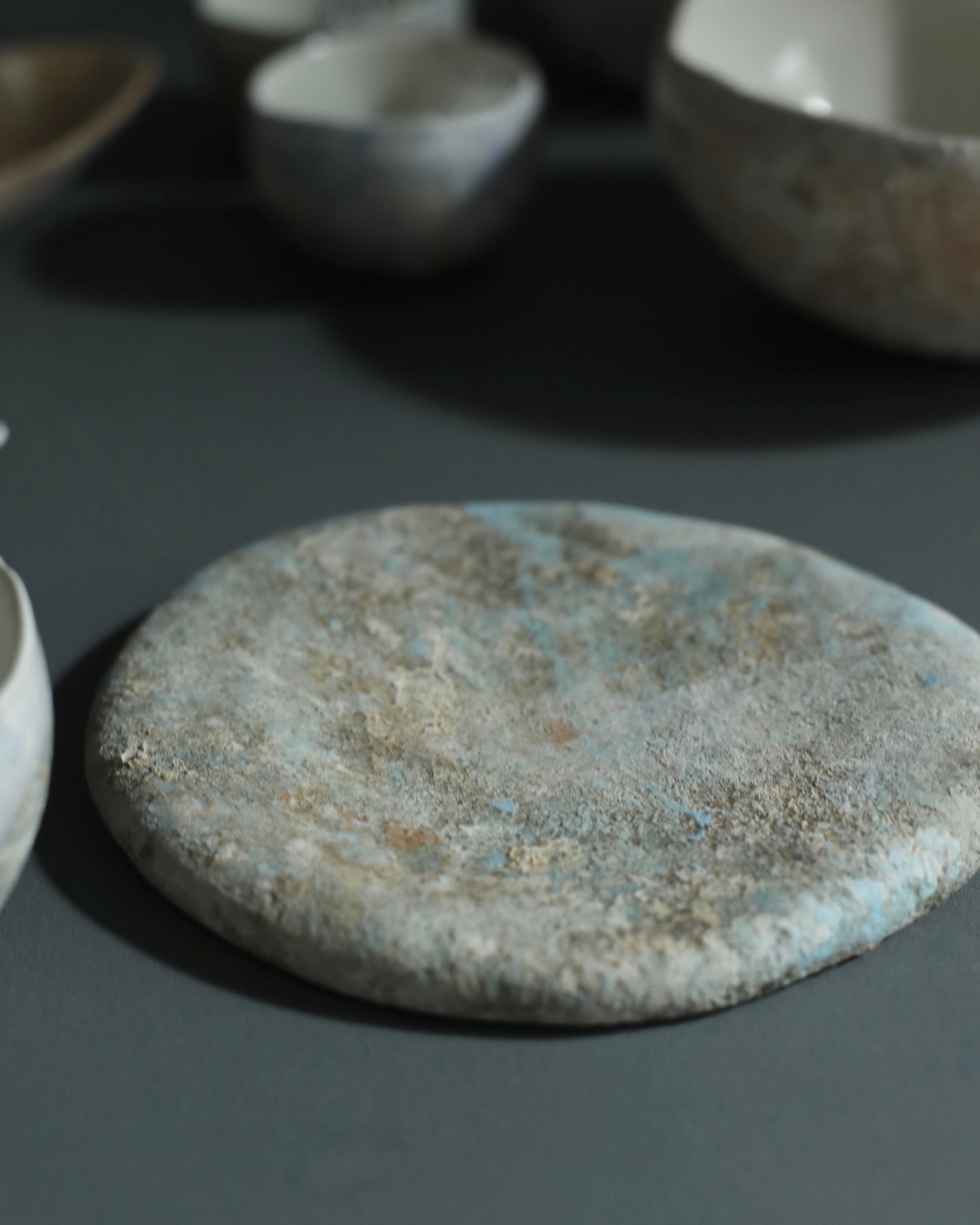 This porcelain saucer features a rounded, flattened form with an organic profile that evokes the presence of weathered stone. Earthy tones and a gently textured surface connect it to the natural world, while subtle irregularities reflect Akari’s handmade process.