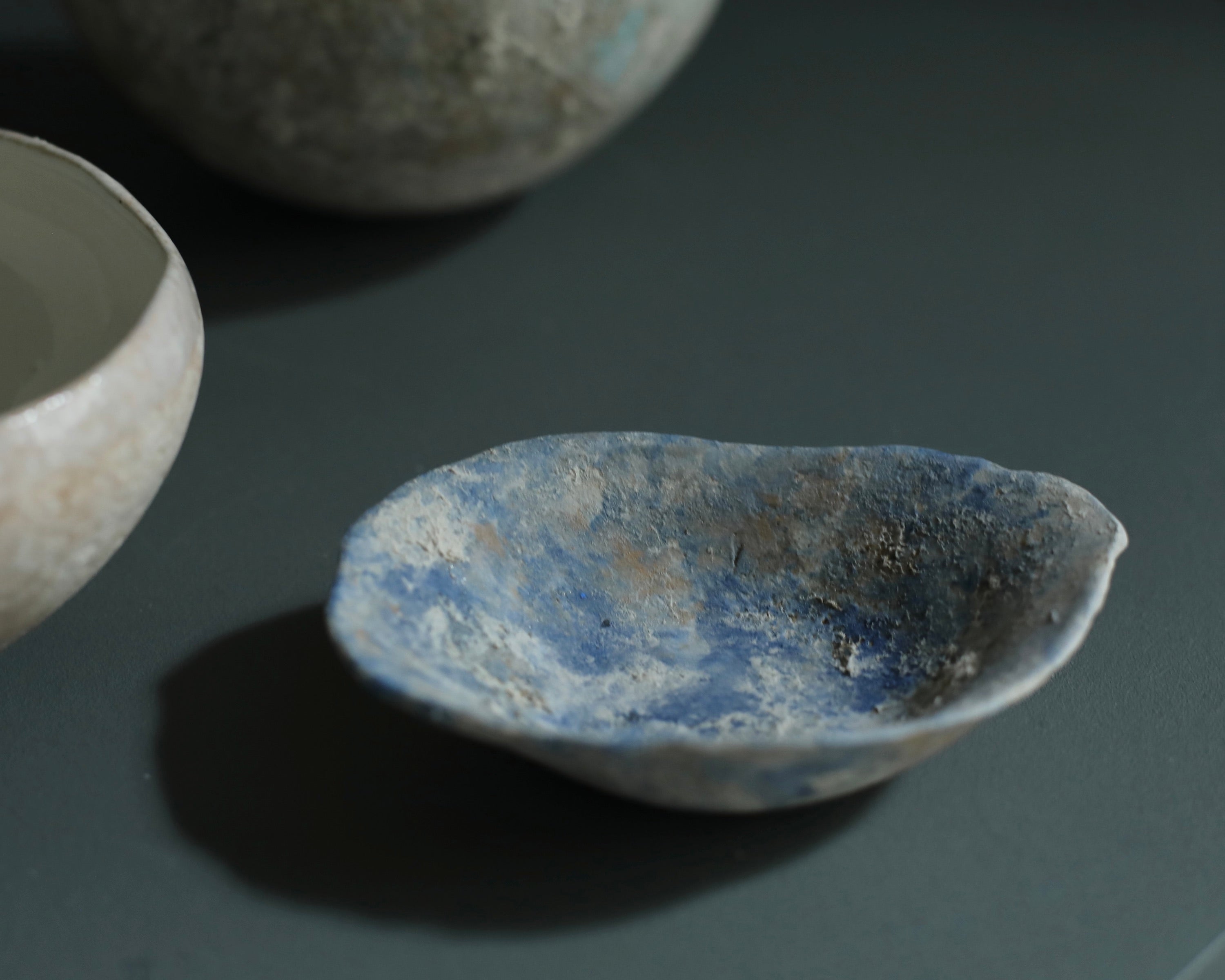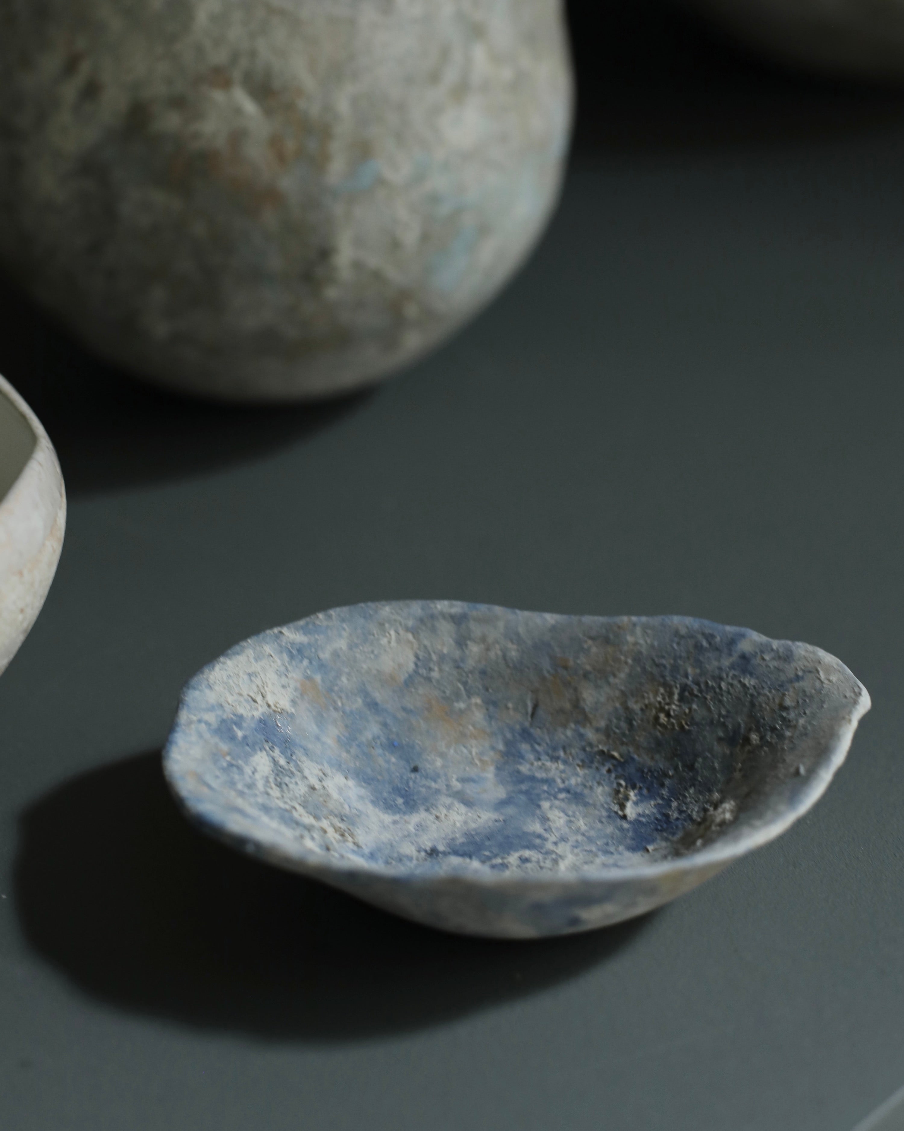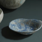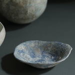 This small porcelain saucer features an organic, curved form with earthy tones and a textured surface. Subtle variations in shape and finish highlight Akari’s handmade process.