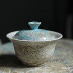 This porcelain gaiwan features a cup-like form with earthy tones and a softly textured surface. The slightly domed lid is topped with a small, central handle, offering a refined balance of function and form. Subtle variations highlight the hand-crafted nature of the piece.