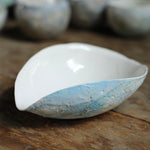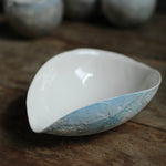 This porcelain tea leaf dish features a glazed interior and a textured, earthy exterior. The form is gently lifted at the sides, creating a cupped shape that evokes an offering gesture. Subtle variations in surface and contour reflect the hand-crafted nature of the piece.