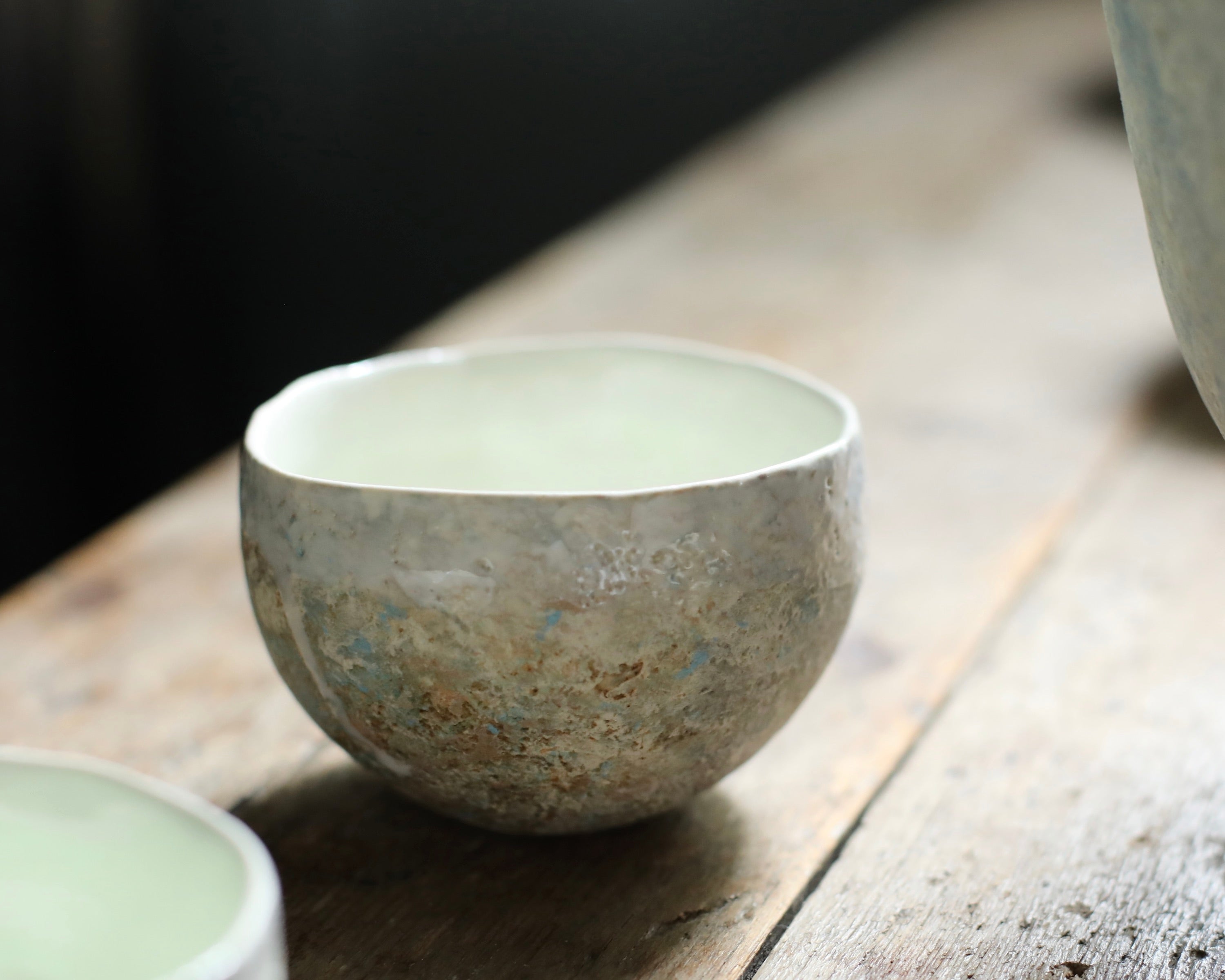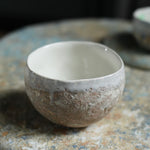 This porcelain cup is made using hand-building, wheel-throwing, and mold techniques. Blue and earthy tones combine across the surface, with a white glaze lining the interior and outer rim. Subtle contrasts in texture and colour reflect a quiet balance between form and function.