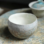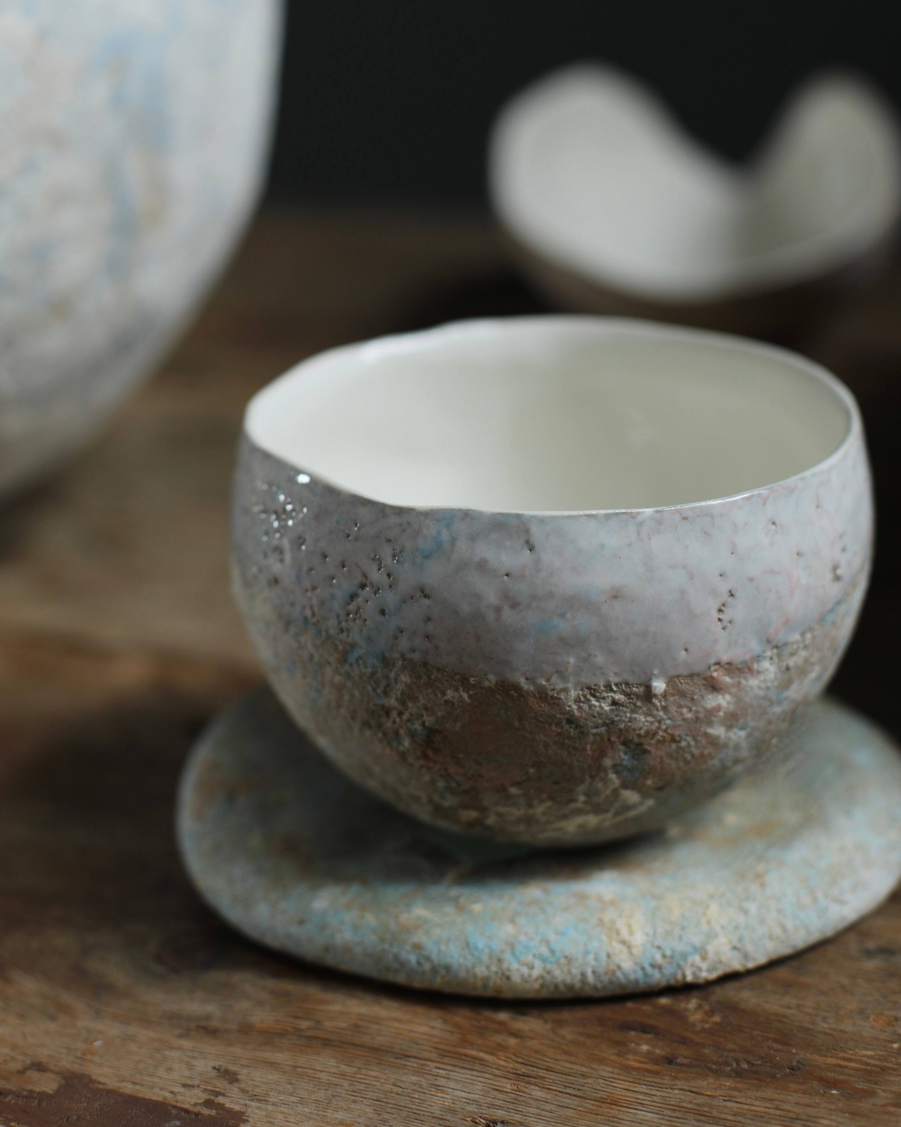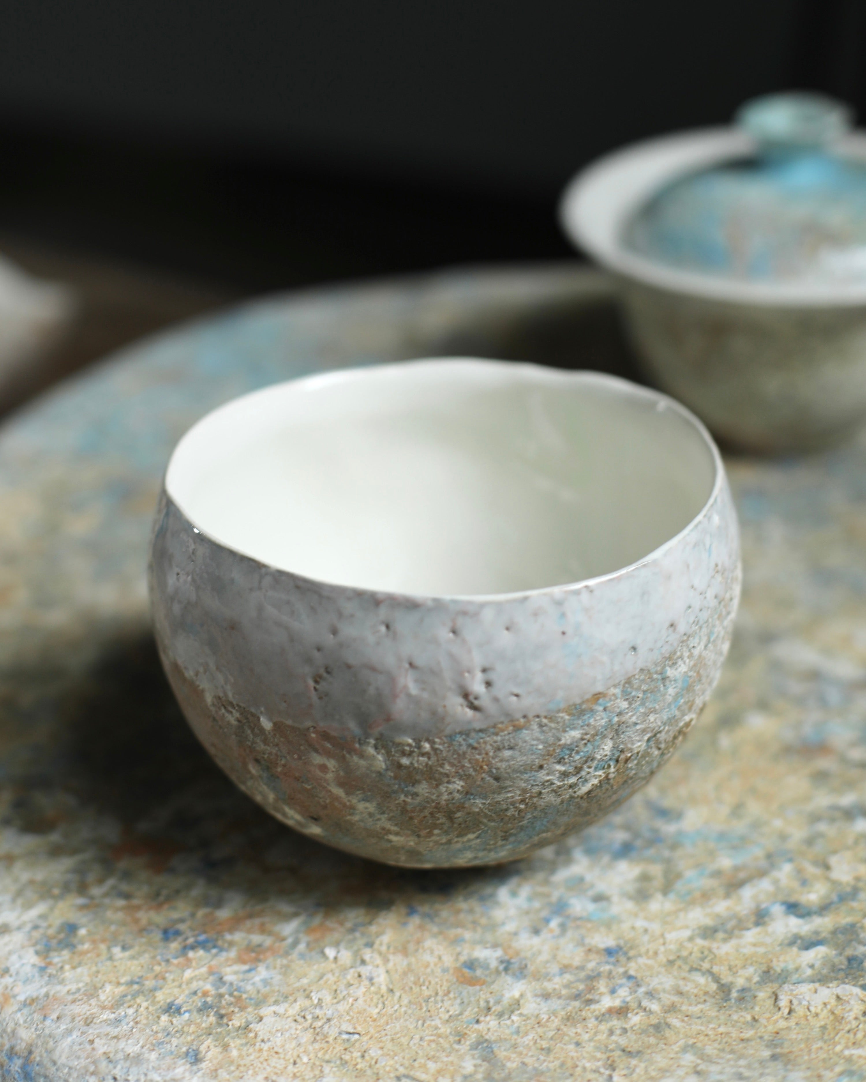 This porcelain cup is made using hand-building, wheel-throwing, and mold techniques. Blue and earthy tones combine across the surface, with a white glaze lining the interior and outer rim. Subtle contrasts in texture and colour reflect a quiet balance between form and function.
