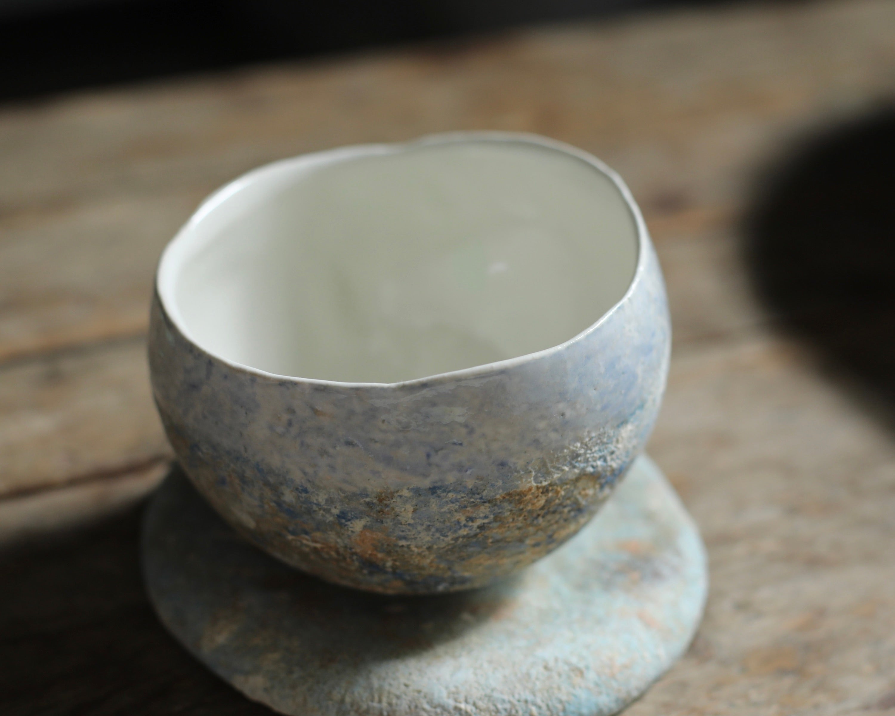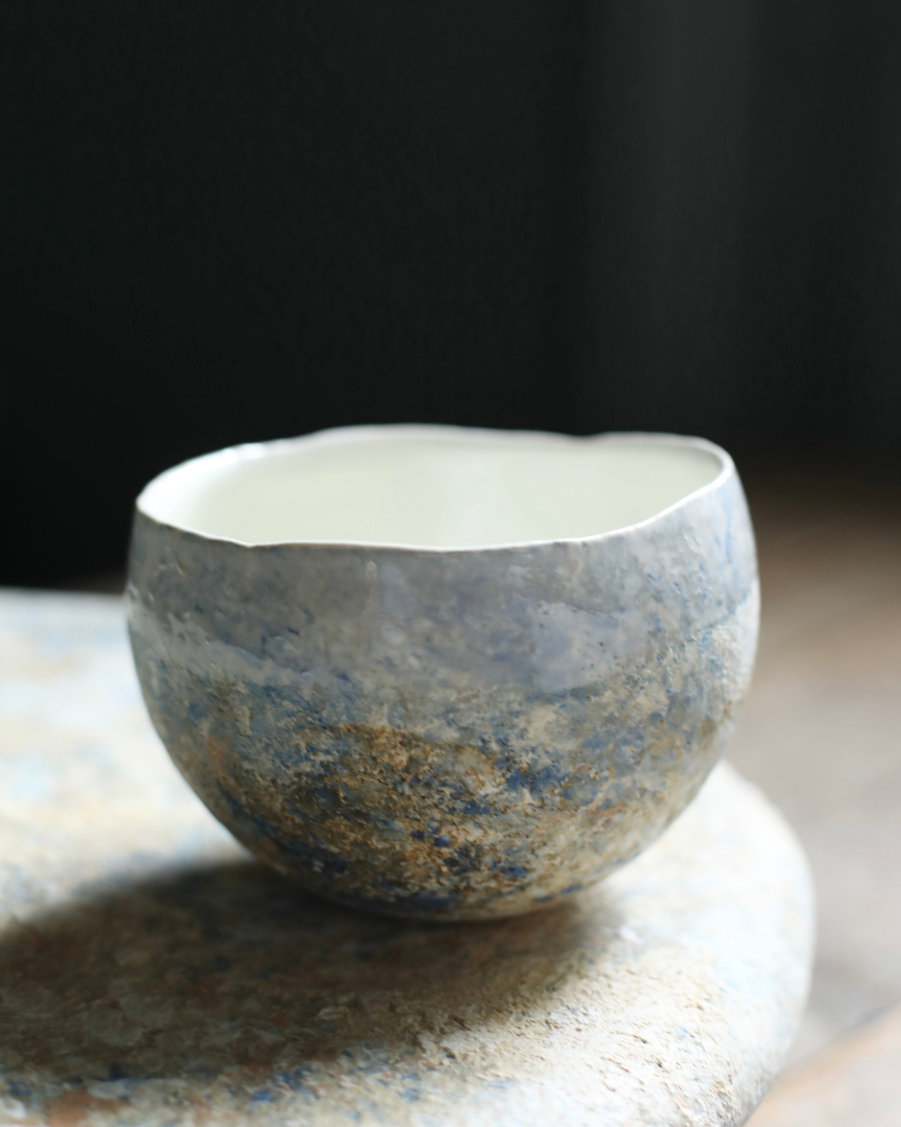 This porcelain cup is made using hand-building, wheel-throwing, and mold techniques. Blue and earthy tones combine across the surface, with a white glaze lining the interior and outer rim. Subtle contrasts in texture and colour reflect a quiet balance between form and function.