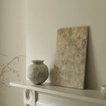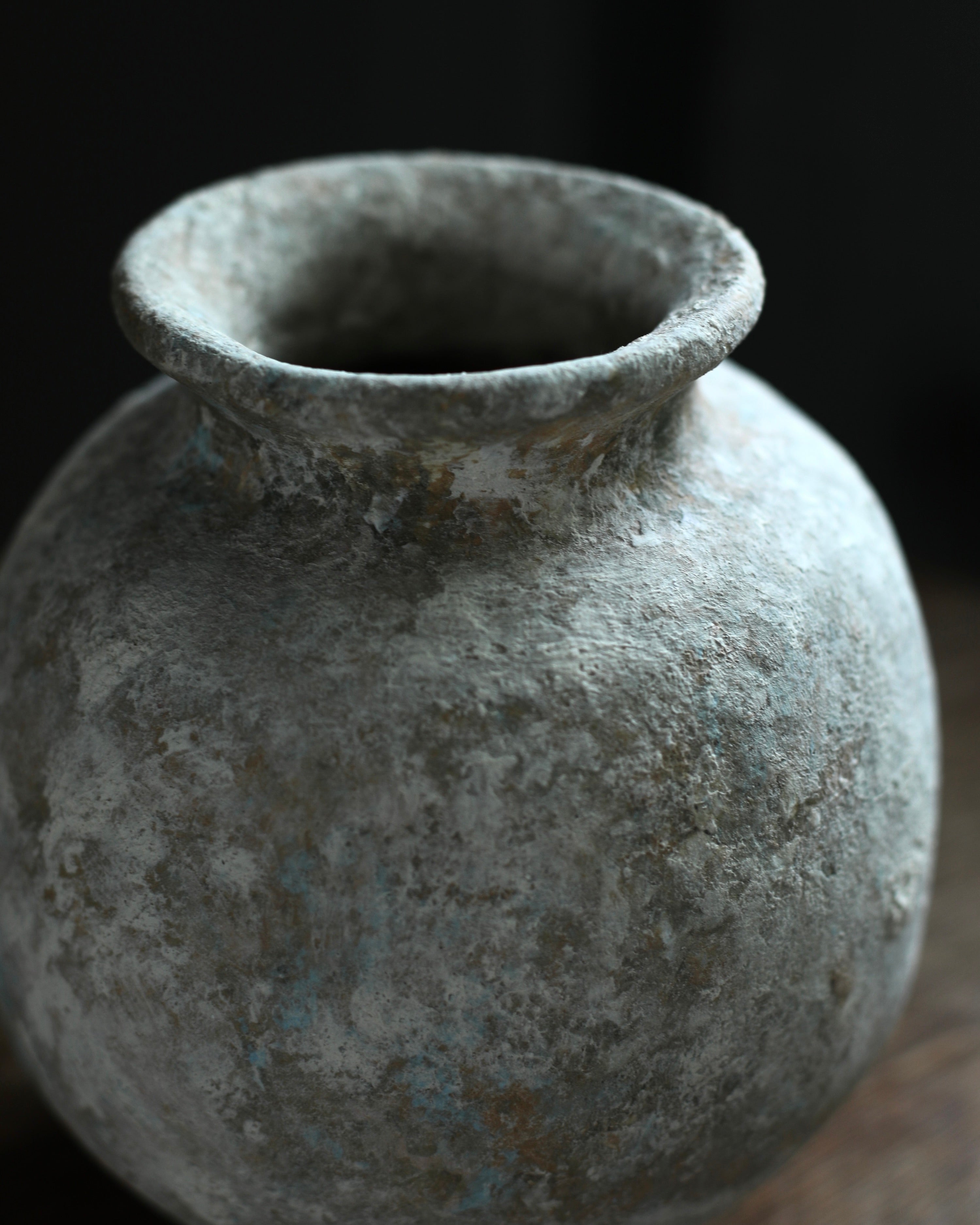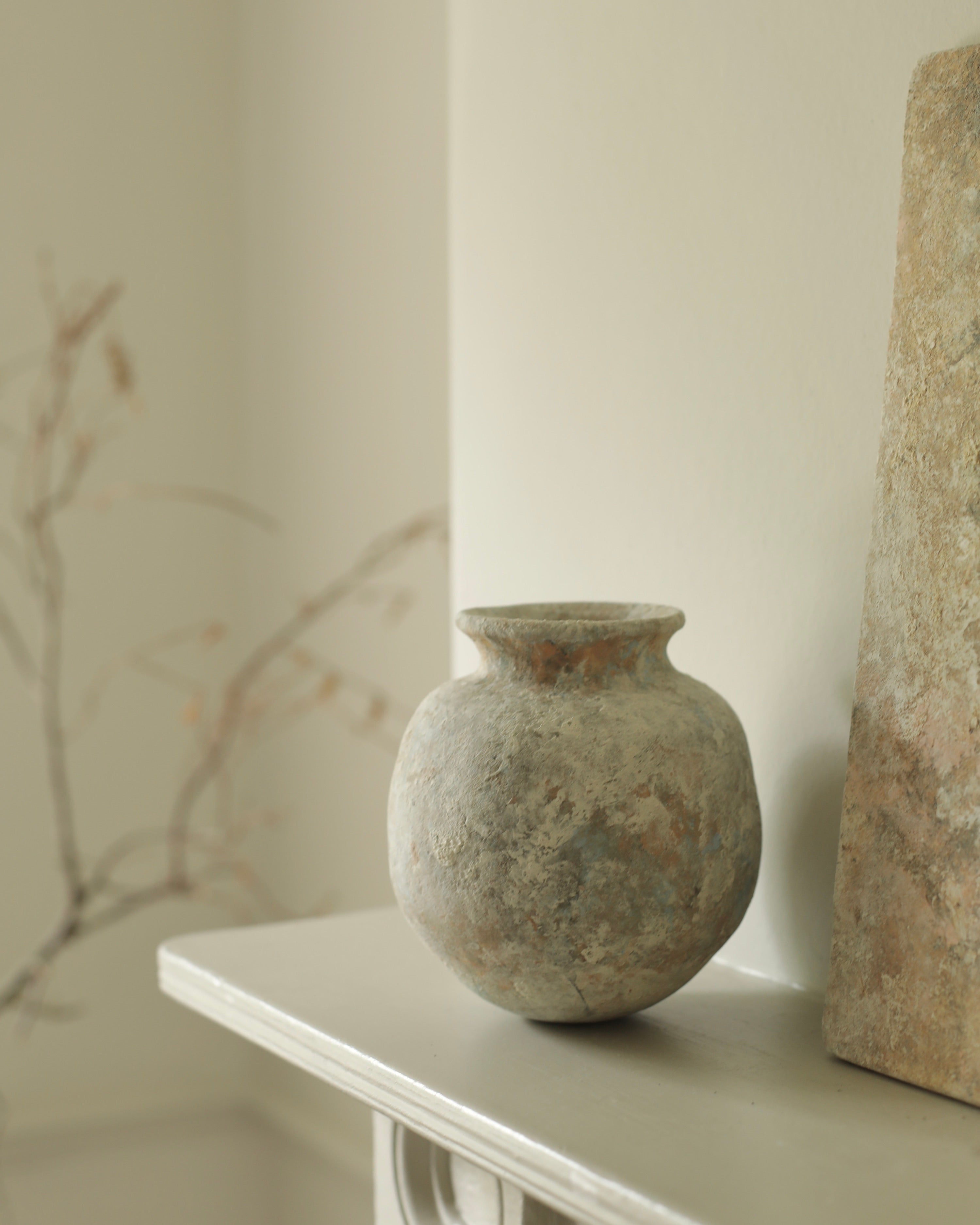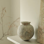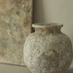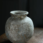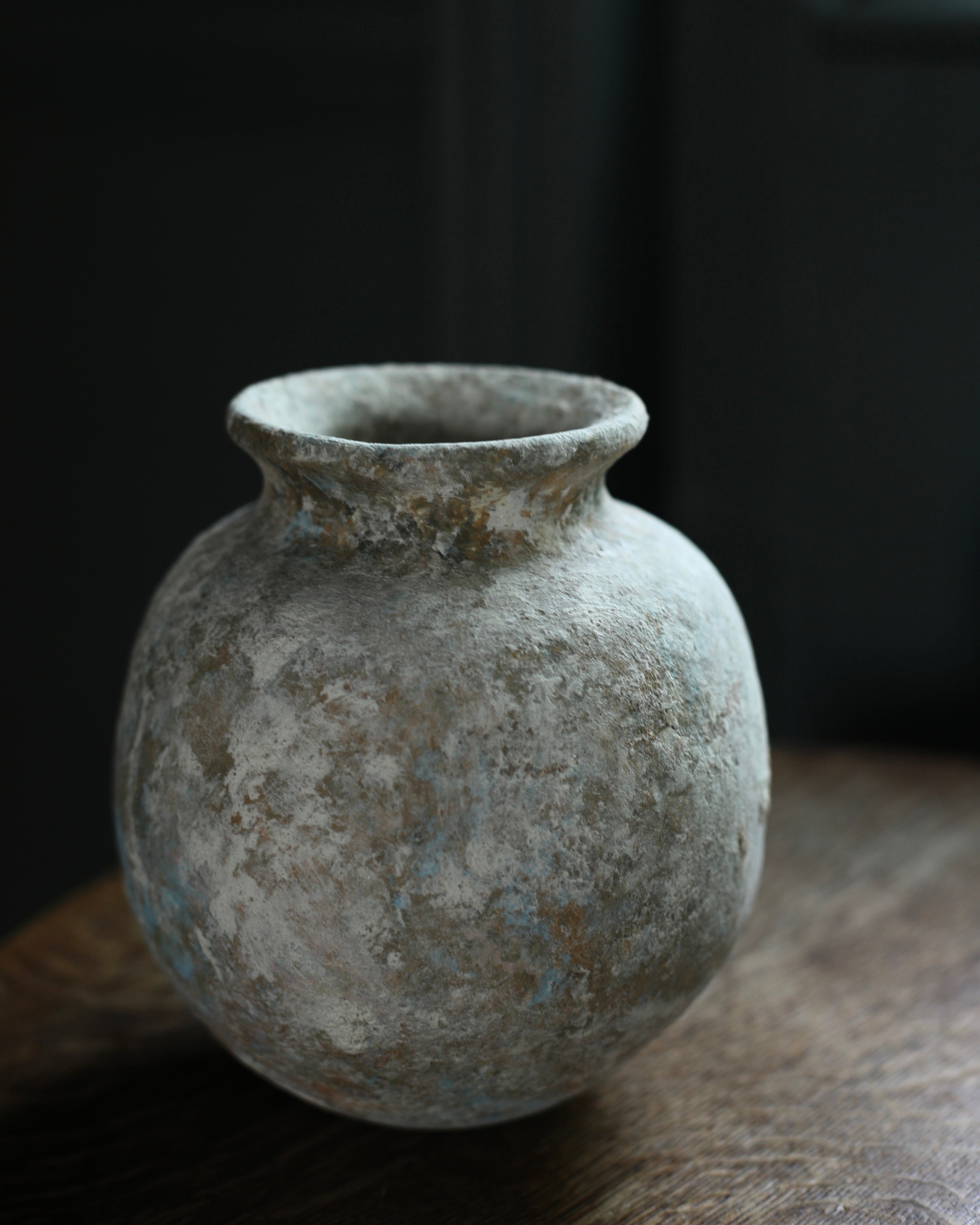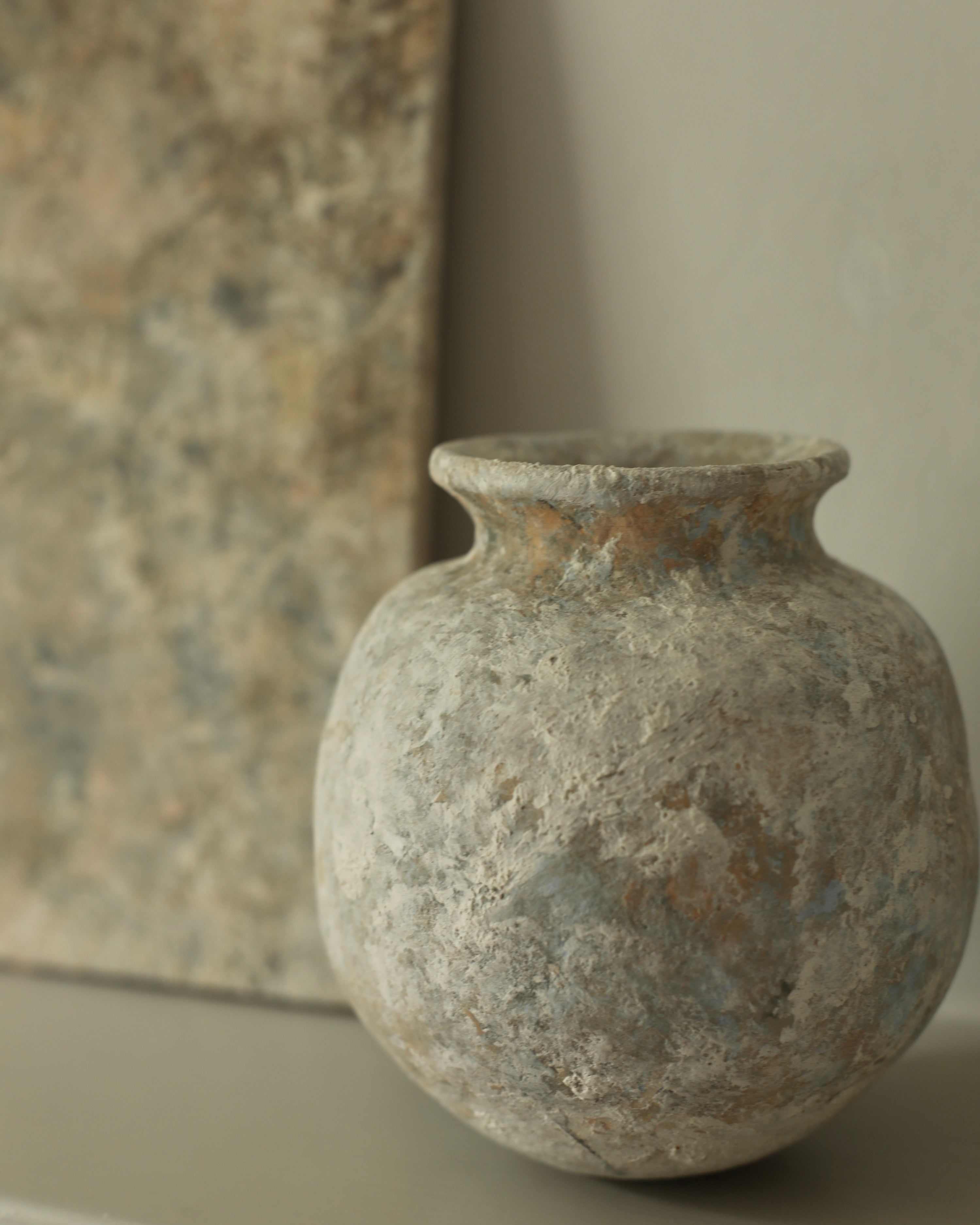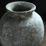 This sculptural vessel features a full, rounded form with a softly textured surface in muted tones with hints of pale blue. Each vessel is finished with a thick, rounded rim that complements the weight and simplicity of the form. Subtle variations in shape and finish reflect the hand-crafted process, giving each vessel a distinct presence, whether displayed individually or as a group.