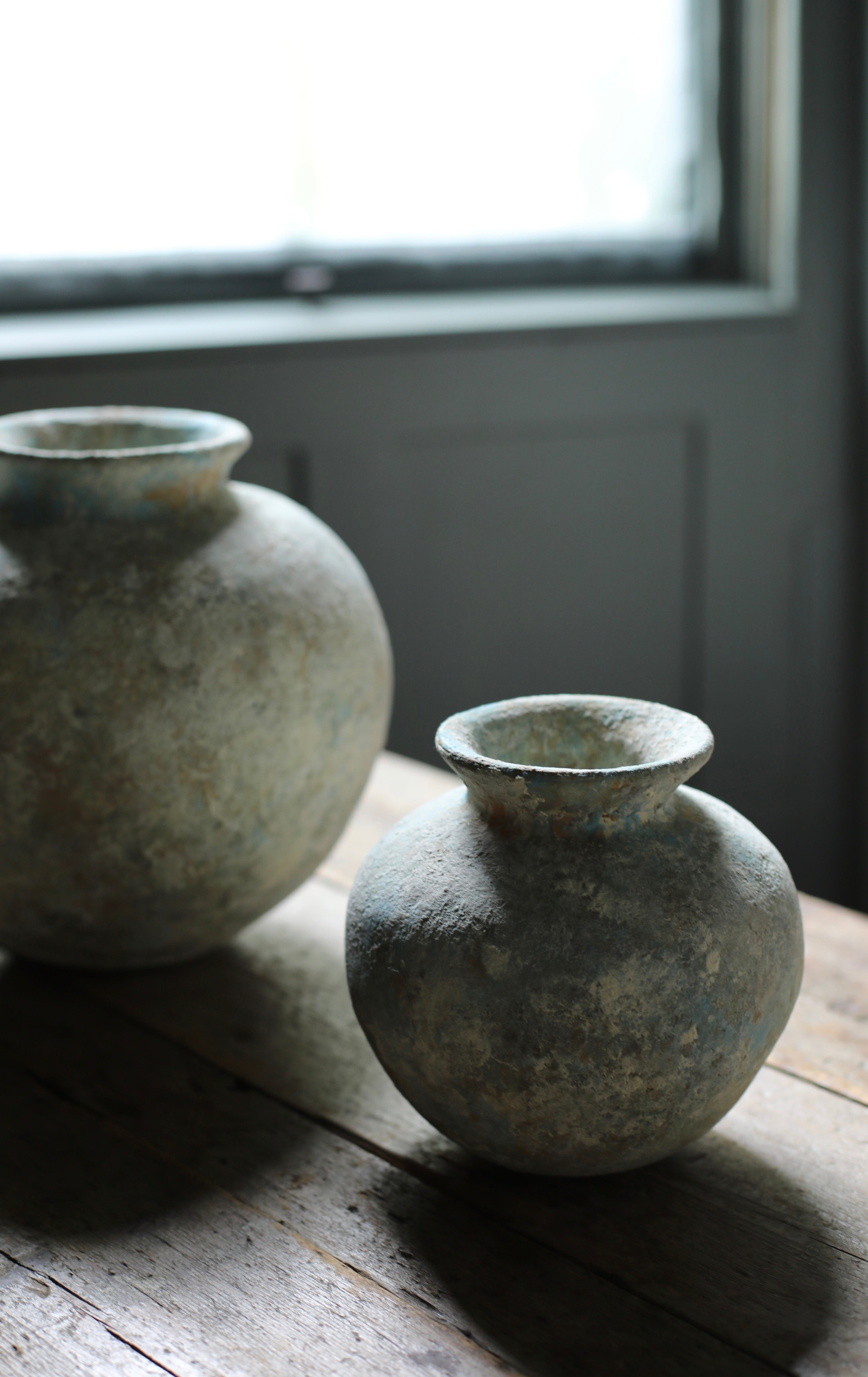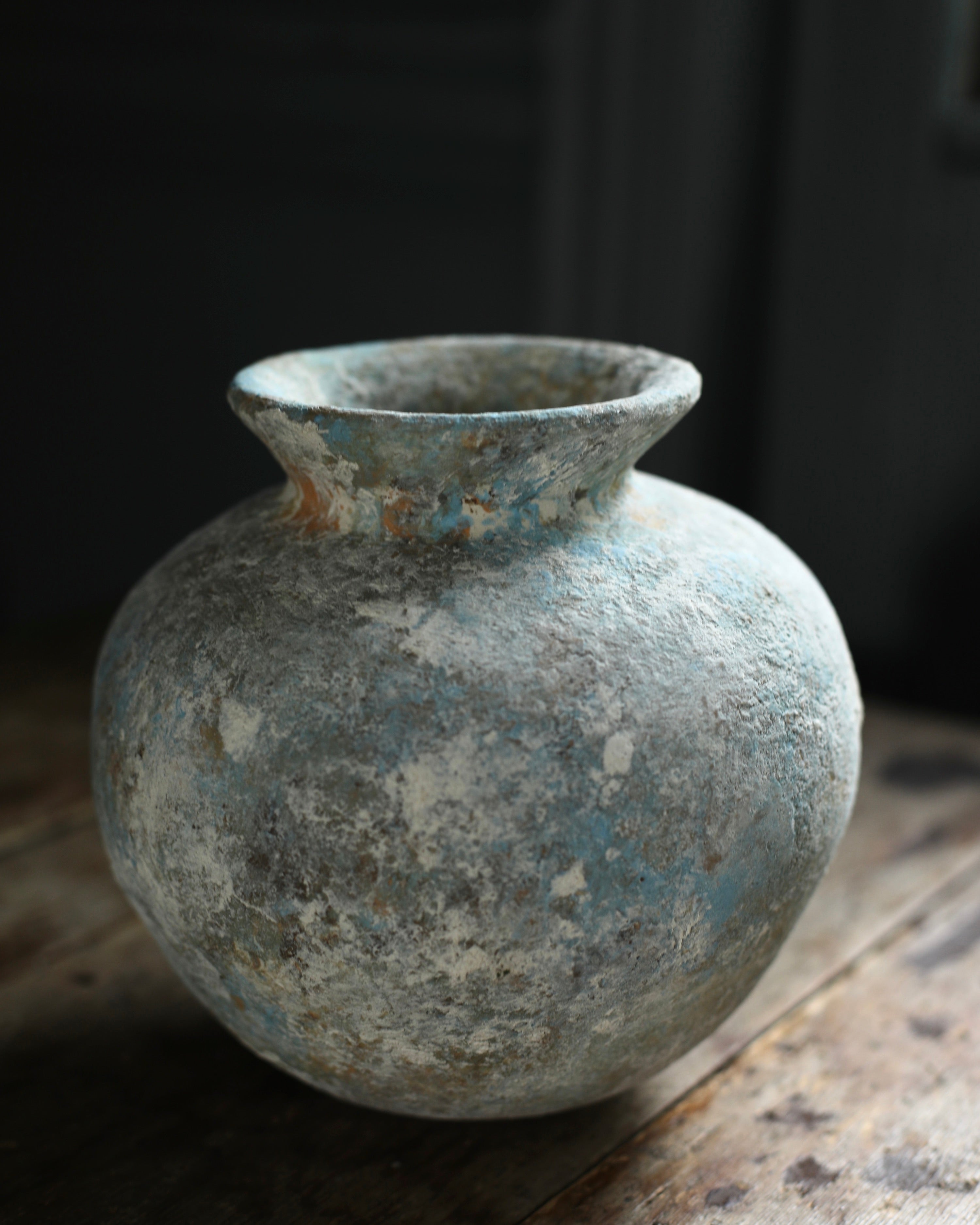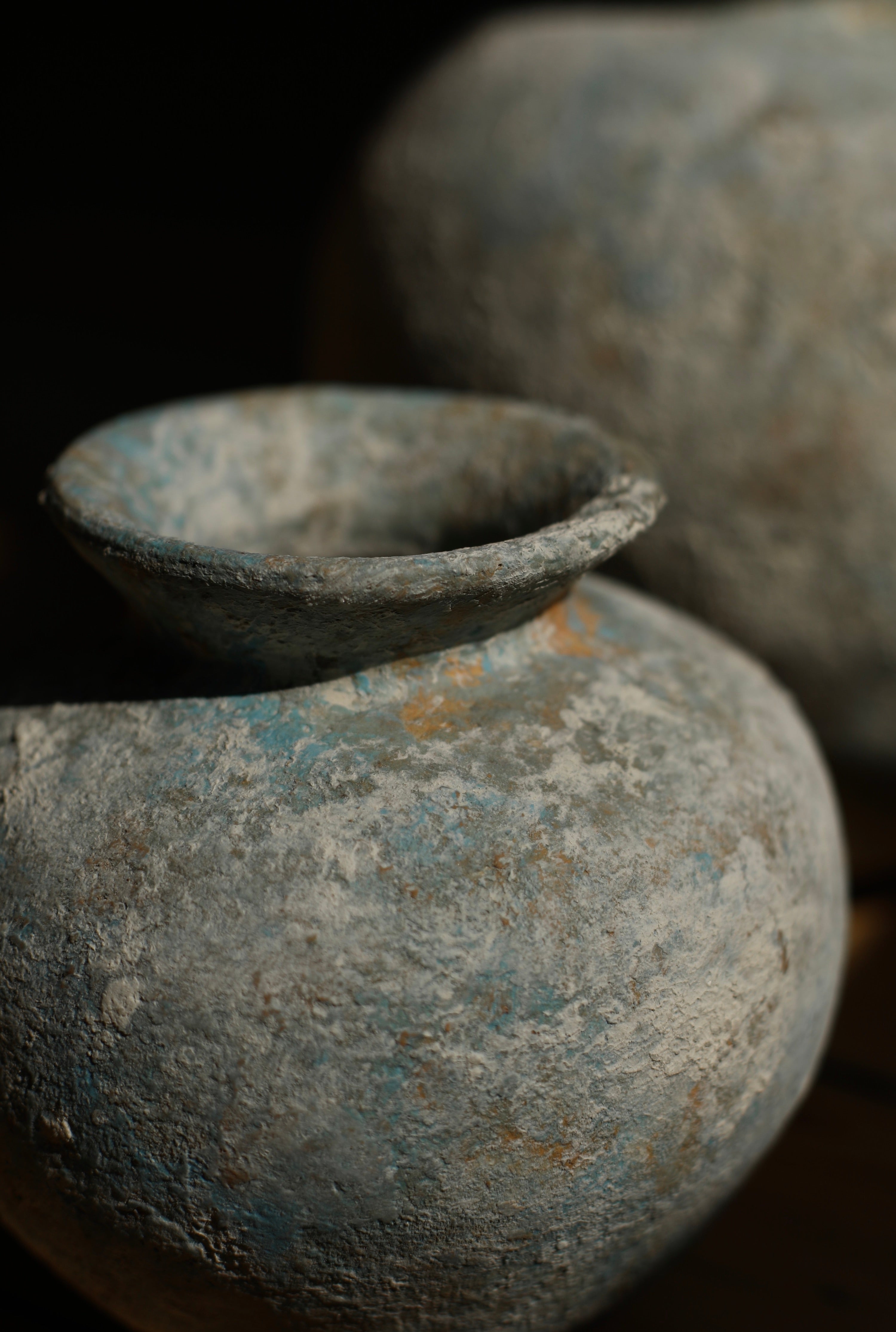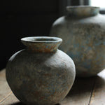 This sculptural vessel features a full, rounded form with a softly textured surface in muted tones with hints of pale blue. Each vessel is finished with a thick, rounded rim that complements the weight and simplicity of the form. Subtle variations in shape and finish reflect the hand-crafted process, giving each vessel a distinct presence, whether displayed individually or as a group.