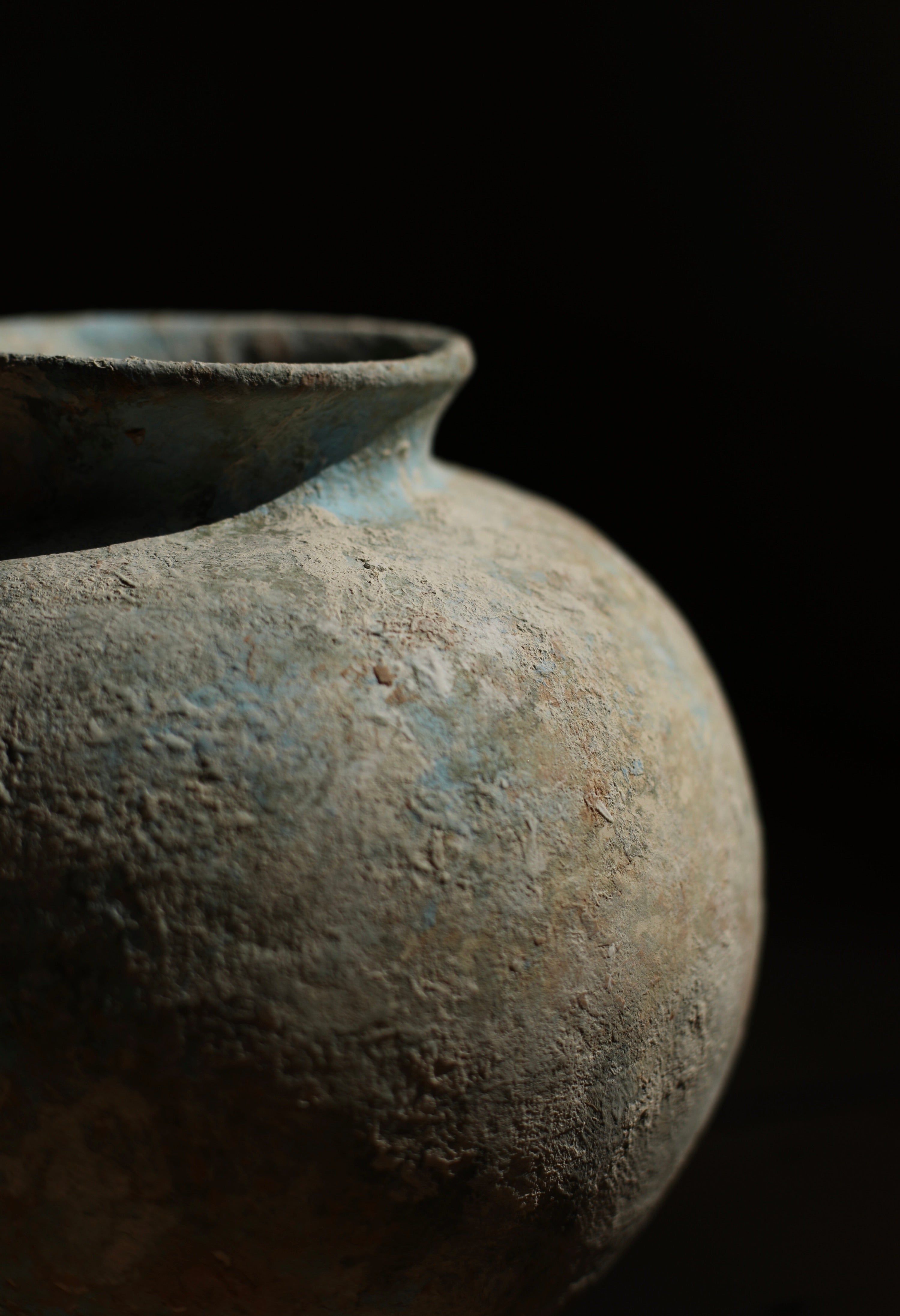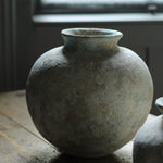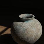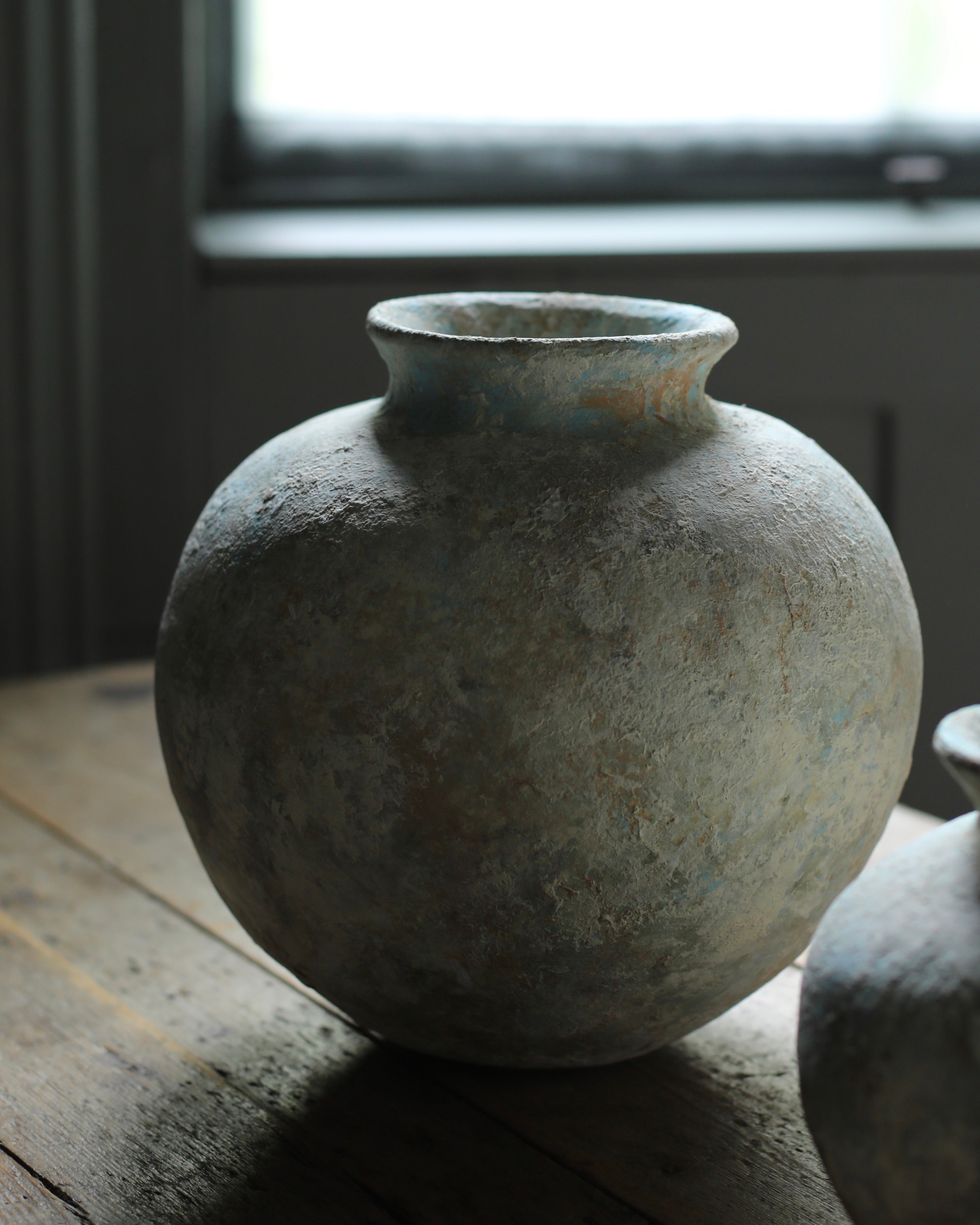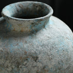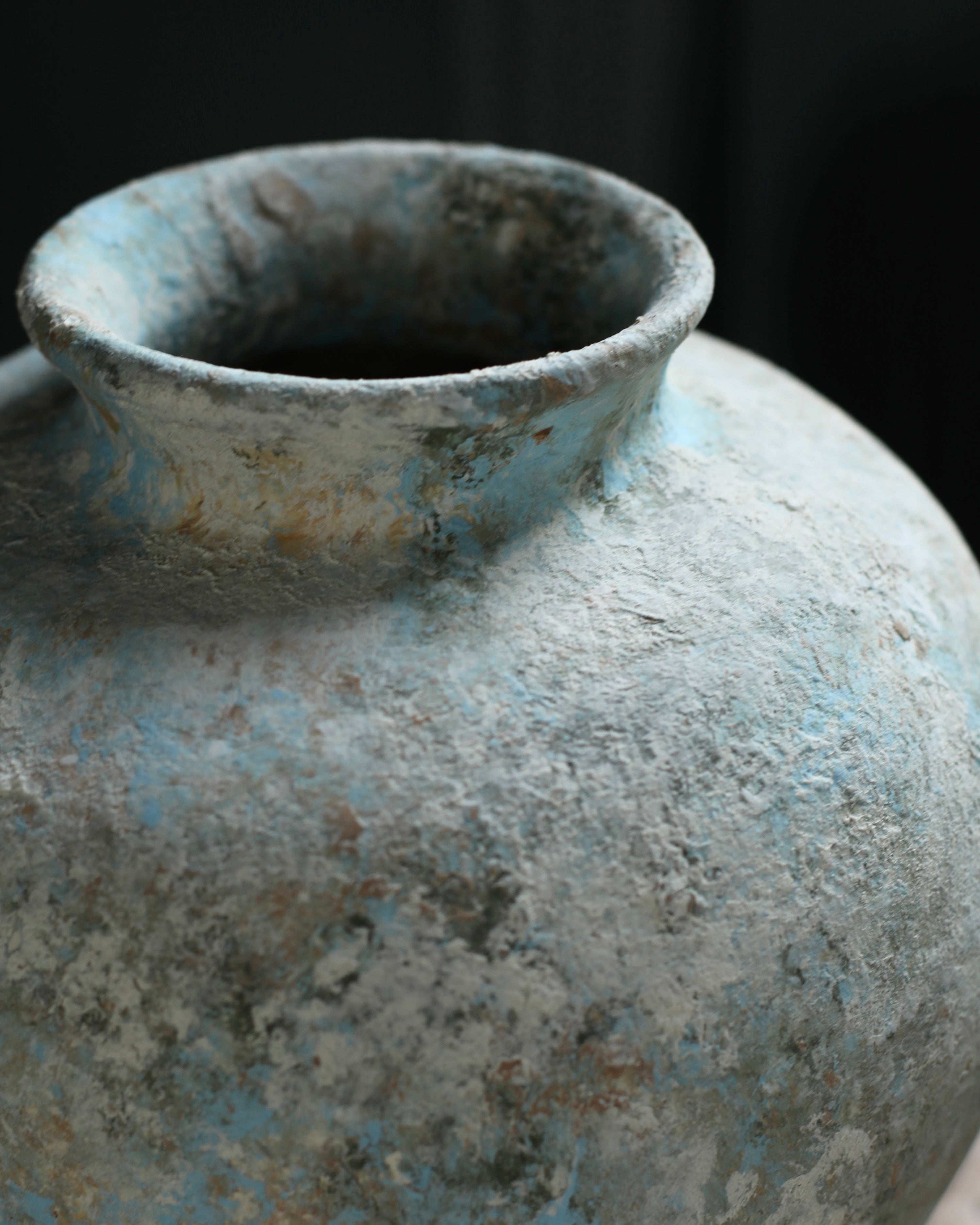 This sculptural vessel features a full, rounded form with a softly textured surface in muted tones with hints of pale blue. Each vessel is finished with a thick, rounded rim that complements the weight and simplicity of the form. Subtle variations in shape and finish reflect the hand-crafted process, giving each vessel a distinct presence, whether displayed individually or as a group.