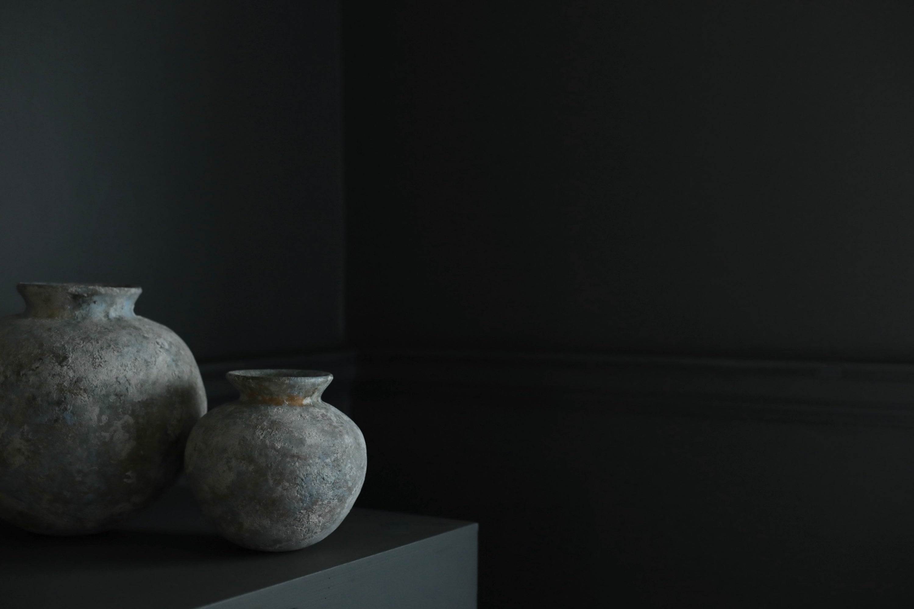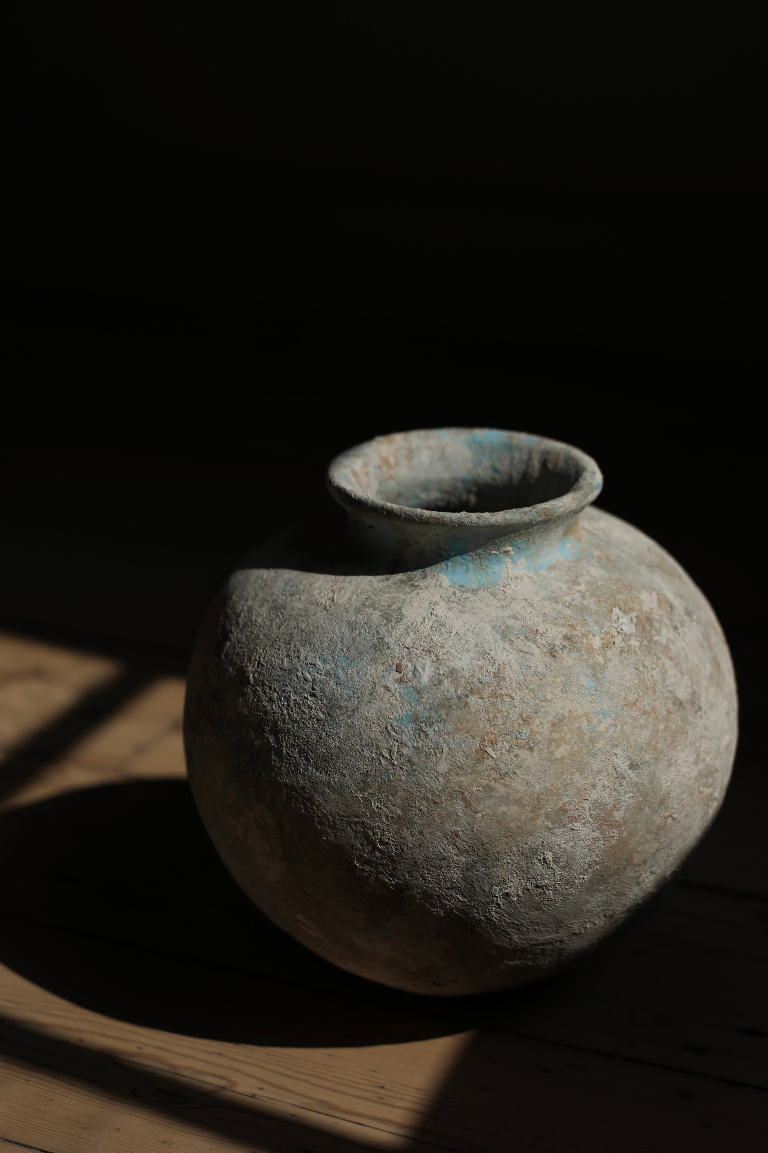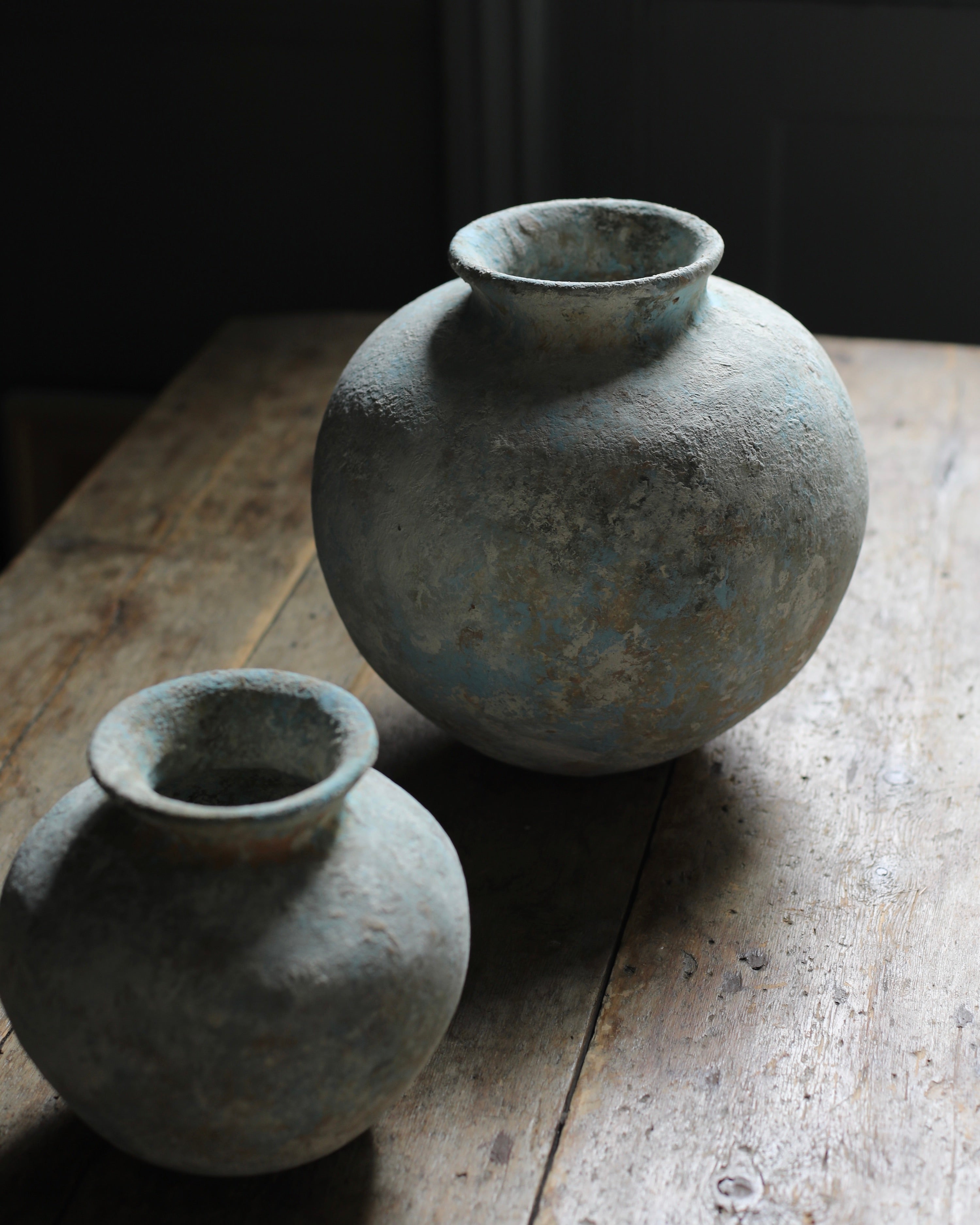 This sculptural vessel features a full, rounded form with a softly textured surface in muted tones with hints of pale blue. Each vessel is finished with a thick, rounded rim that complements the weight and simplicity of the form. Subtle variations in shape and finish reflect the hand-crafted process, giving each vessel a distinct presence, whether displayed individually or as a group.