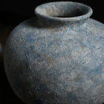 This sculptural vessel features a full, rounded form with a softly textured surface in muted tones with hints of pale blue. Each vessel is finished with a thick, rounded rim that complements the weight and simplicity of the form. Subtle variations in shape and finish reflect the hand-crafted process, giving each vessel a distinct presence, whether displayed individually or as a group.