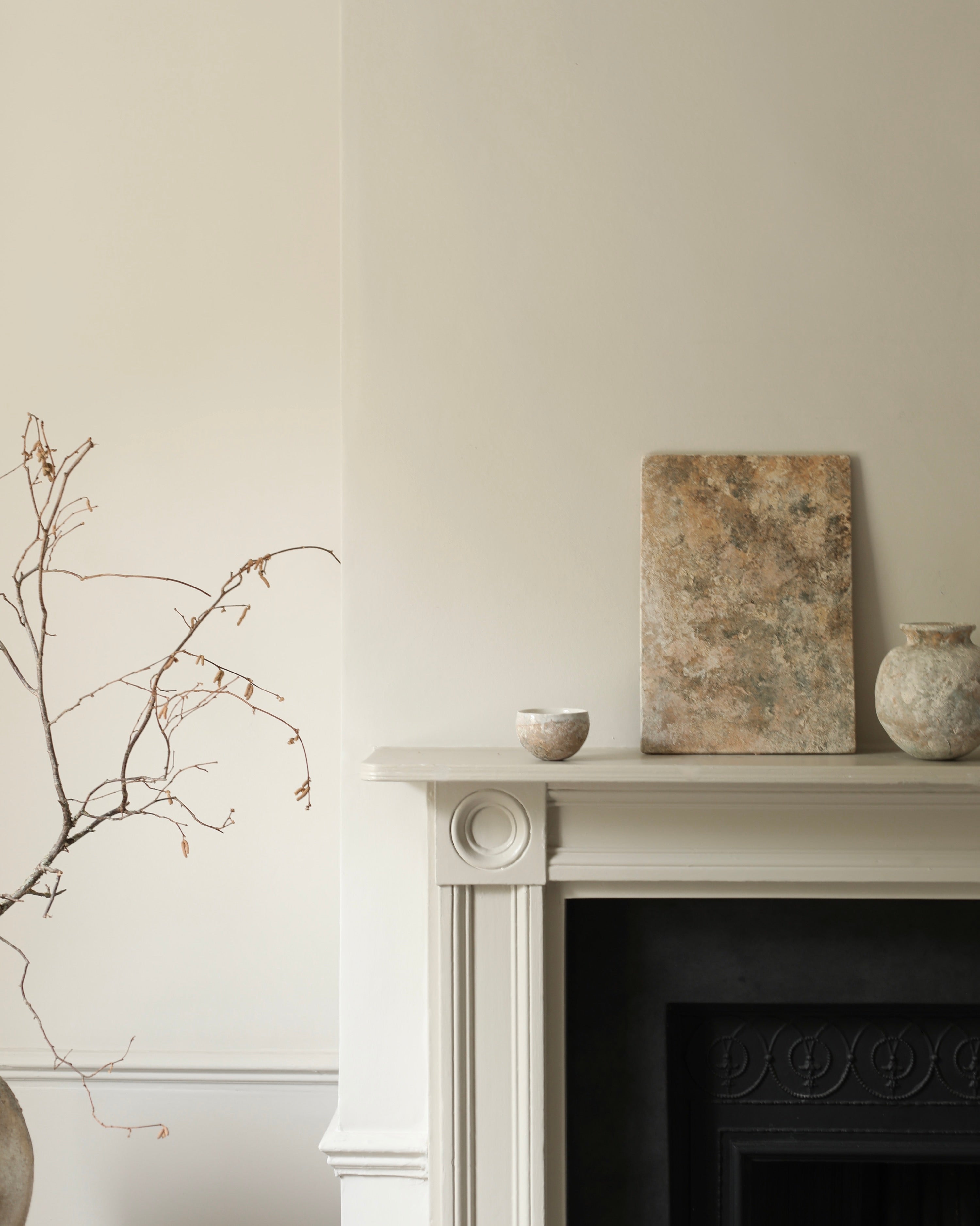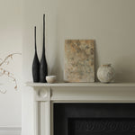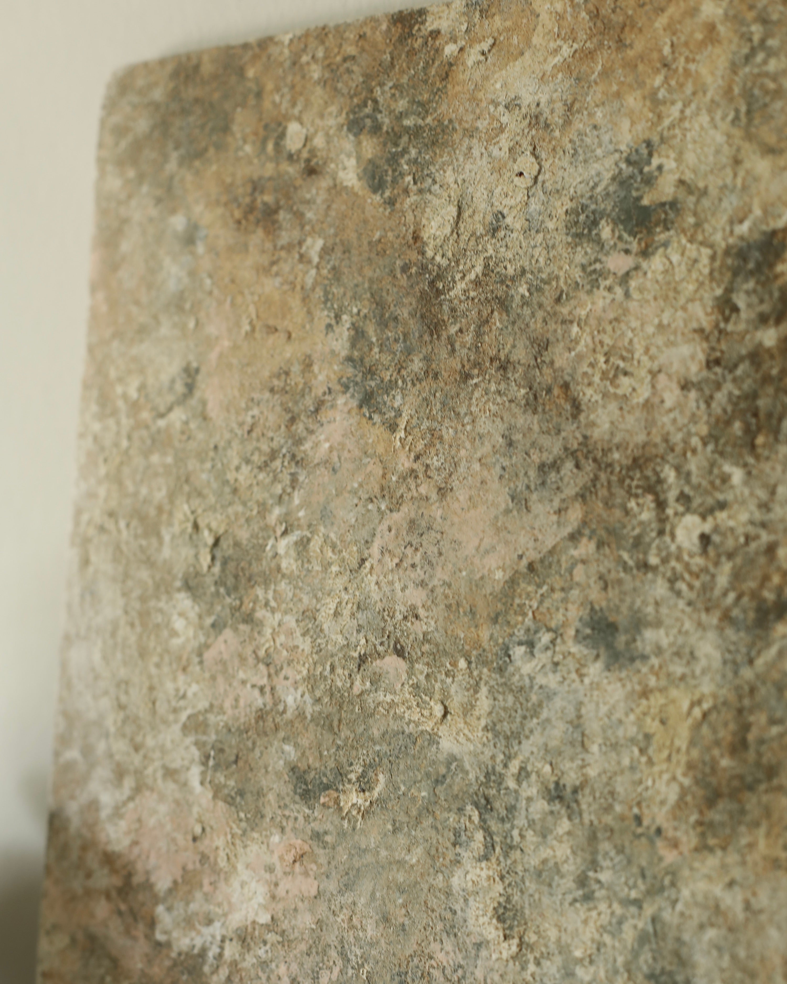 This flat porcelain piece features earthy textures and natural tones throughout. Its irregular surface and subtle edges emphasise the natural qualities of the porcelain, making it a versatile background for display or a striking piece on its own.