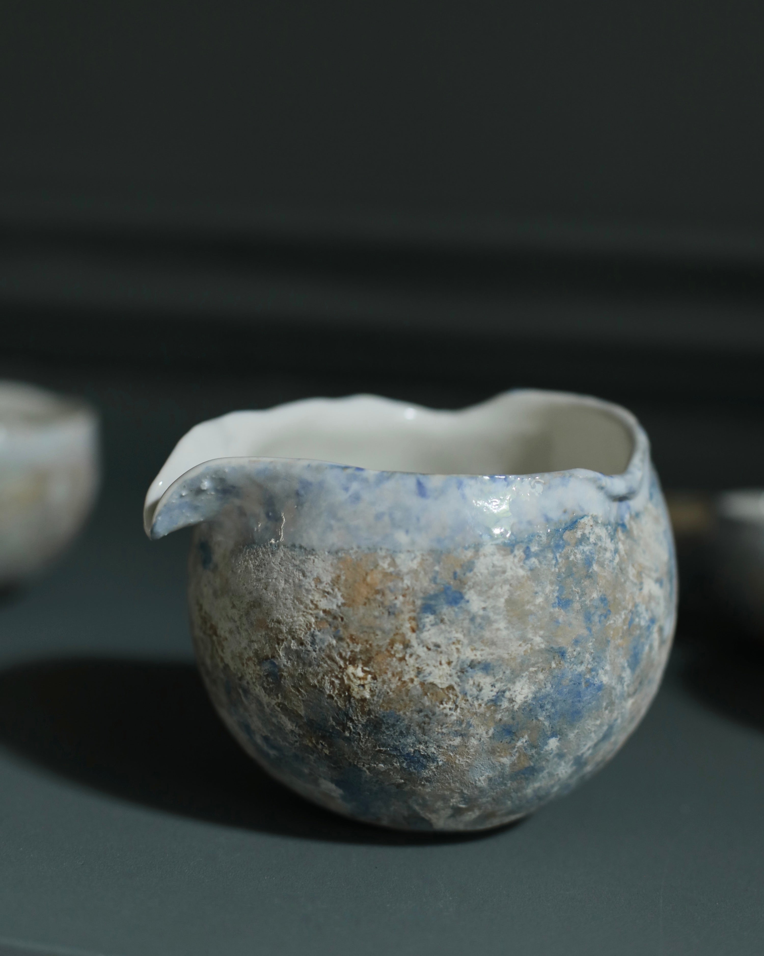 This porcelain katakuchi features a soft white glaze along the interior and rim, set against earthy tones and a gently textured surface. The spouted lip, a defining feature of this traditional Japanese form, adds a practical yet understated detail. Originally used for serving sake, the katakuchi now serves a variety of purposes, from pouring liquids to presenting small dishes with elegance.