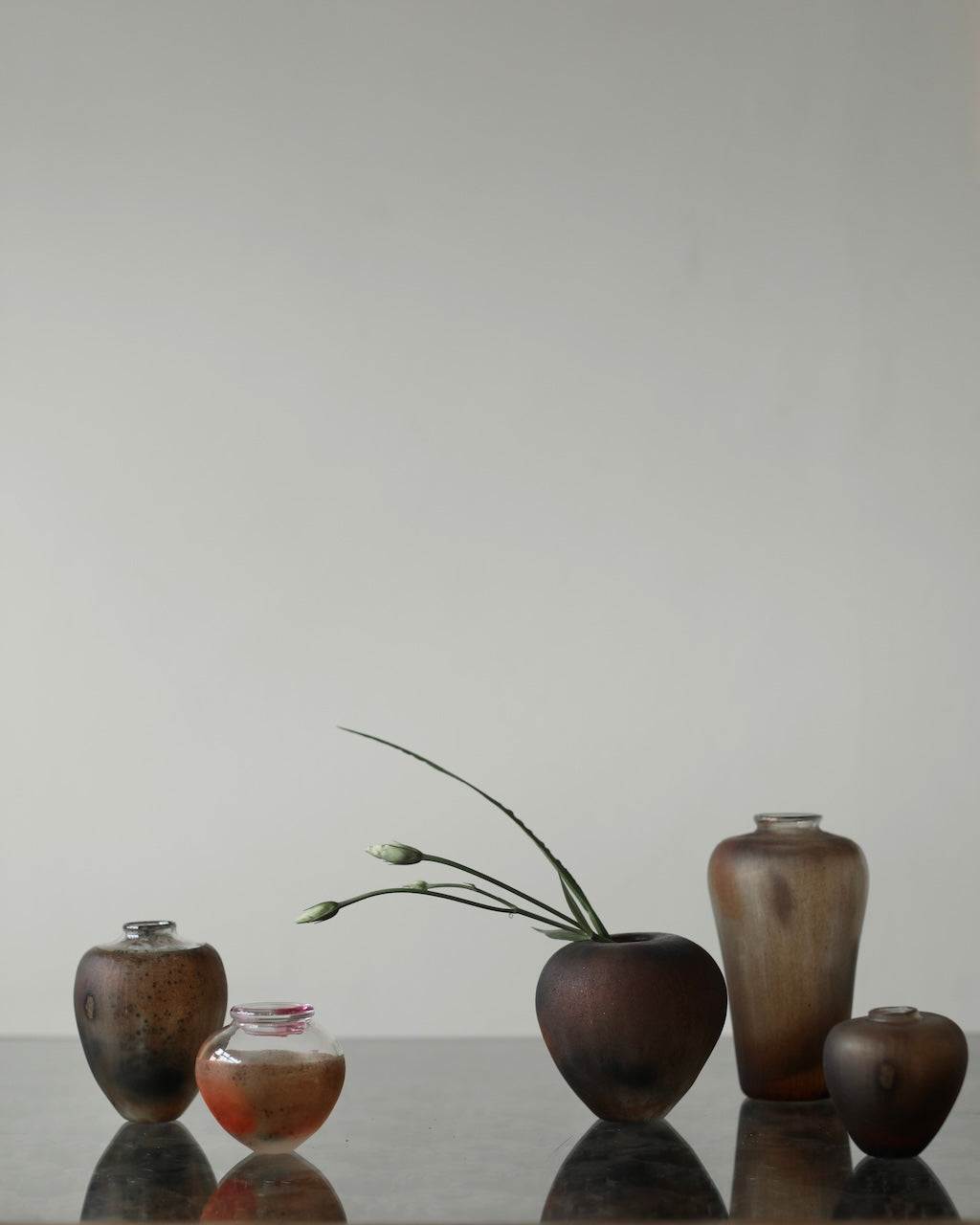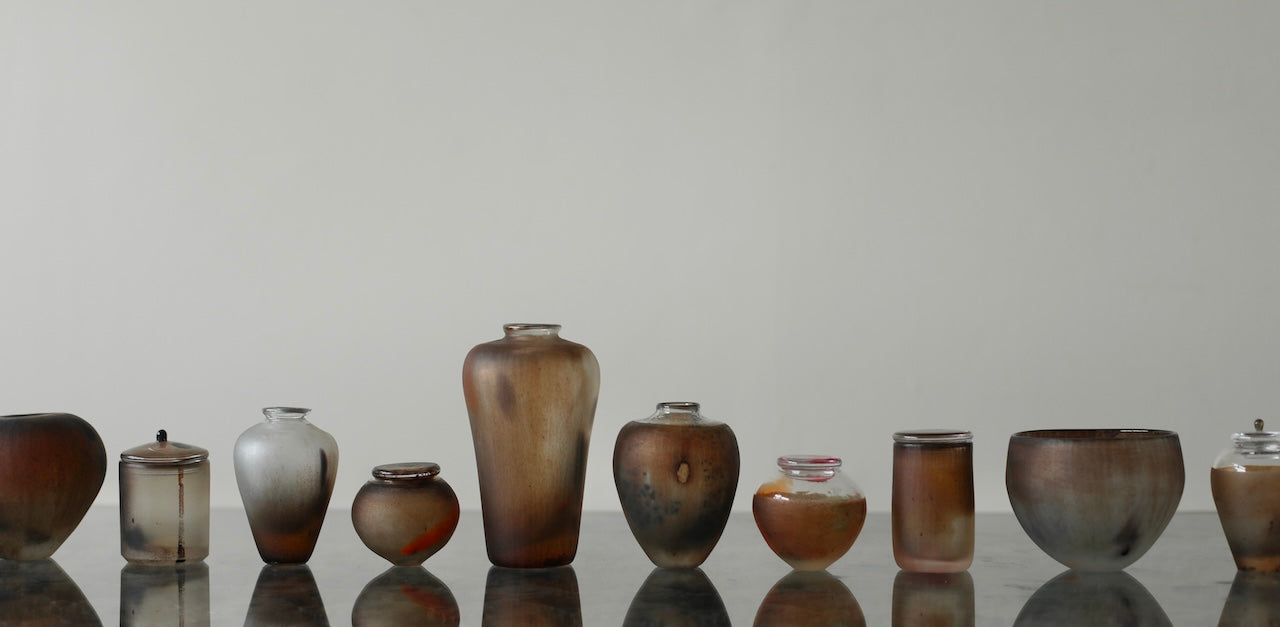 Aki Sakaida’s collection embraces variation, allowing each piece to retain its own distinct form. Precise, quietly balanced silhouettes anchor the work, while colour shifts organically through the glass in both saturated and subtle tones. Bubbles and flecks are suspended within the material, creating an inner landscape that changes with light and movement. Smooth, glossy interiors contrast with softly textured, giving each piece a sense of quiet tension and individuality.