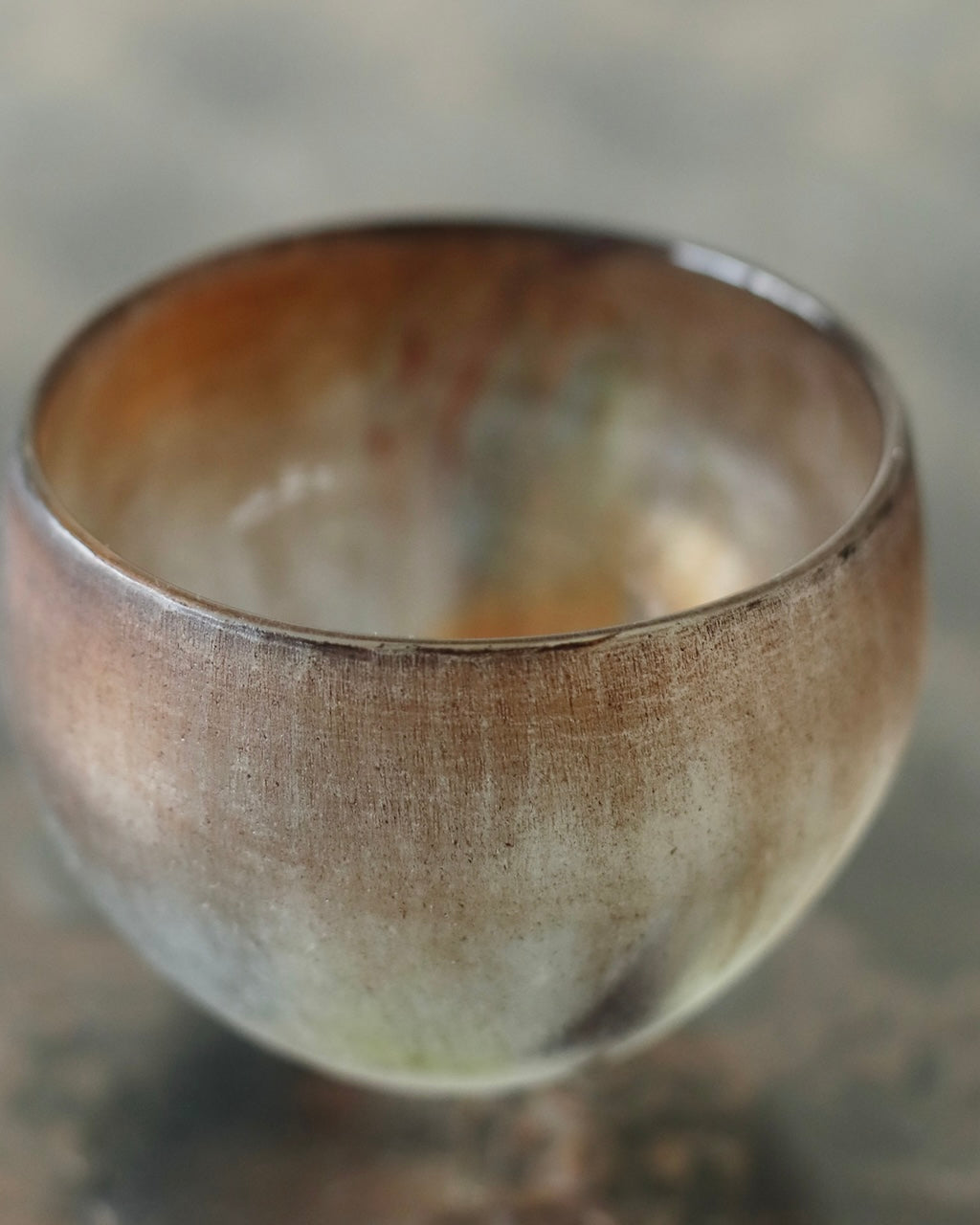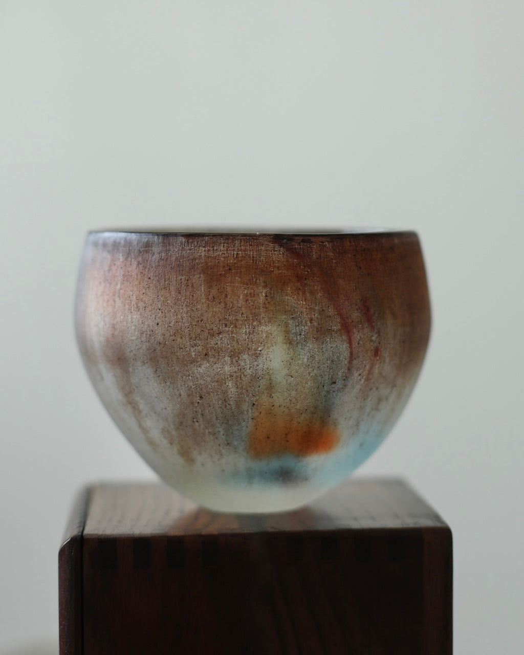 Aki Sakaida’s collection embraces variation, allowing each piece to retain its own distinct form. Precise, quietly balanced silhouettes anchor the work, while colour shifts organically through the glass in both saturated and subtle tones. Bubbles and flecks are suspended within the material, creating an inner landscape that changes with light and movement. Smooth, glossy interiors contrast with softly textured, giving each piece a sense of quiet tension and individuality.