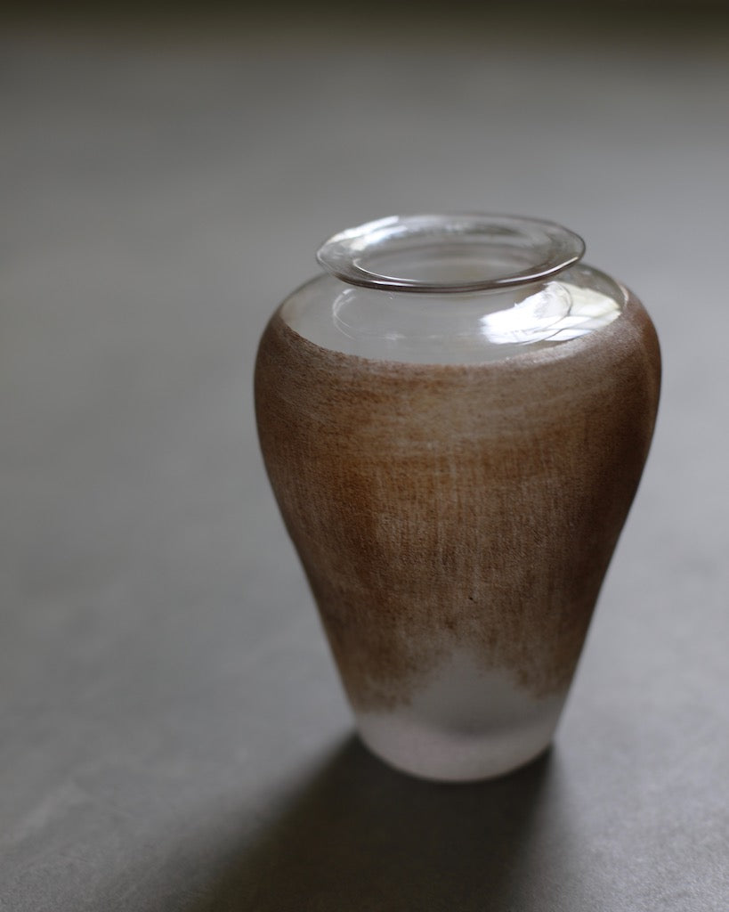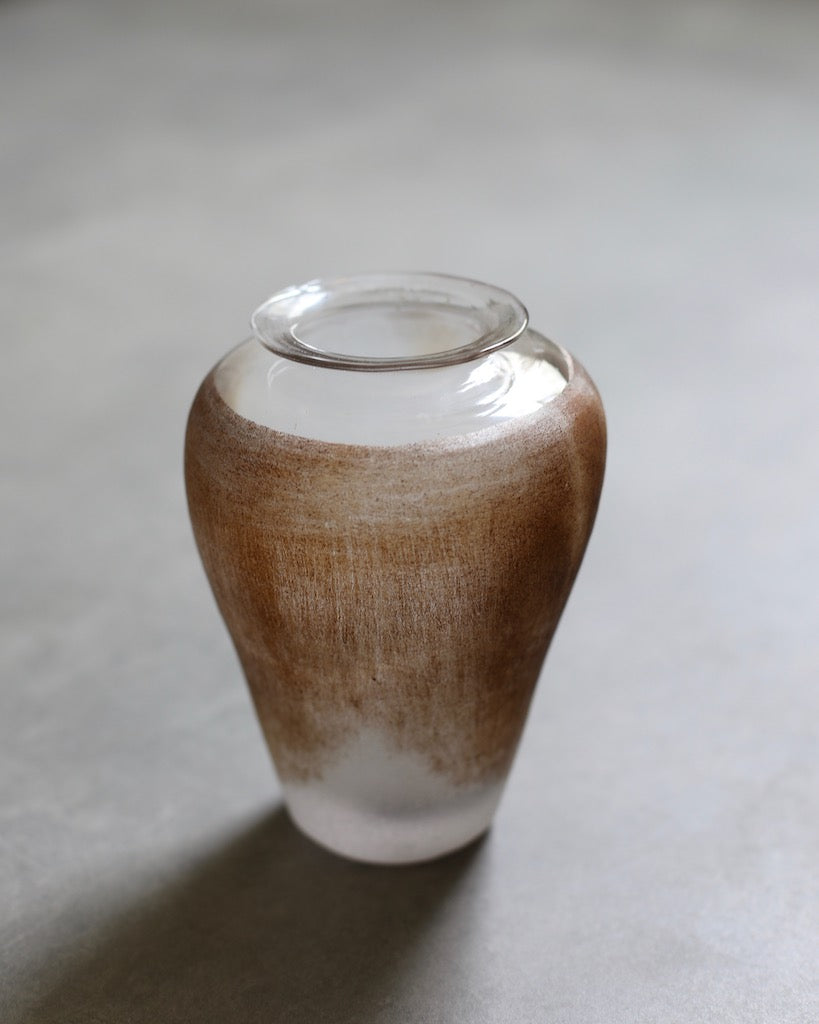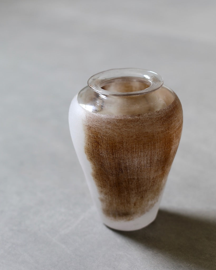 This vase displays a beautifully crafted design, curving at the top and narrowing slightly towards the base. The lowest portion is highlighted in a white tone, illuminating the surface on which it rests upon. The vase emits a luminous glow by playing with varying levels of opacity and transparency and has a frosted surface with a subtle glisten. The brown hue applied through the burning of wax blends seamlessly with the accompanying white tones, with striking strokes of deep brown forming patterns on the surface. The colours and tones of the vase reflect nature's chromatic palette, highlighting its edges and curves through the shifting in hues. The shape and colour harmoniously flow, creating a fluidity of form and poetic expression.