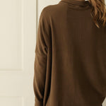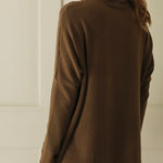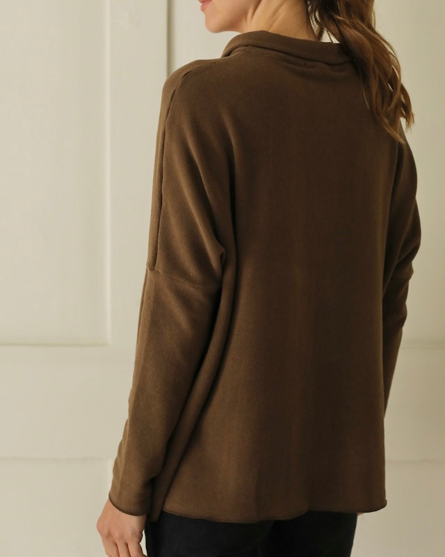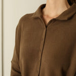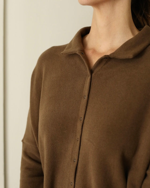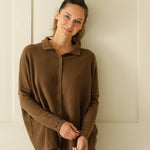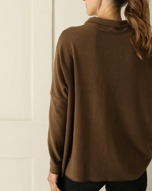 Dropped shoulders and long, slim sleeves create a soft contrast to the boxy, relaxed fit, allowing the piece to drape with ease while maintaining a polished feel. The chestnut shade is a rich, earthy brown with warm undertones, a grounded feel to this versatile piece.