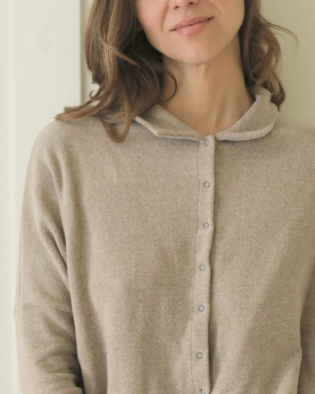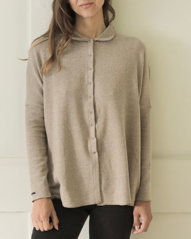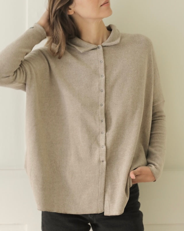 The Polo Aperta is a modern winter essential with a subtly structured silhouette. Crafted with a short standing collar and discreet snap button fastening, it offers a clean, minimal look with just the right amount of detail.
