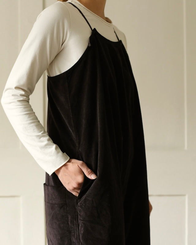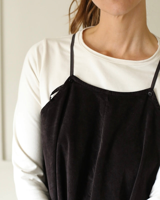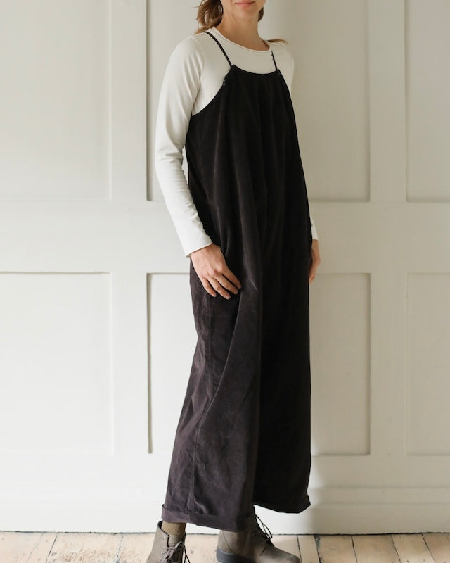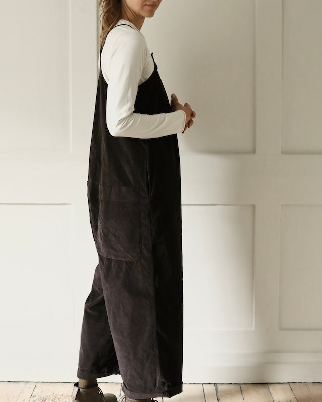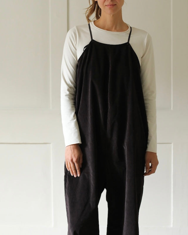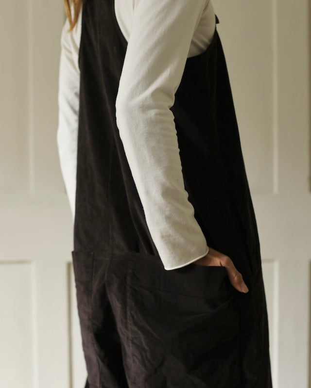 Modern and bold, the Salopette V is a wide-leg jumpsuit crafted from a lightweight cotton velvet with a soft, subtly textured finish and gentle stretch. The relaxed silhouette offers both ease and movement.