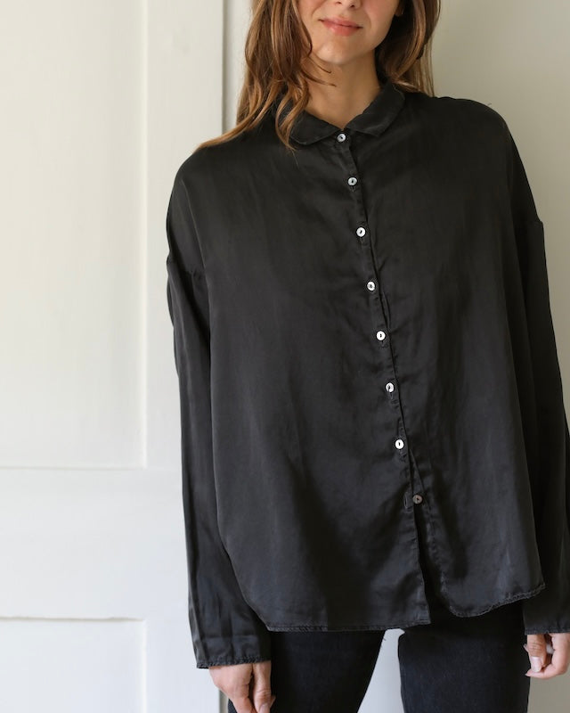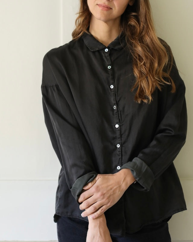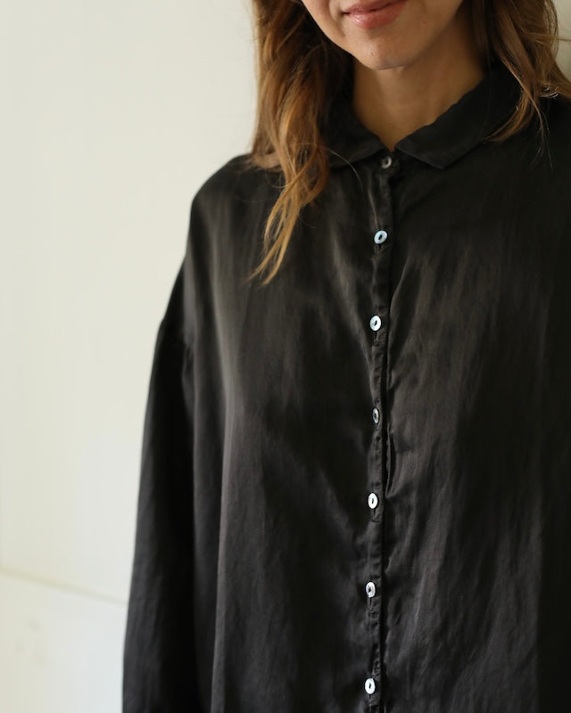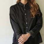 Designed with subtle drop shoulders and a relaxed silhouette, it drapes gracefully for all-day comfort. A row of pearlescent buttons adds a delicate touch. Finished with fine, minimalist hems at the cuffs, this piece reimagines the everyday shirt with understated distinction.