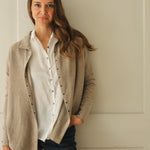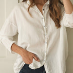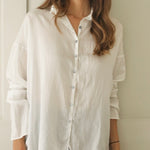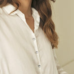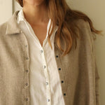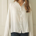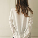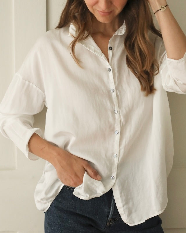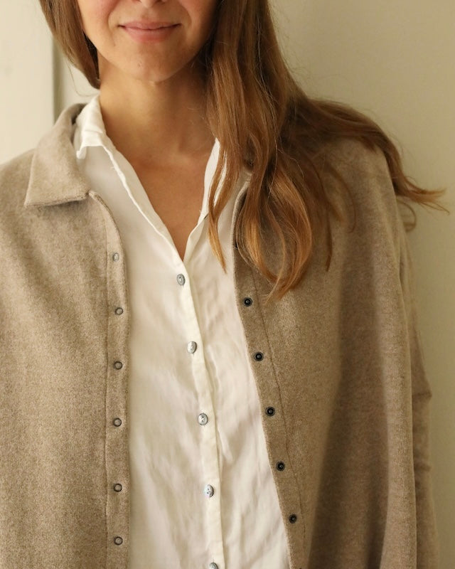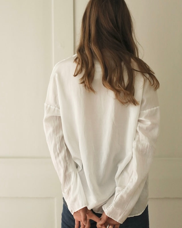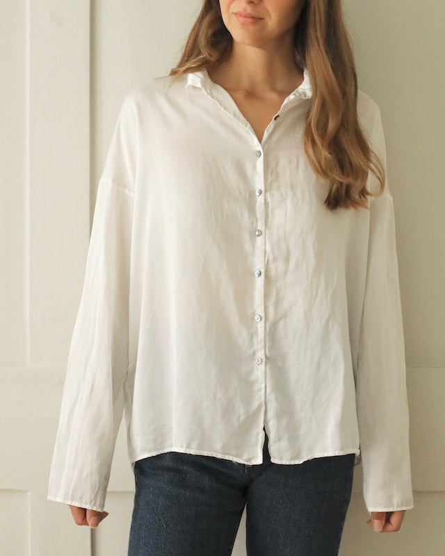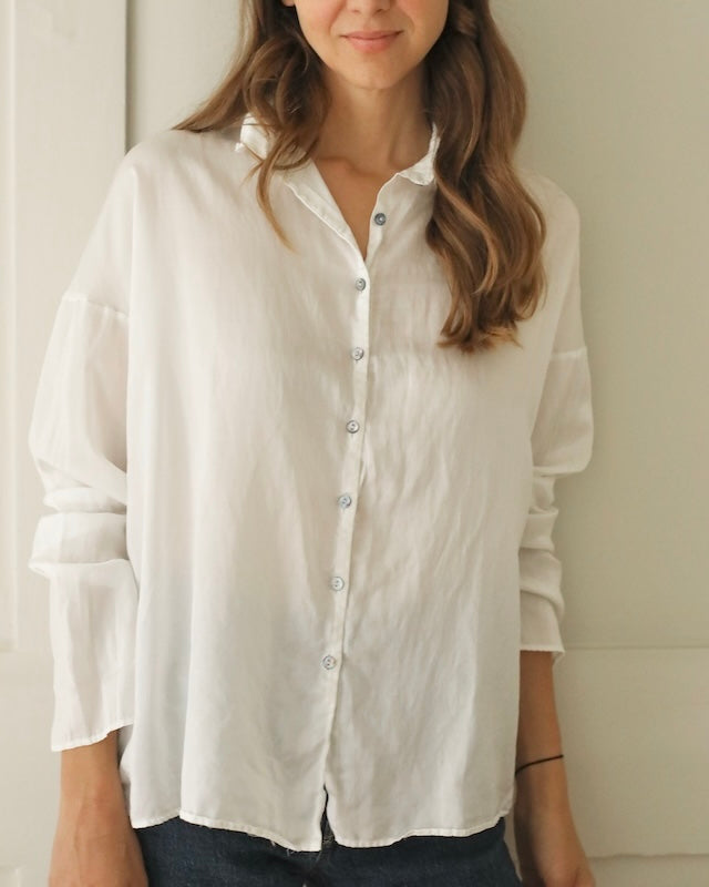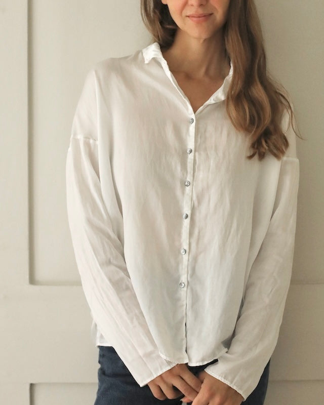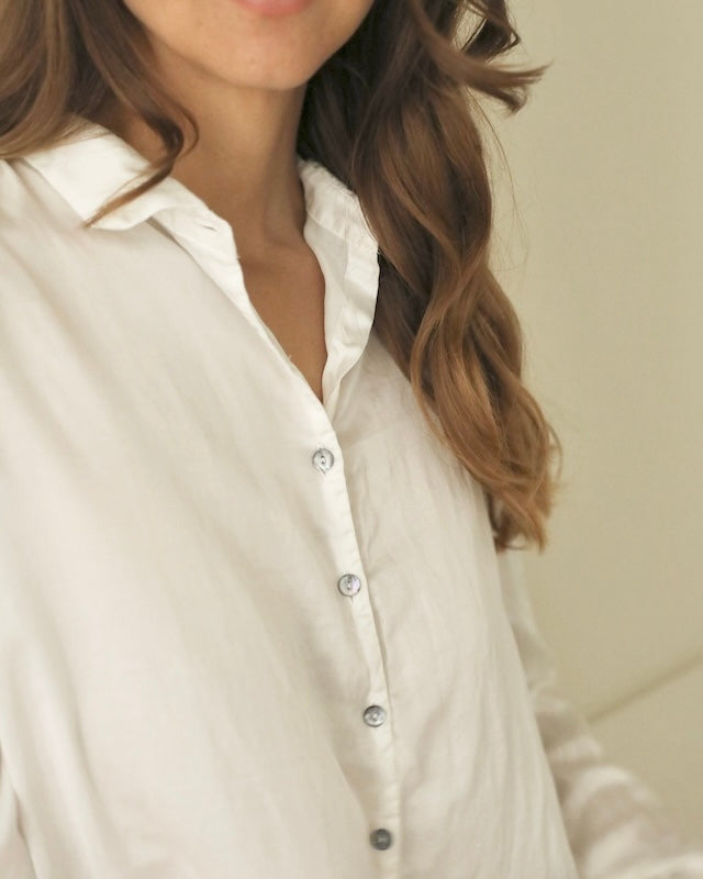 Designed with subtle drop shoulders and a relaxed silhouette, it drapes gracefully for all-day comfort. A row of pearlescent buttons adds a delicate touch. Finished with fine, minimalist hems at the cuffs, this piece reimagines the everyday shirt with understated distinction.