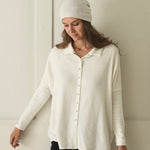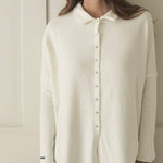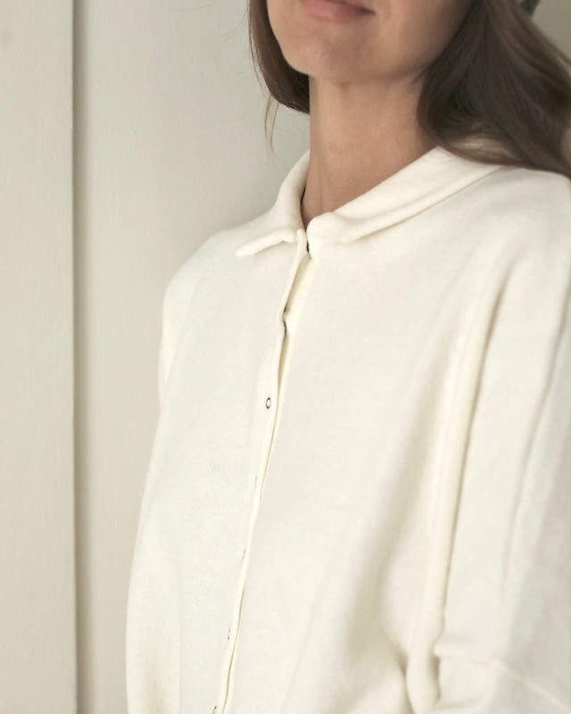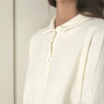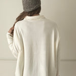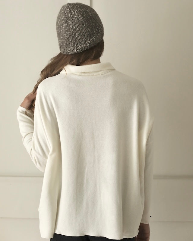 Dropped shoulders and long, slim sleeves create a soft contrast to the boxy, relaxed fit, allowing the piece to drape with ease while maintaining a polished feel. The milk shade is a soft, creamy off-white with warm undertones, offering a fresh and natural alternative to classic neutrals.